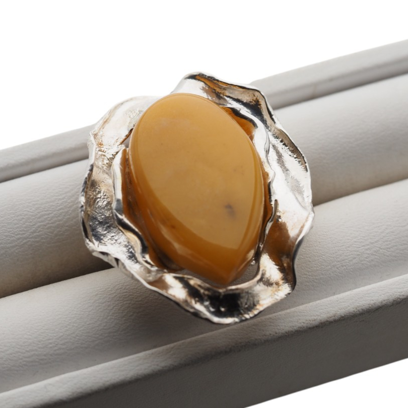 Pierścionek ręcznie wykonany z naturalnym bursztynem bałtyckim w unikalnej oprawie ze srebra próby 925.