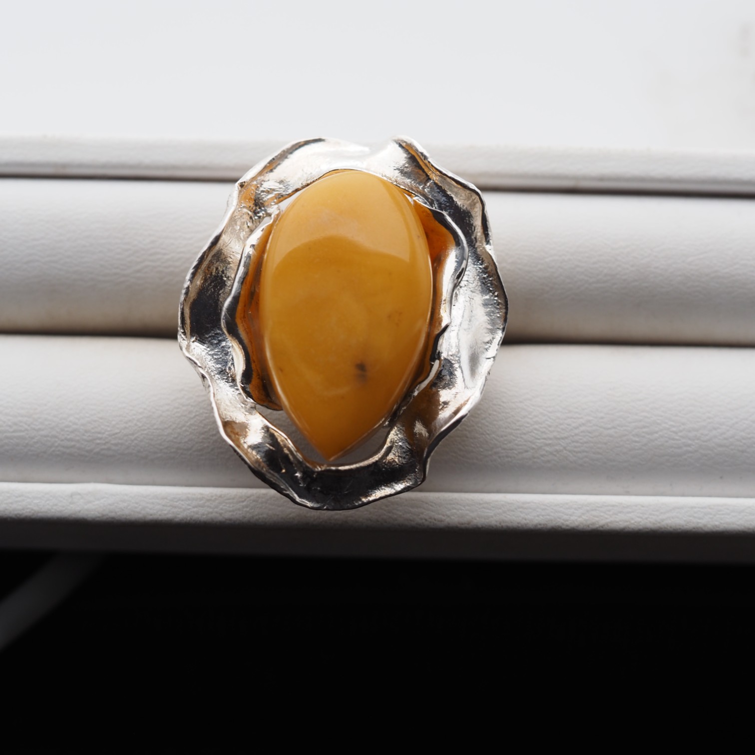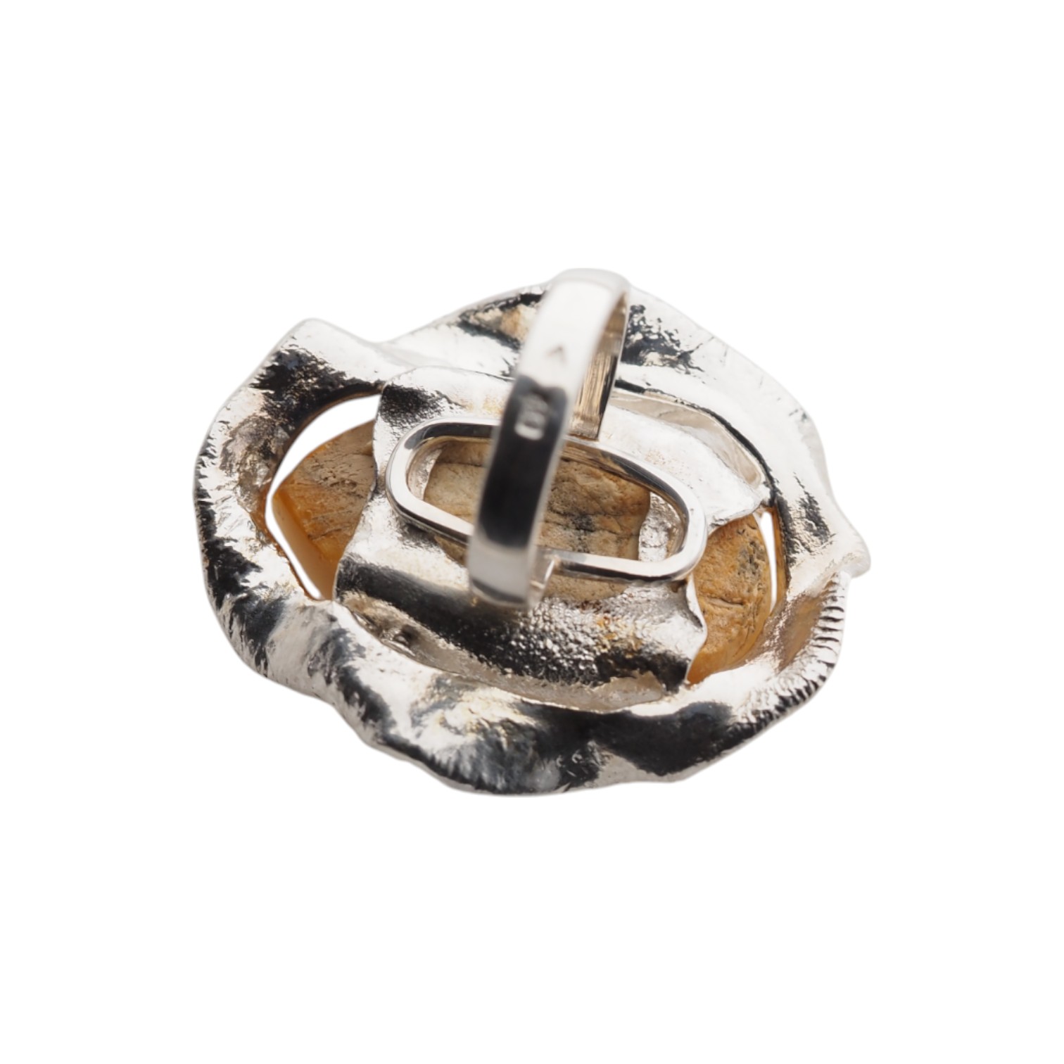 Bursztyn o klasycznym mleczno-karmelowym odcieniu osadzony w nieregularnej, dekoracyjnej oprawie przypominającej płynny metal.