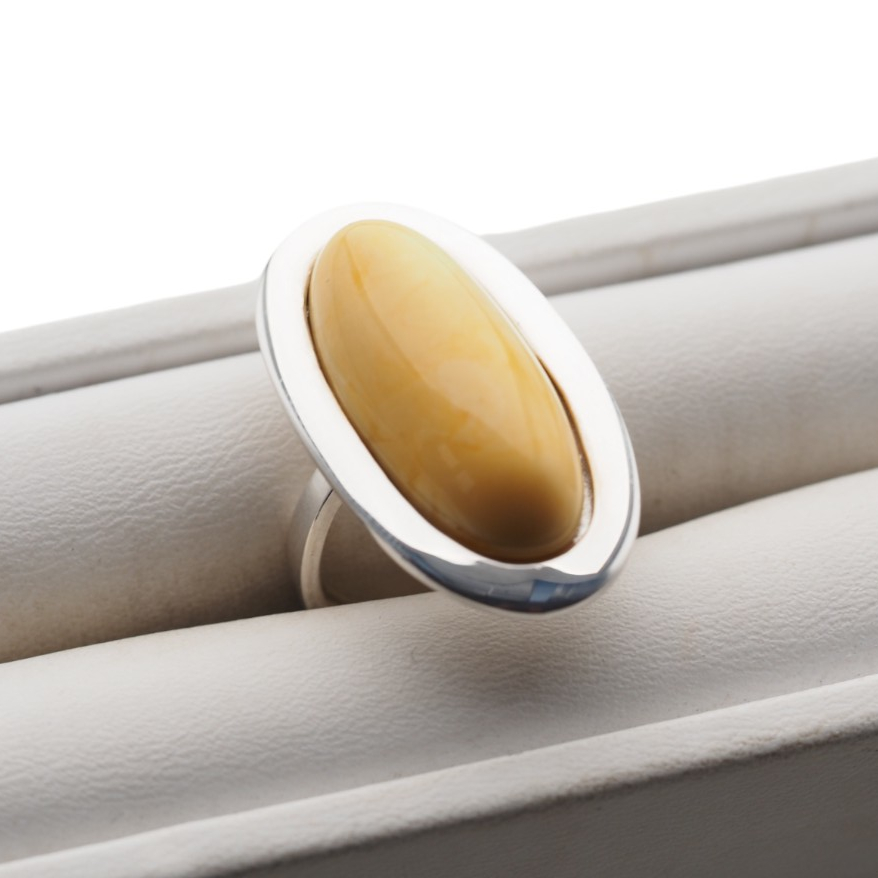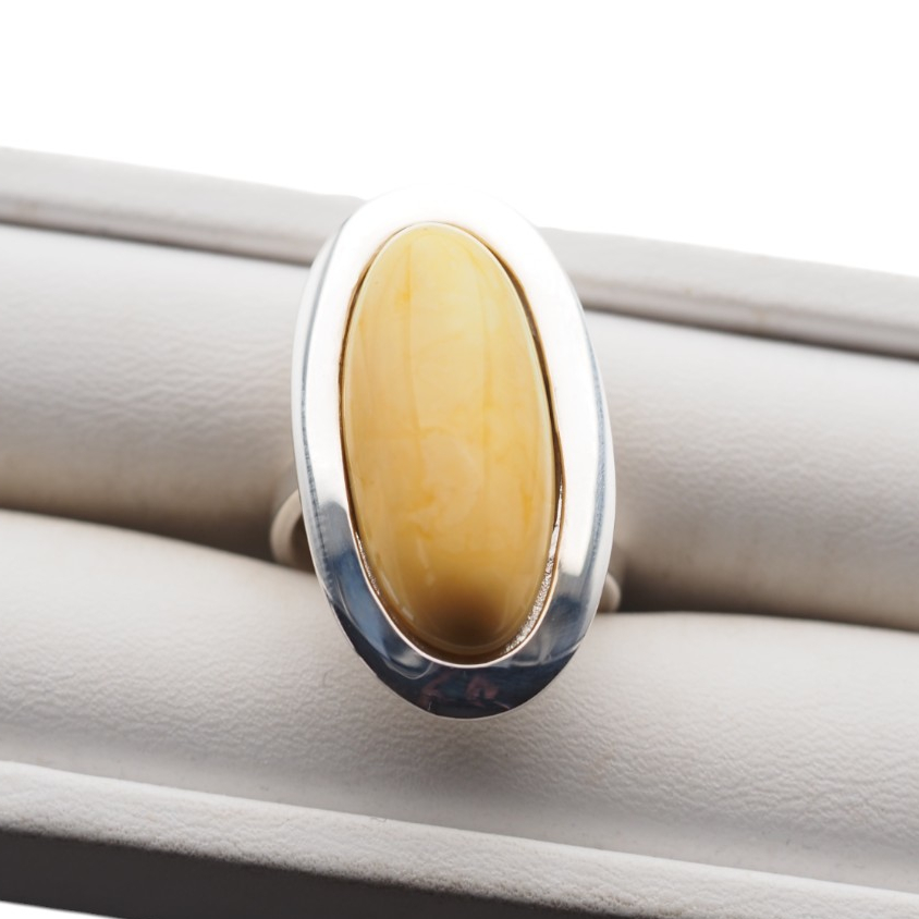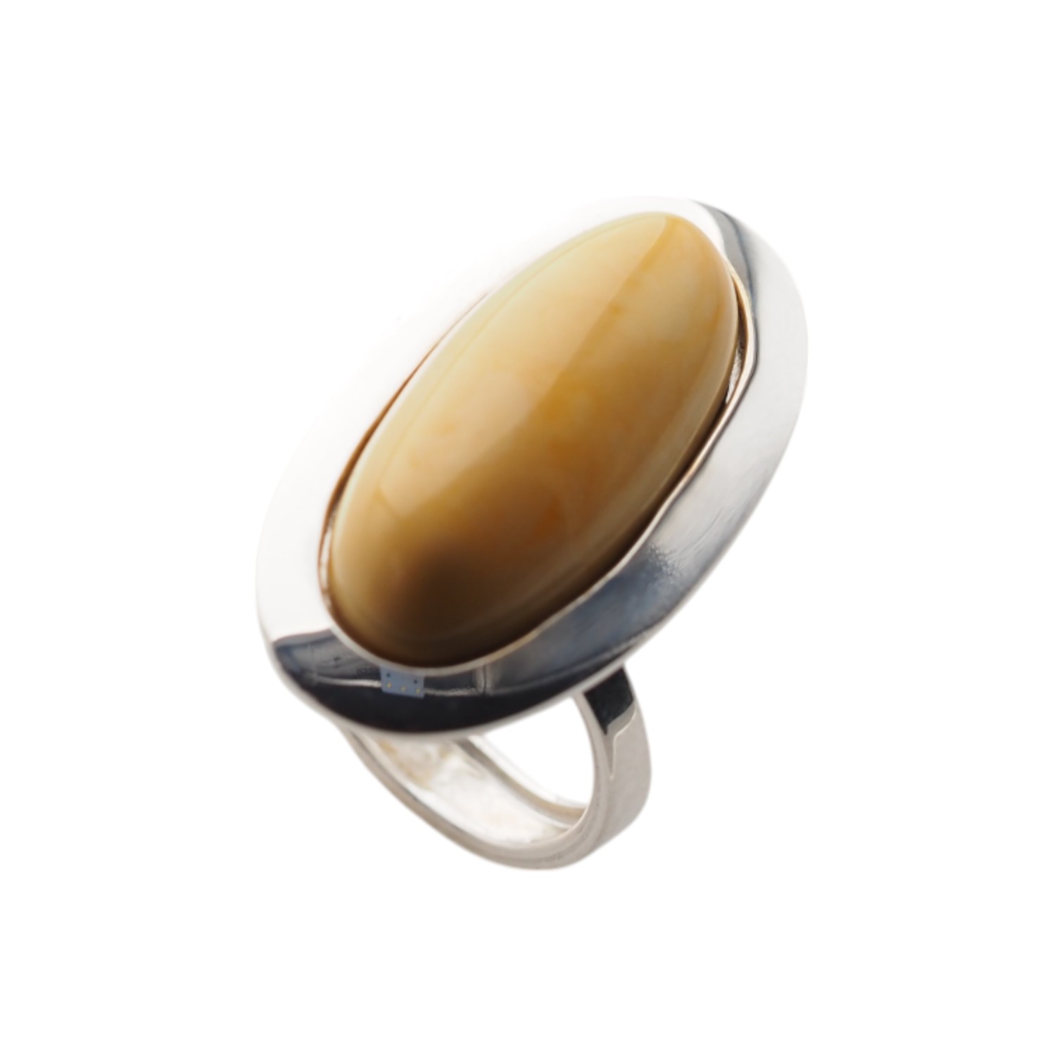 Ręcznie wykonany pierścionek z naturalnym mlecznym bursztynem bałtyckim o smukłym, owalnym kształcie, osadzony w minimalistycznej oprawie ze srebra próby 925.