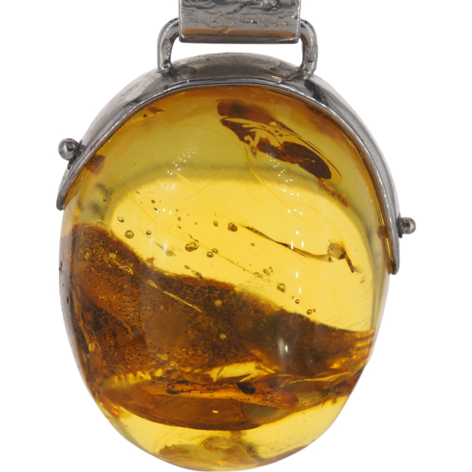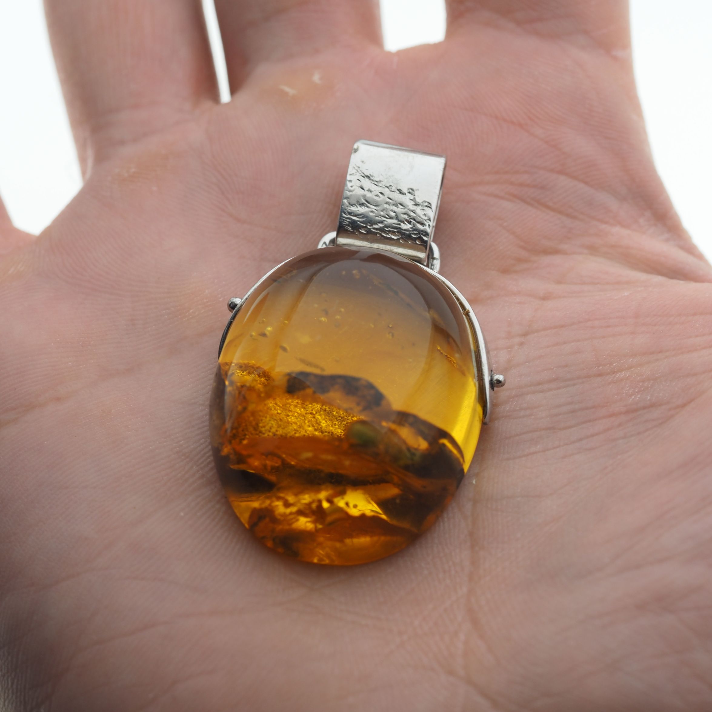Bursztyn z inkluzją i młotkowane srebro oksydowane - zawieszka z rzemieniem