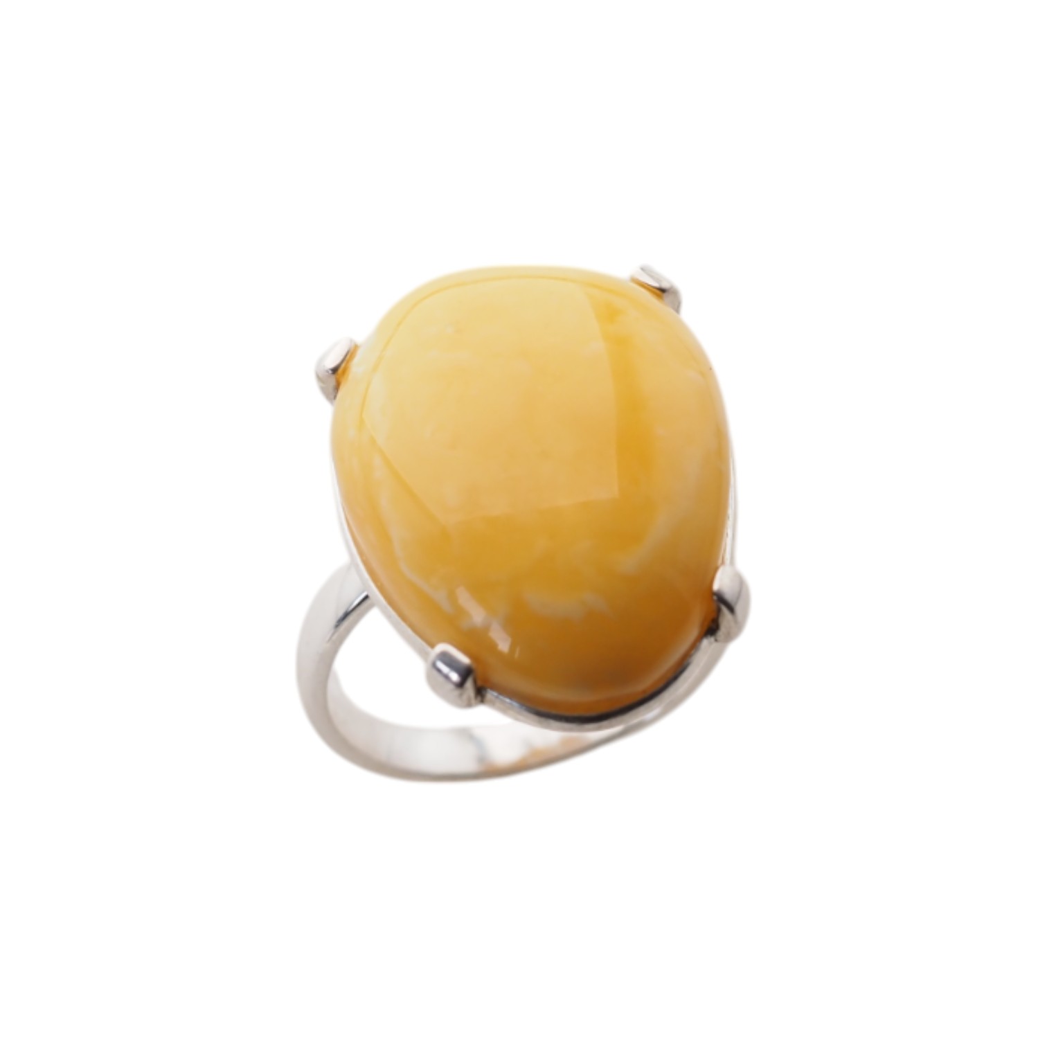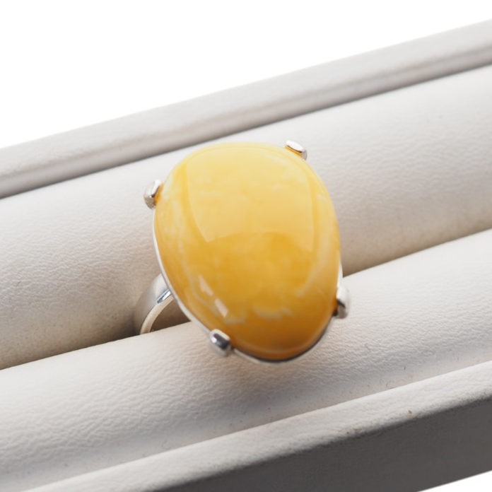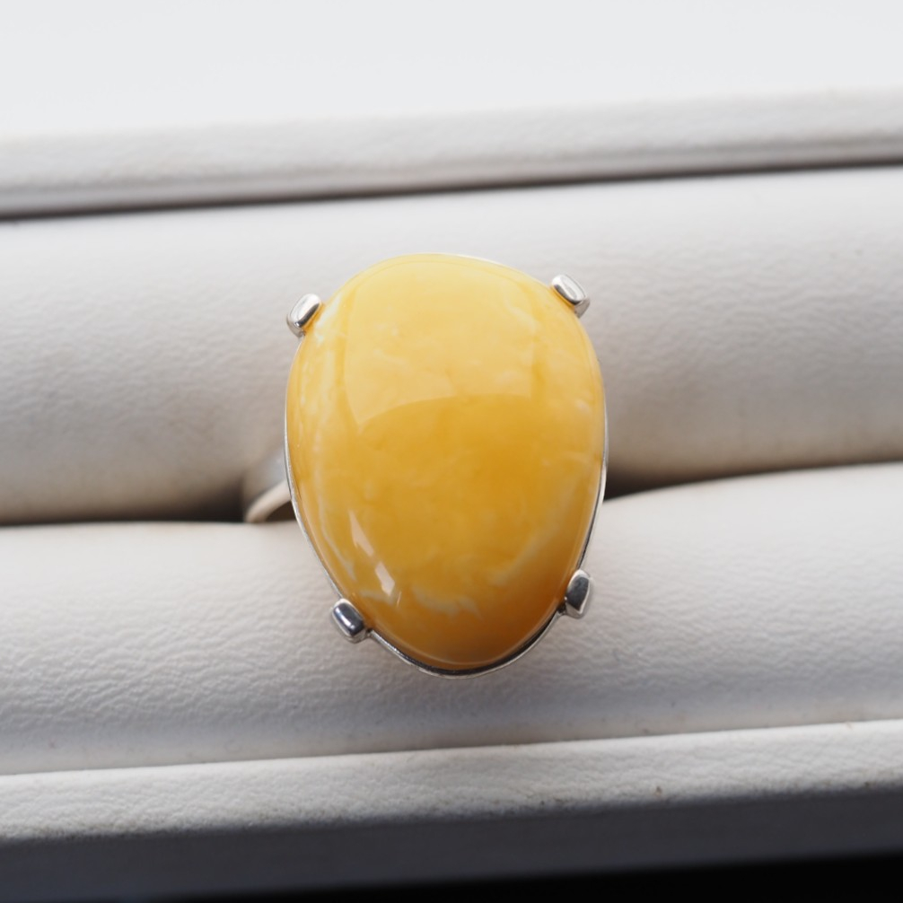 Elegancki pierścionek ręcznie wykonany ze srebra próby 925, z osadzonym naturalnym bursztynem mlecznym w kształcie łzy.