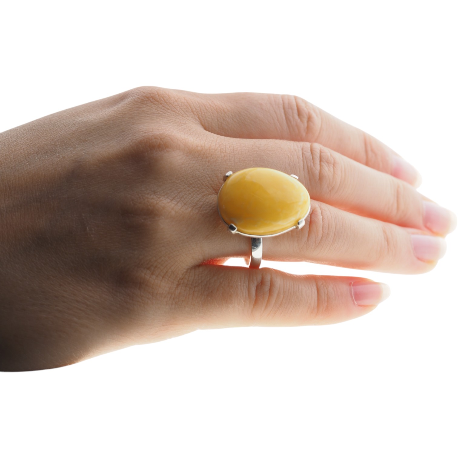 Bursztyn delikatnie zaokrąglony, z lustrzaną powierzchnią, dodaje dłoni elegancji.