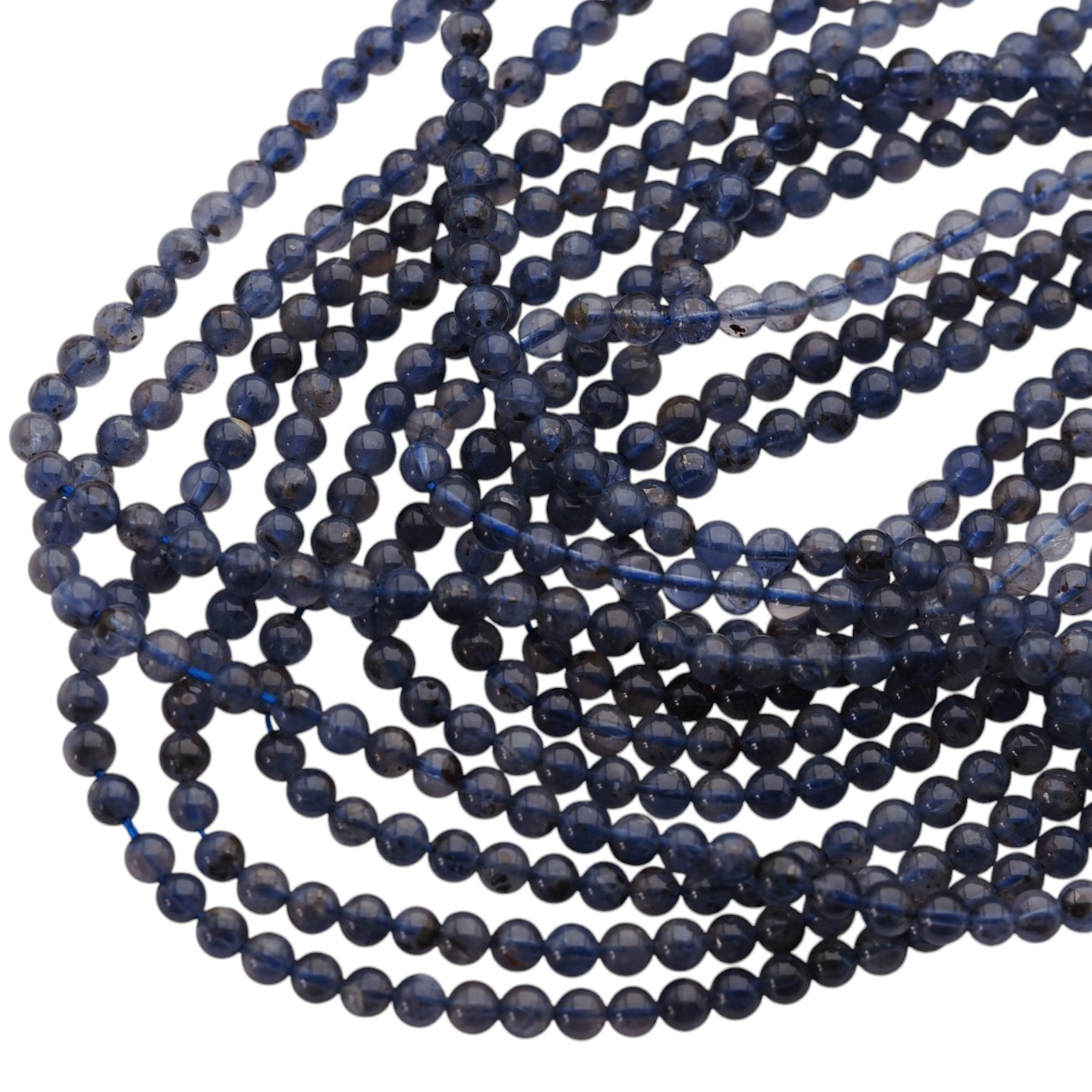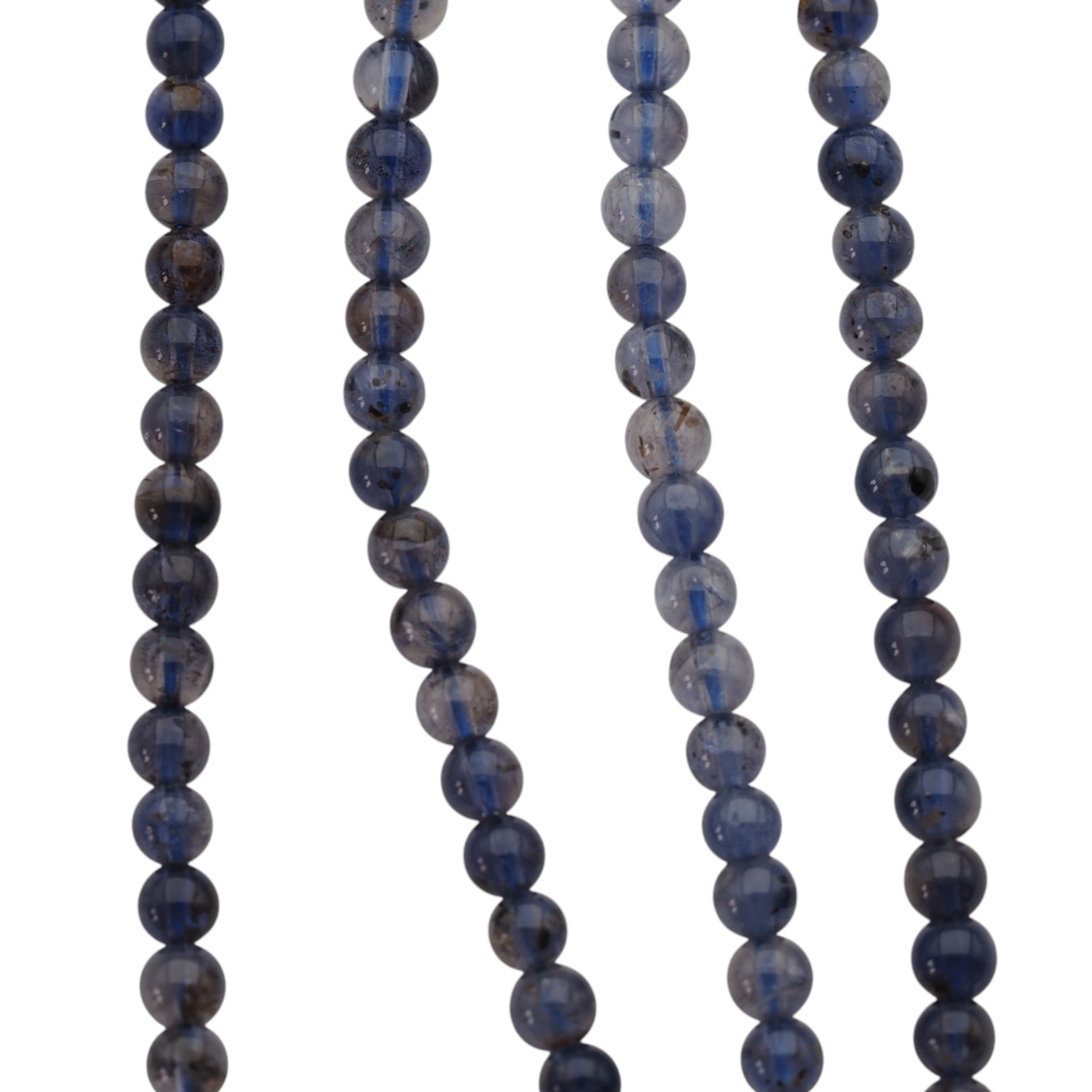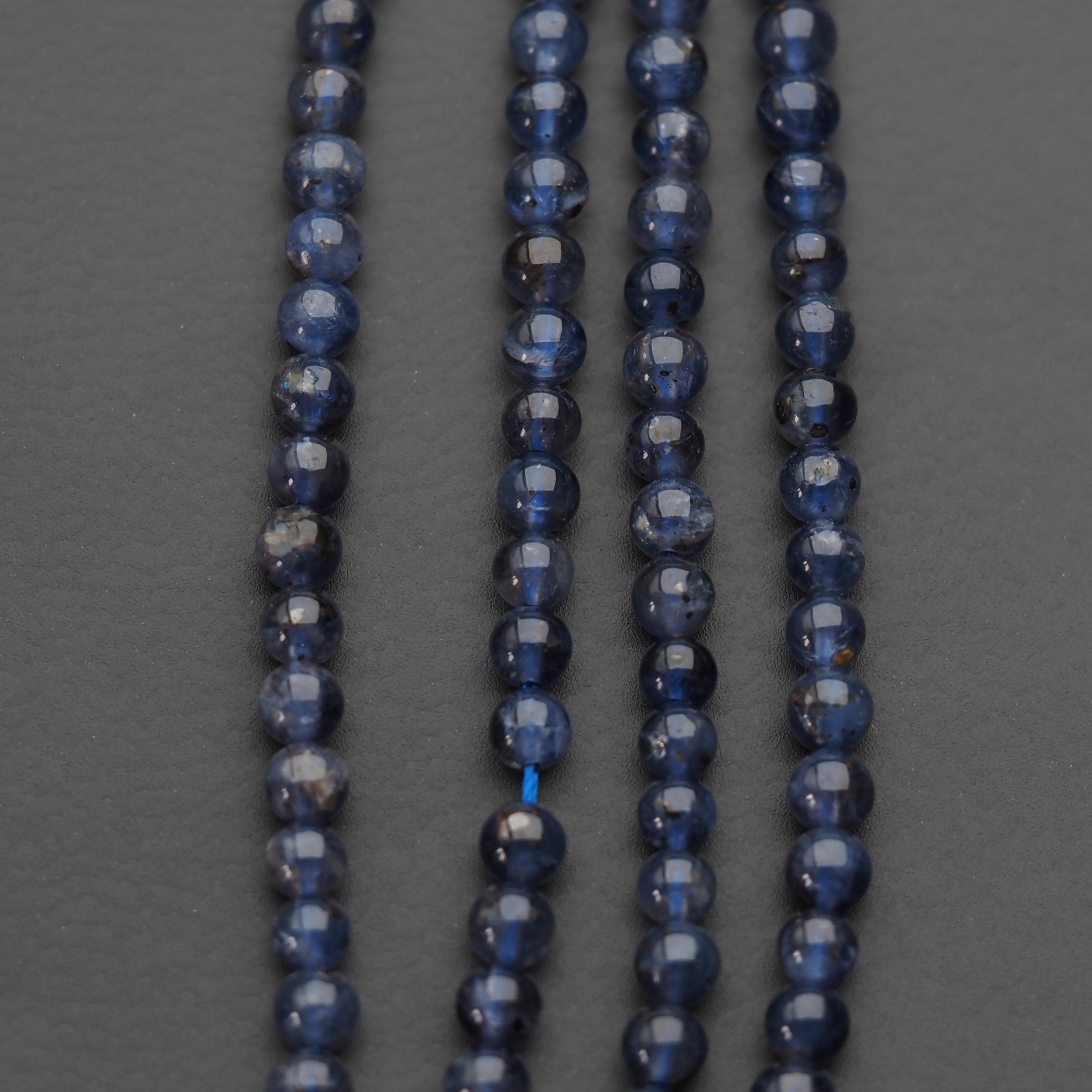 Naturalny Iolit w formie gładkich kulek o średnicy 4,5 mm na sznurku o długości około 39–40 cm.