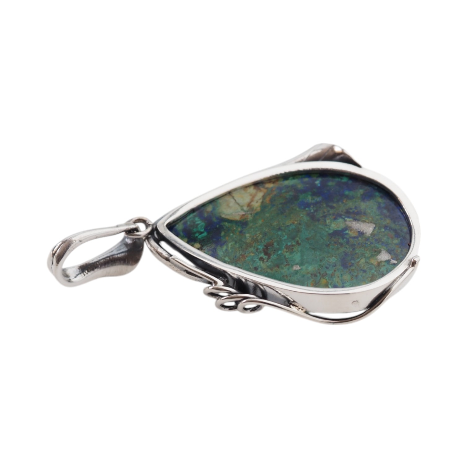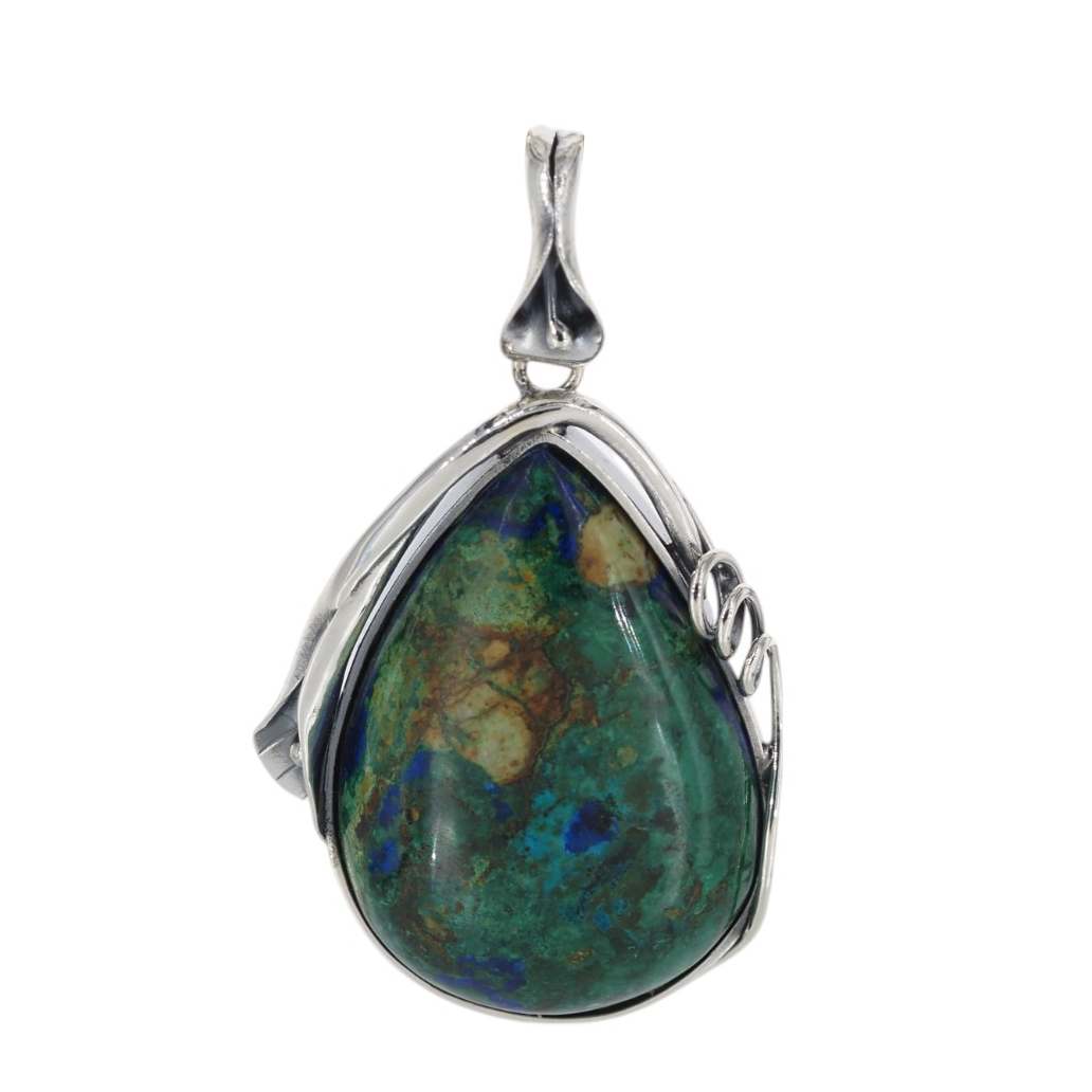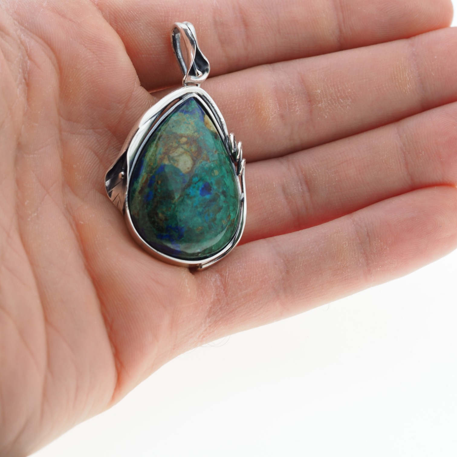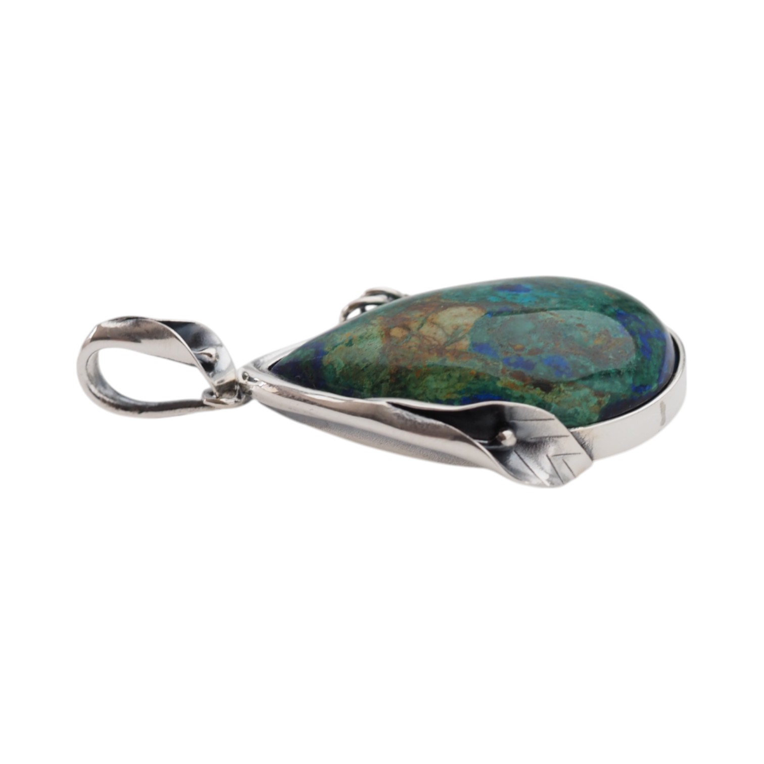 Ta zawieszka łączy naturalny azuryt o głębokiej, nasyconej kolorystyce z dekoracyjną oprawą ze srebra oksydowanego. Kamień ma kształt łzy, a srebrna rama z motywem liści nadaje całości wyrazisty, jubilerski charakter i lekko organiczną estetykę.