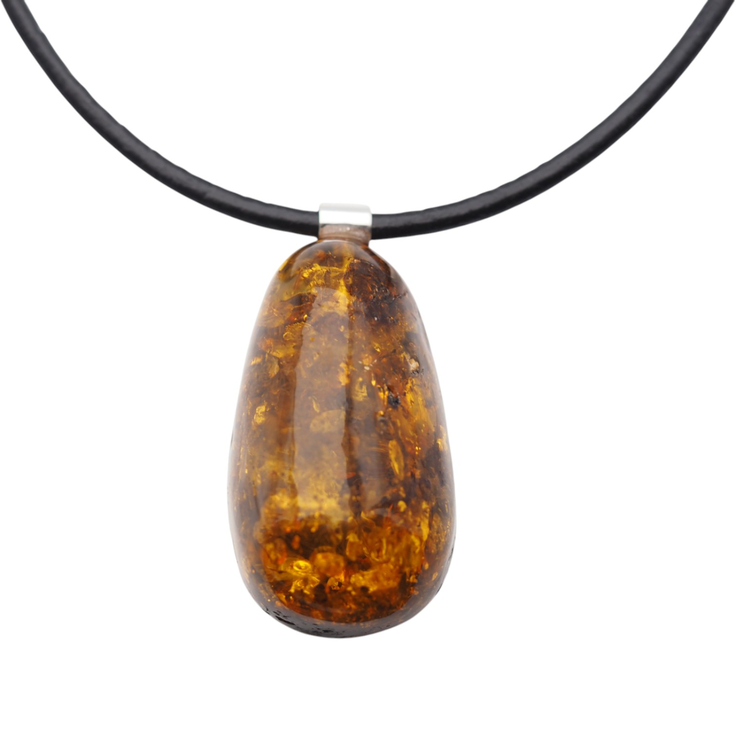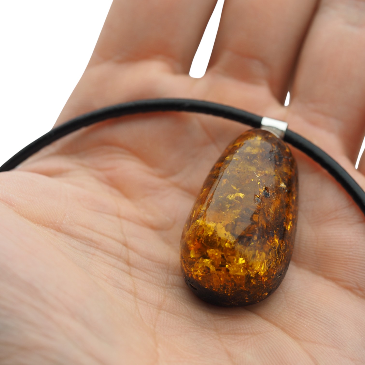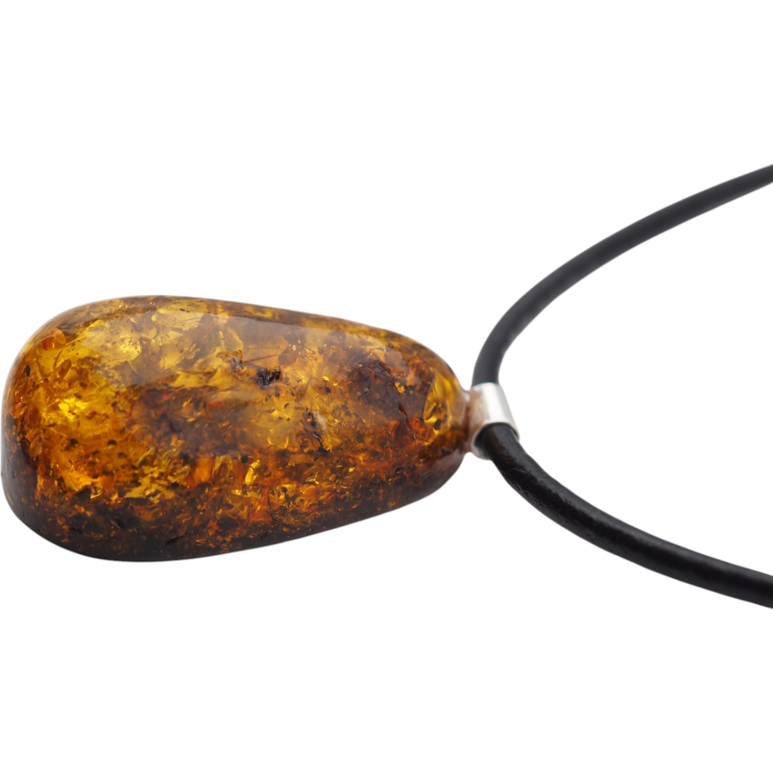 Bursztyn koniakowy z łuskami i srebro - naszyjnik na rzemieniu