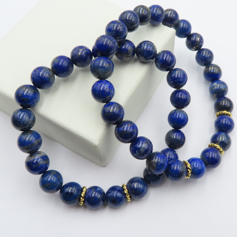 Bransoletka z lapisem lazuli przyciąga wzrok głębokim, nasyconym odcieniem niebieskiego, charakterystycznym dla tego kamienia. Całość dopełniają elementy ze srebra złoconego 24K (próba 925), które dodają biżuterii eleganckiego, ciepłego akcentu.