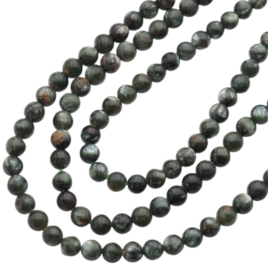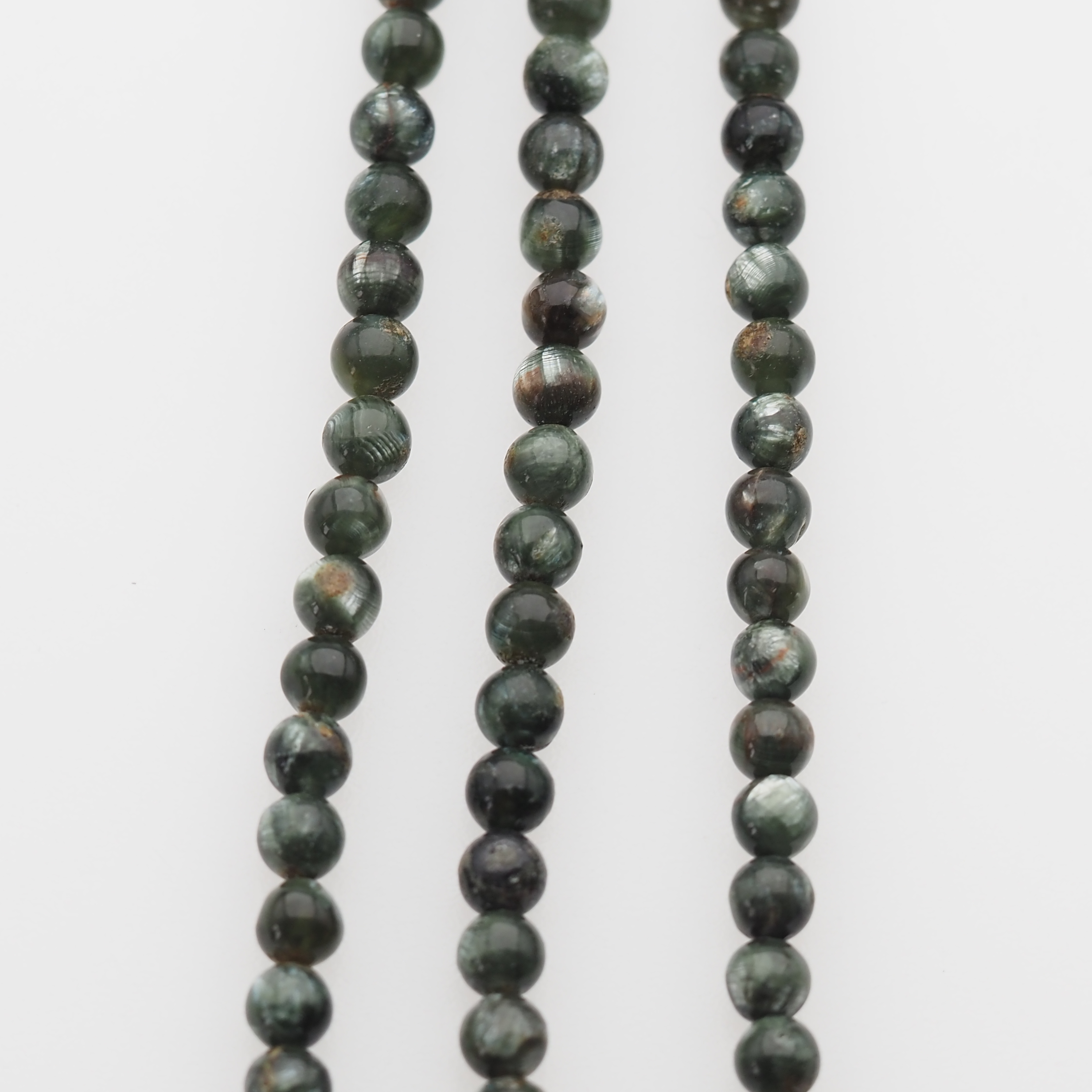 Naturalny kamień półszlachetny Serafinit (Klinochlor) w formie polerowanych kulek o średnicy 5-5,2 mm, nawleczony na sznur o długości około 38 cm. Kamienie mają głęboką, zieloną barwę z charakterystycznymi świetlistymi refleksami przypominającymi pióra – nadają biżuterii luksusowy, elegancki wygląd.