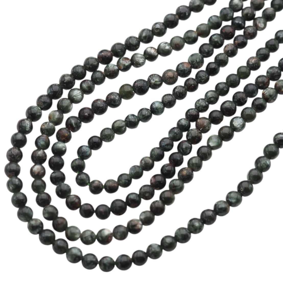 Serafinit (klinochlor) w formie polerowanych kulek zachwyca głęboką zielenią i charakterystycznymi, srebrzystymi refleksami. Subtelna „piórkowa” struktura i naturalna gra światła sprawiają, że sznur wygląda elegancko, a jednocześnie pozostaje w pełni organiczny w odbiorze.