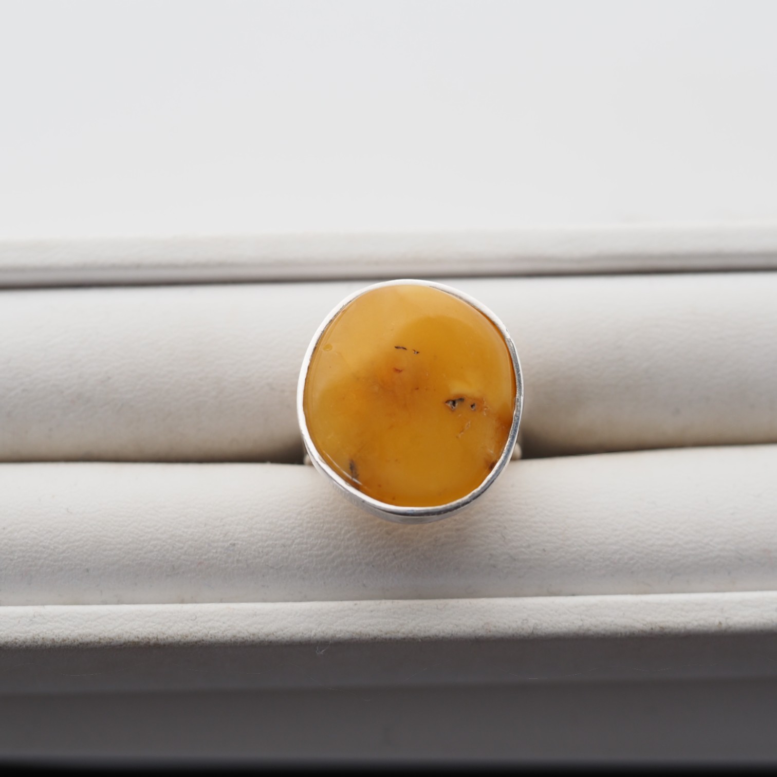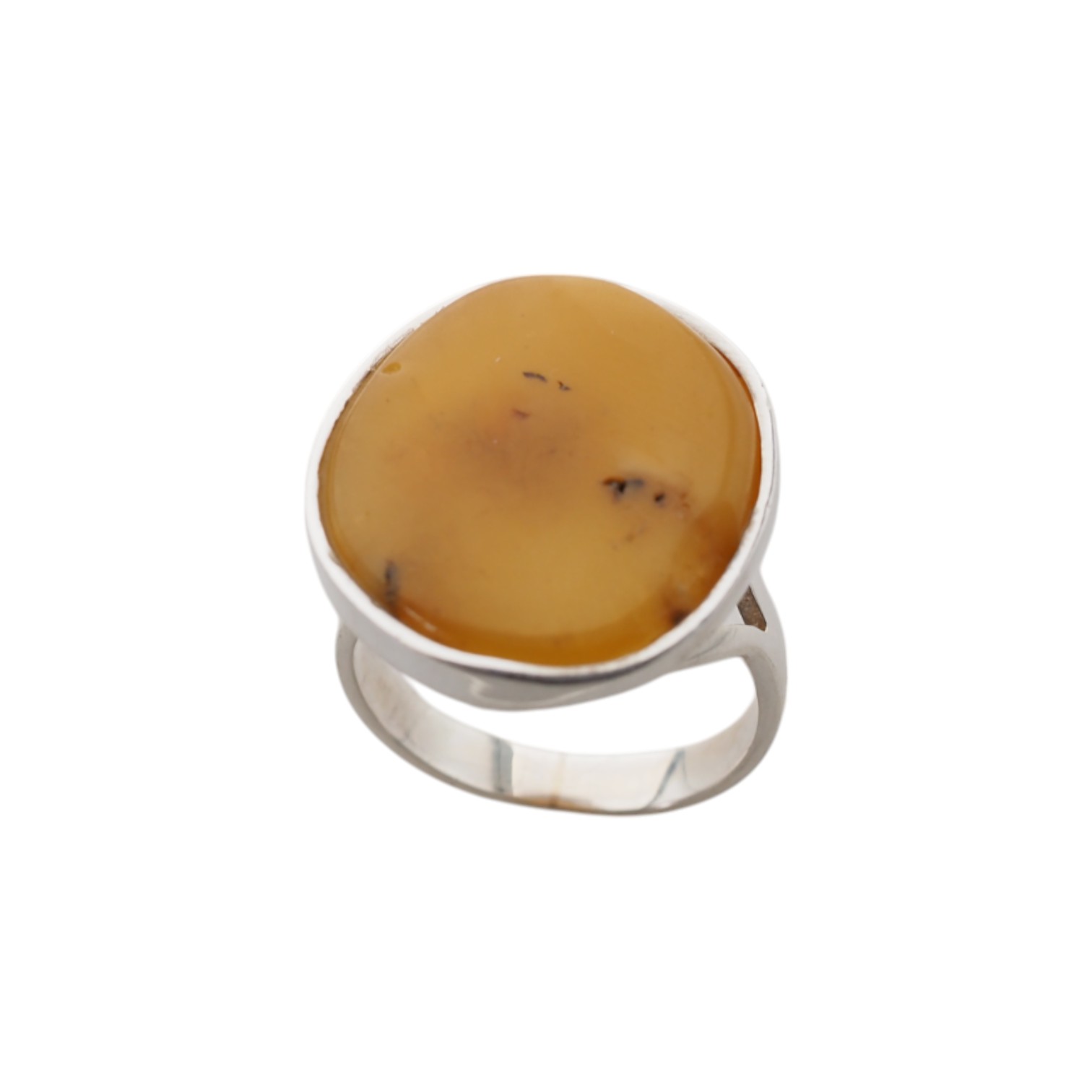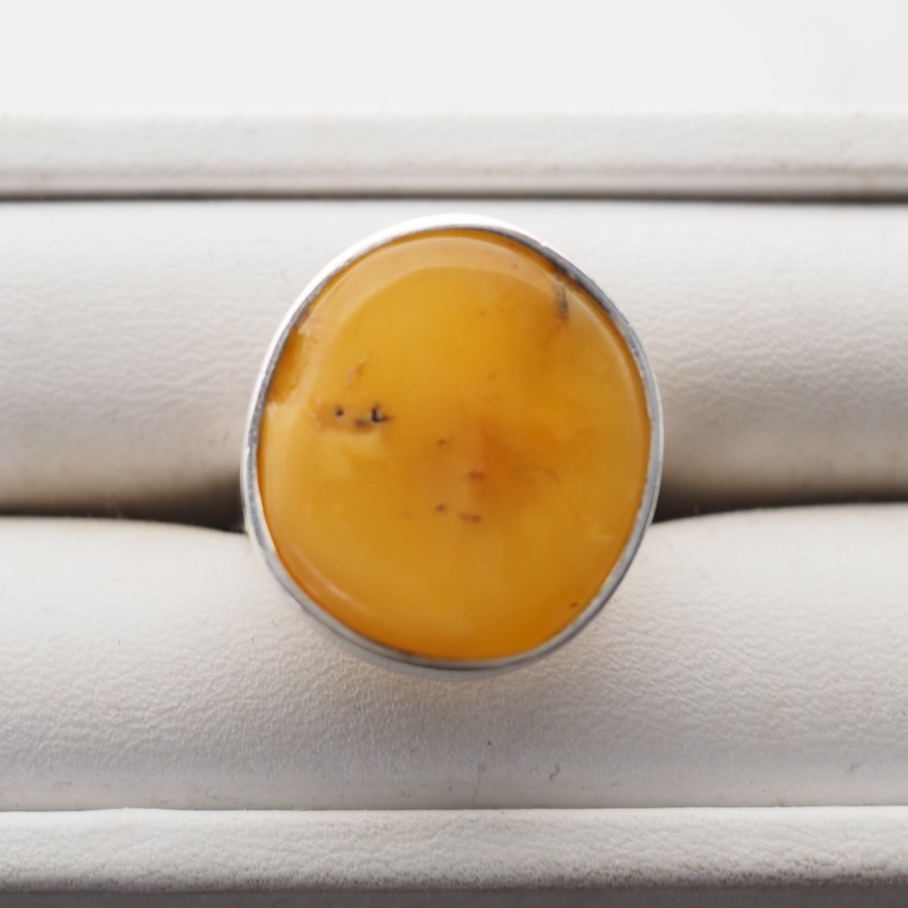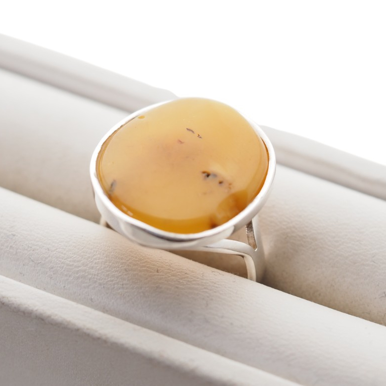 Ręcznie wykonany pierścionek z naturalnym bursztynem mlecznym w klasycznej oprawie ze srebra próby 925.
