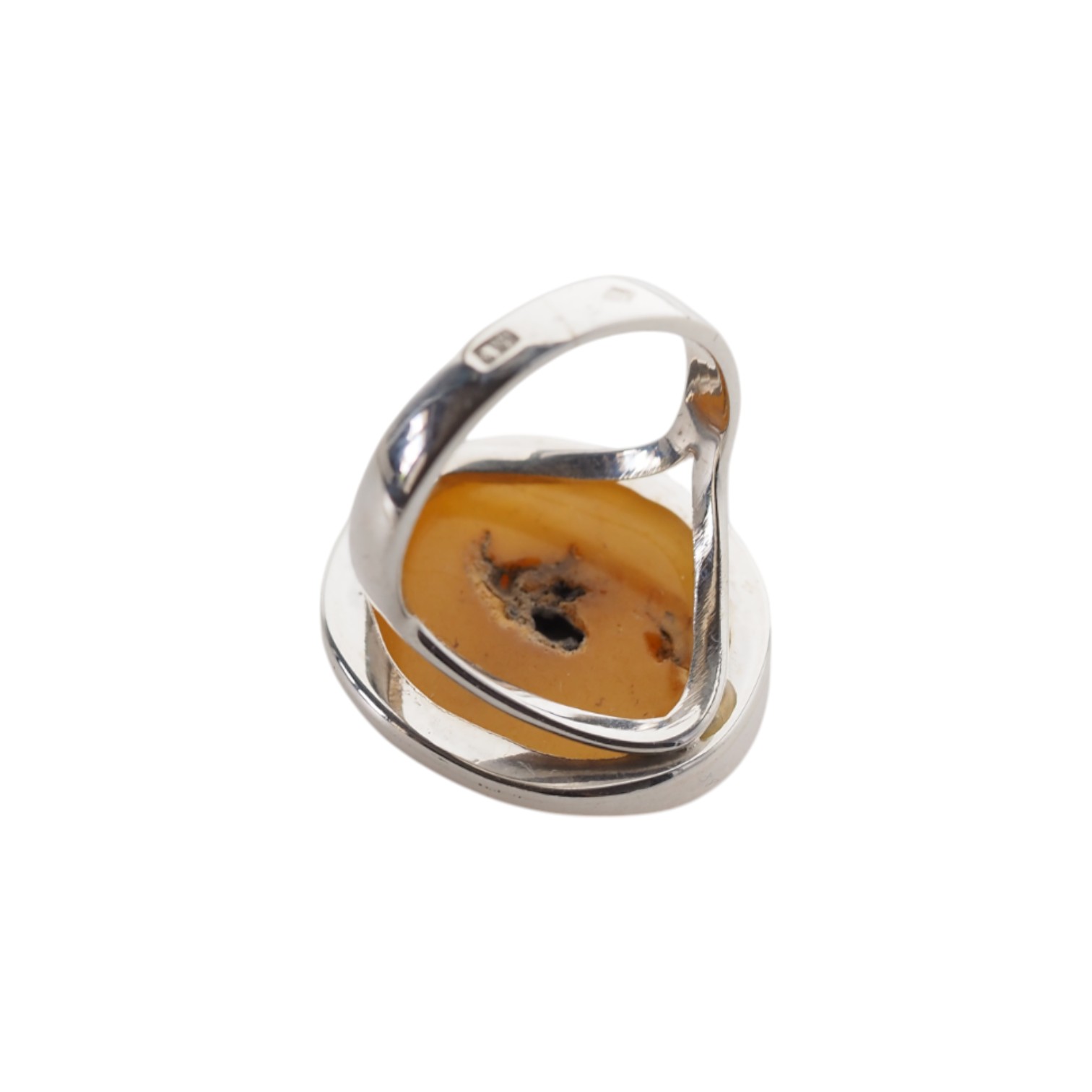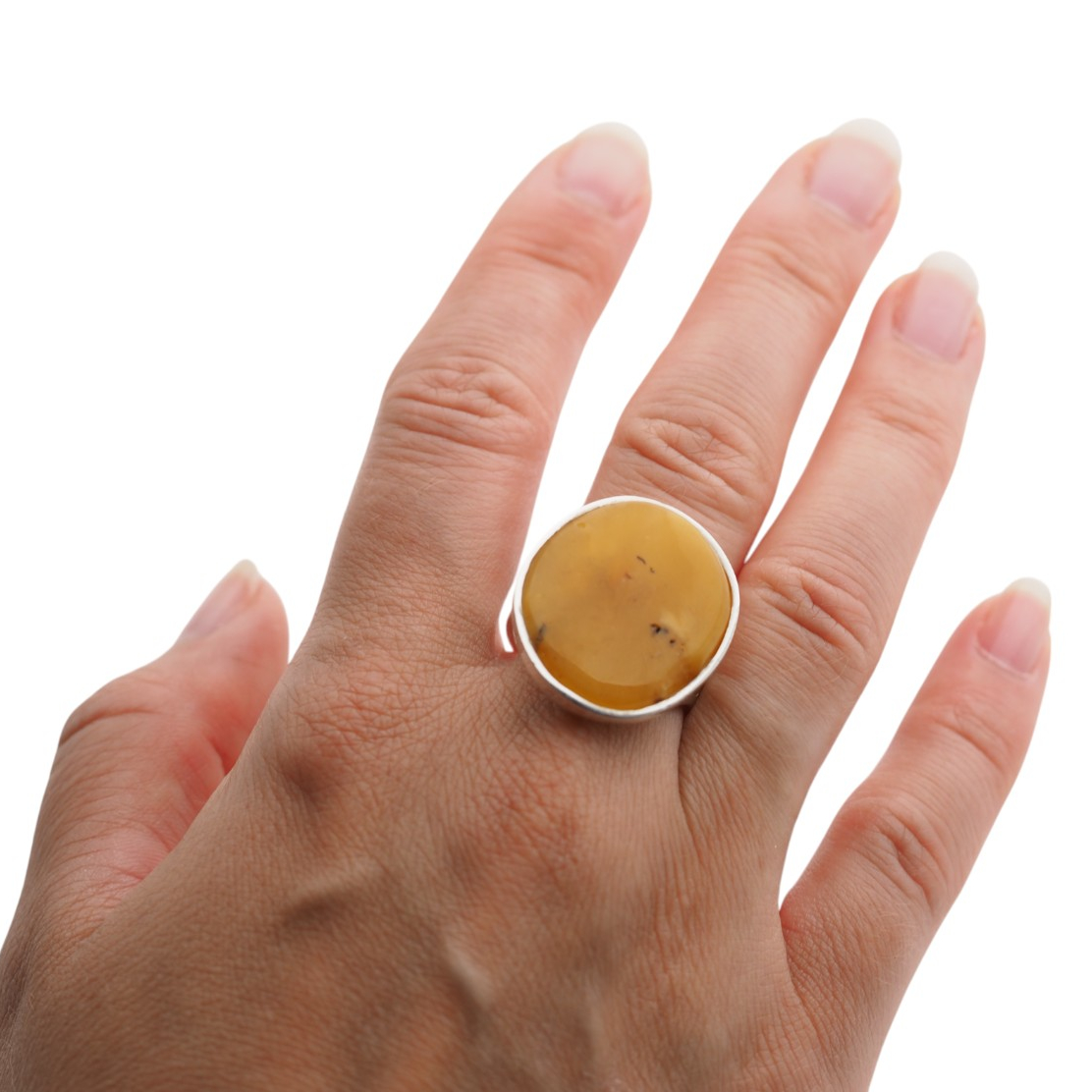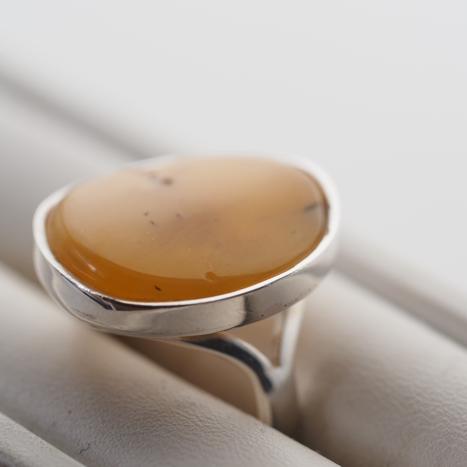 Ręcznie wykonany pierścionek z naturalnym bursztynem mlecznym w klasycznej oprawie ze srebra próby 925.