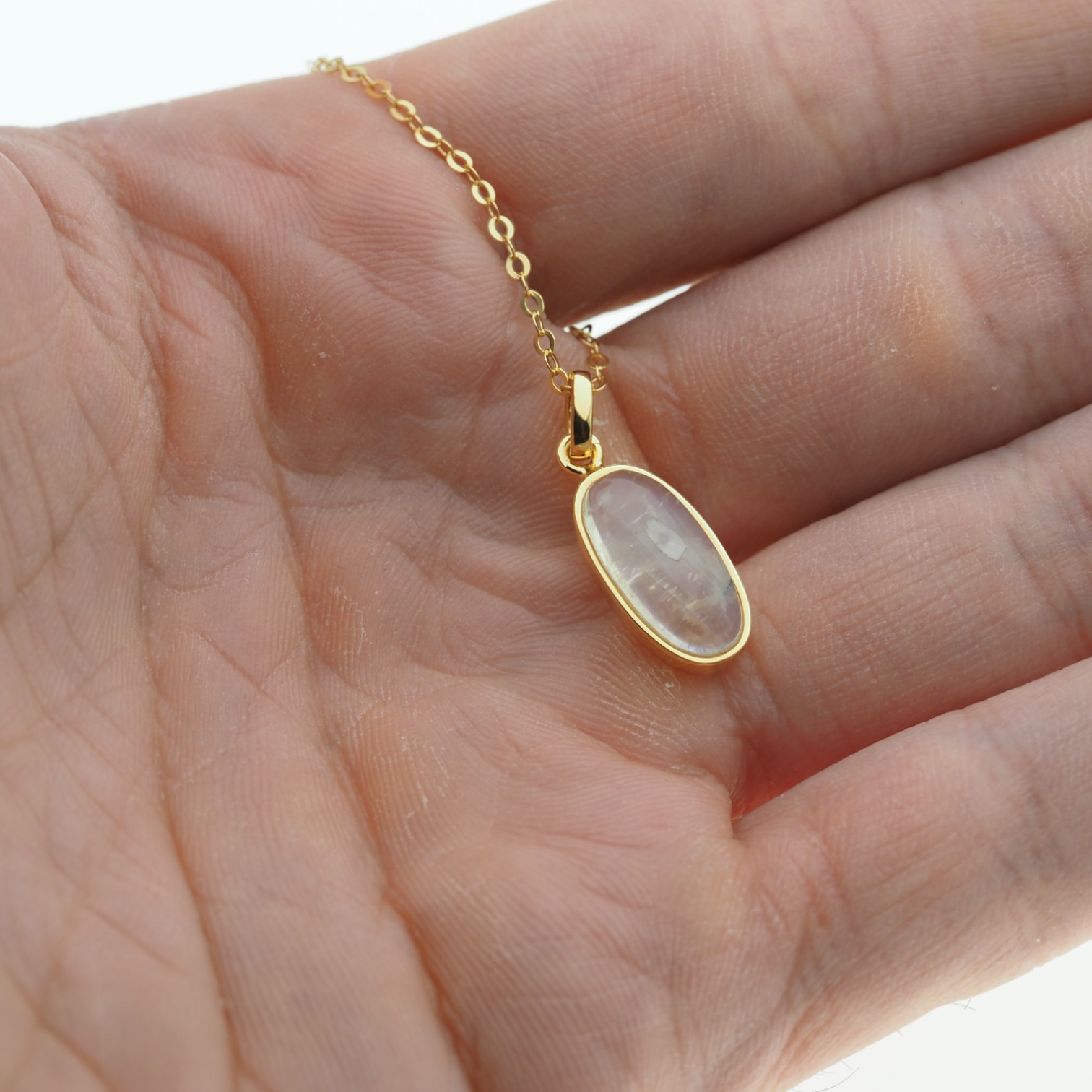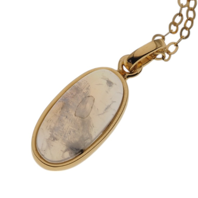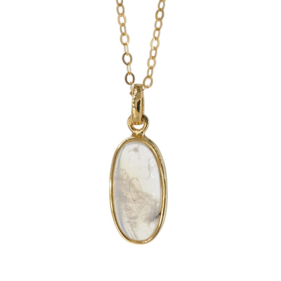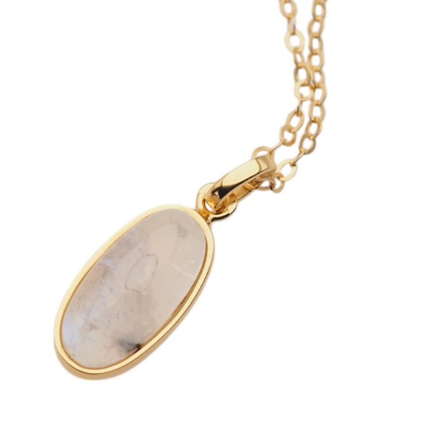 Delikatny naszyjnik z naturalnym Kamieniem Księżycowym osadzonym w srebrze złoconym próby 925. Kamień przyciąga wzrok subtelną grą barw – mieni się głównie w tonach żółci i błękitu, dzięki czemu całość ma lekki, elegancki i kobiecy charakter.