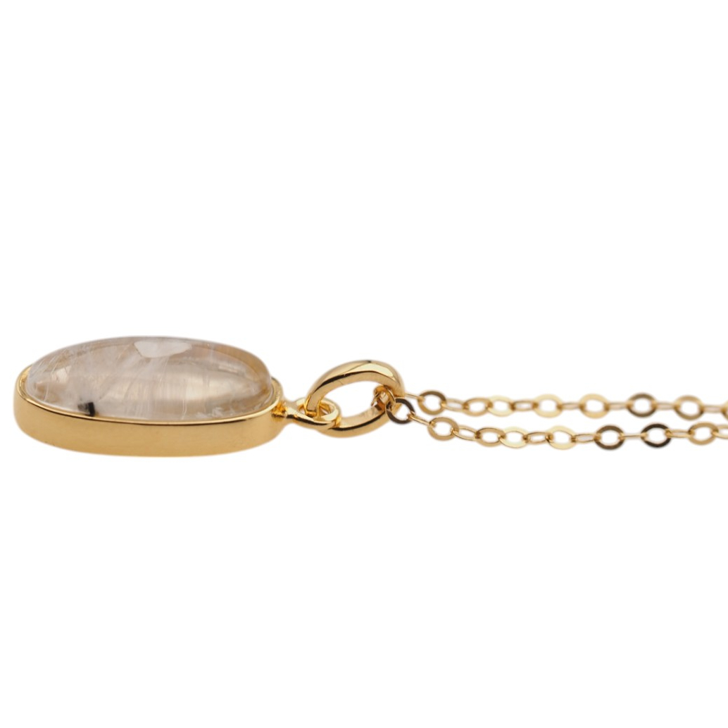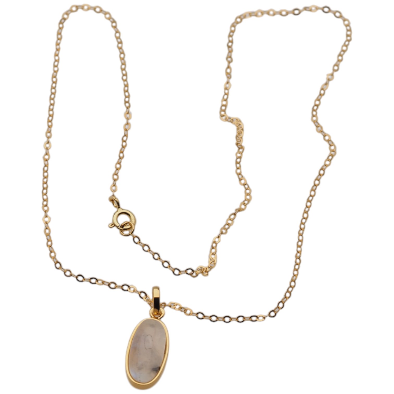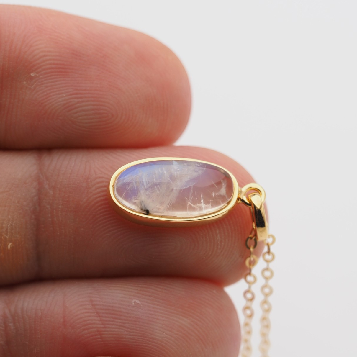 Delikatny naszyjnik z naturalnym Kamieniem Księżycowym osadzonym w srebrze złoconym próby 925. Kamień przyciąga wzrok subtelną grą barw – mieni się głównie w tonach żółci i błękitu, dzięki czemu całość ma lekki, elegancki i kobiecy charakter.