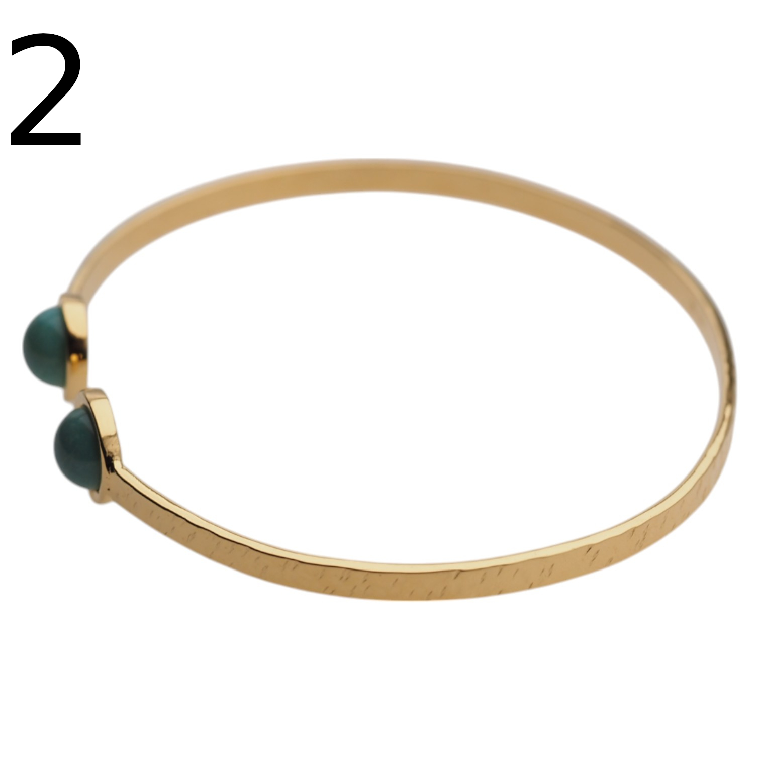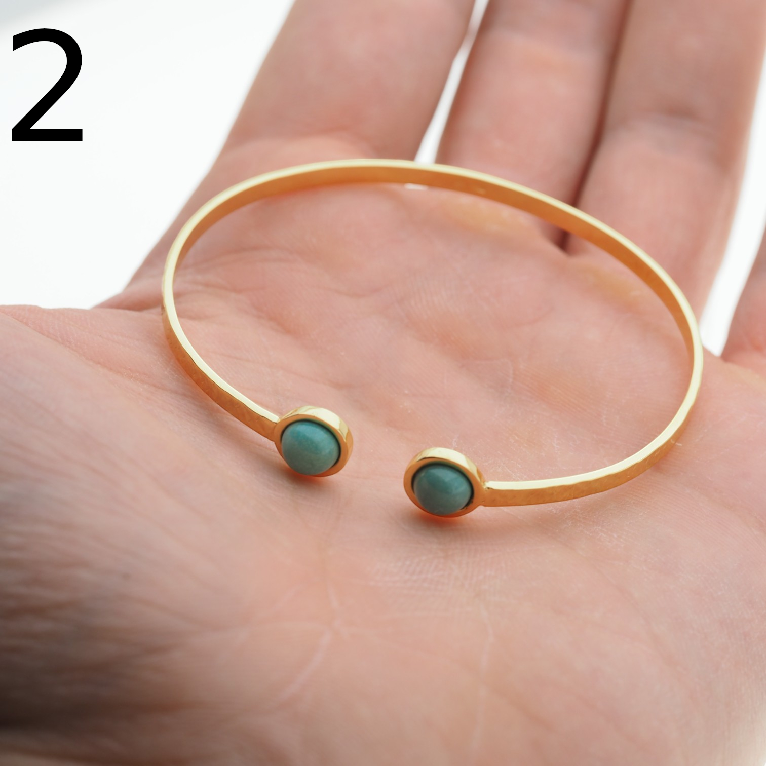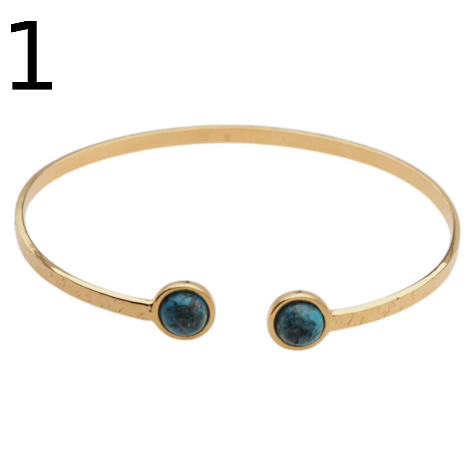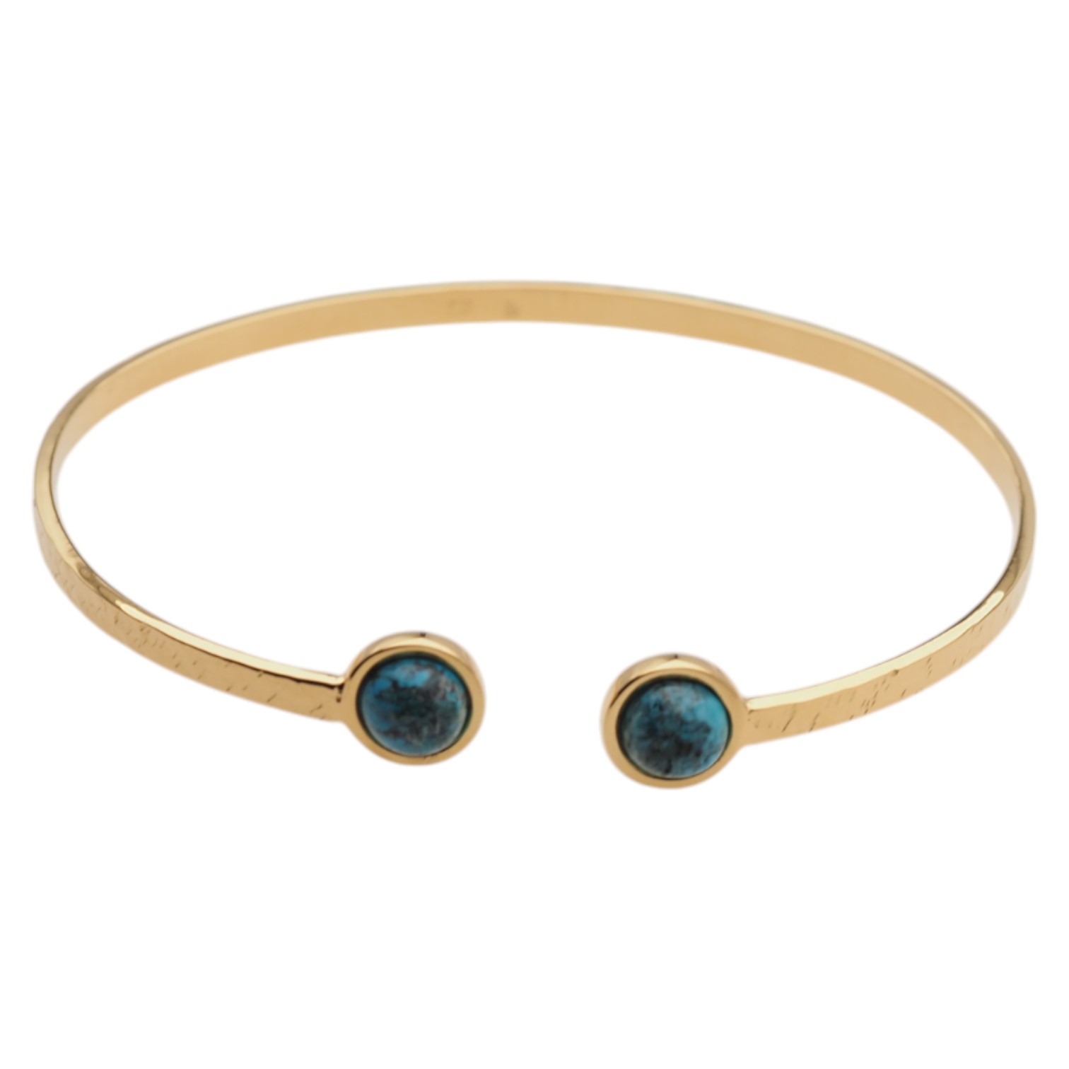 Ręcznie wykonana bransoleta z naturalnym turkusem przyciąga wzrok świeżym, niebiesko-zielonym kolorem oraz eleganckim kontrastem złoconego srebra. Młotkowane wykończenie nadaje całości subtelnie rzemieślniczny charakter, a kamień osadzony w srebrnej oprawie podkreśla szlachetność formy.