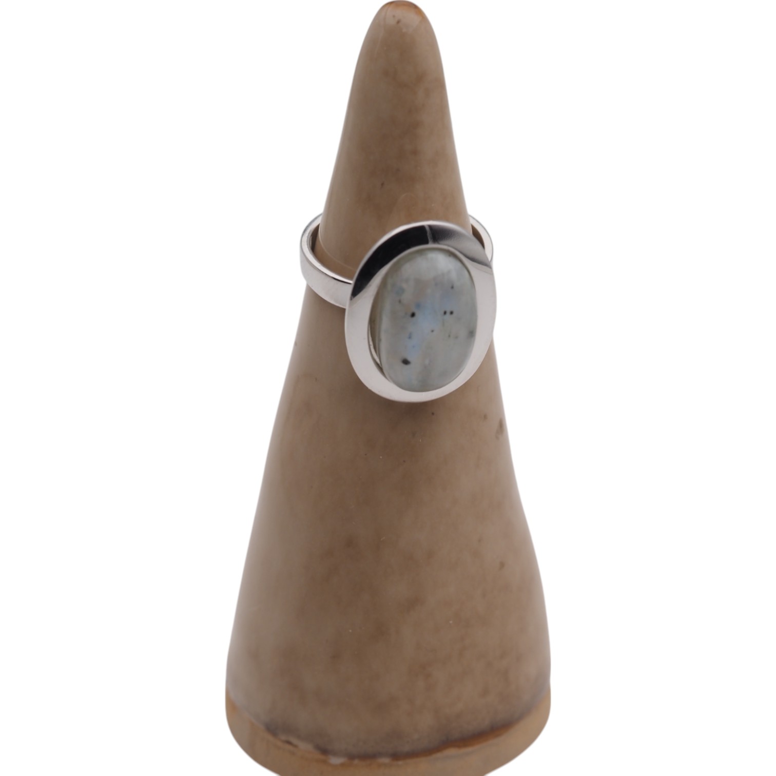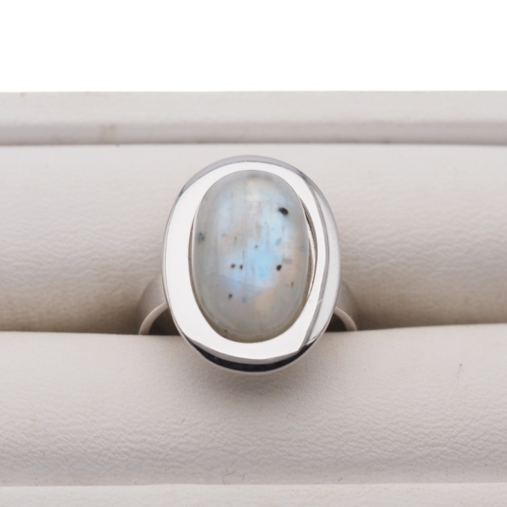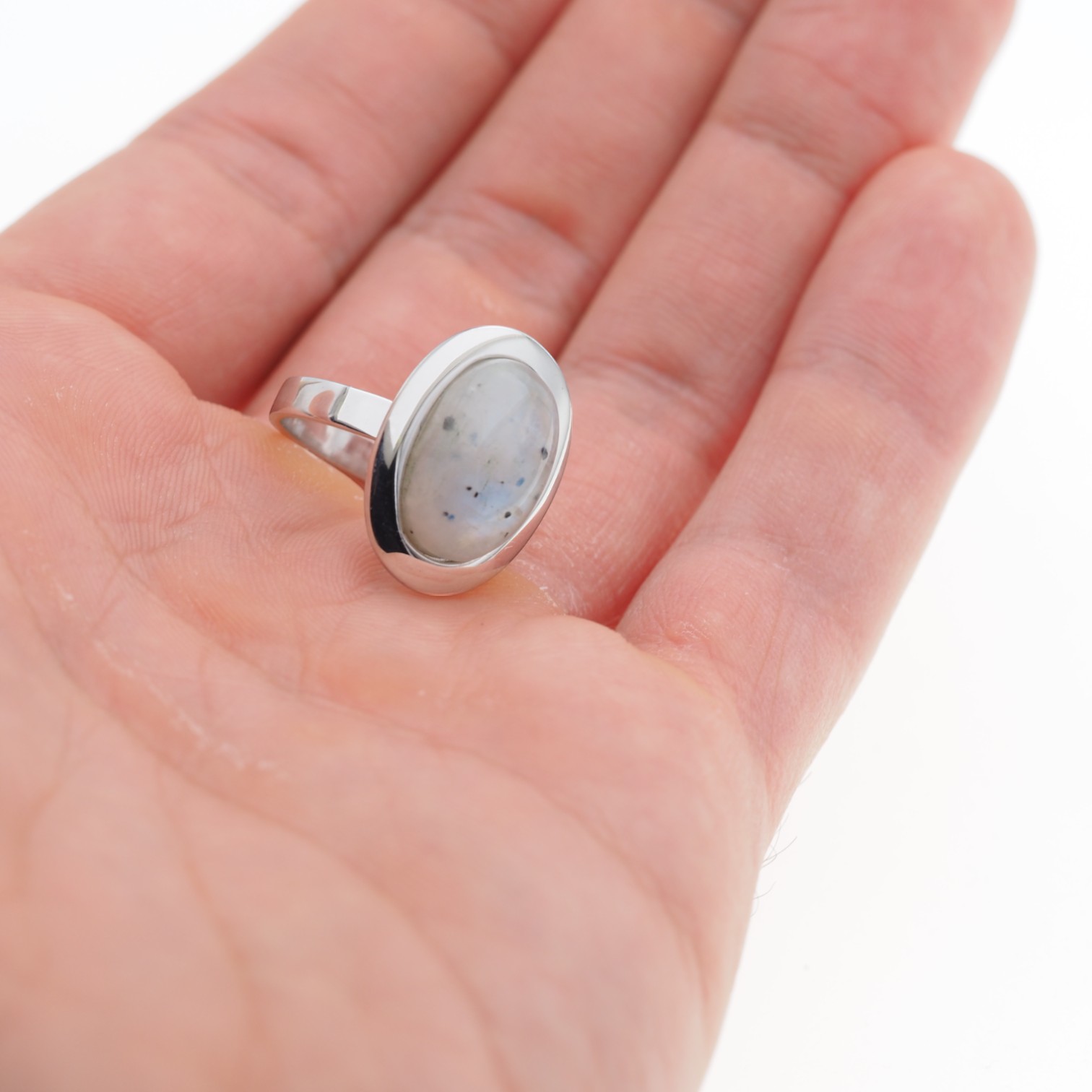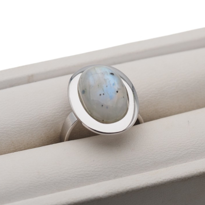 Pierścionek z naturalnym Kamieniem Księżycowym przyciąga uwagę owalnym kamieniem o subtelnym, mlecznym blasku. Srebrna oprawa w rodowanym wykończeniu podkreśla chłodny, elegancki charakter biżuterii i sprawia, że całość wygląda szlachetnie oraz ponadczasowo.