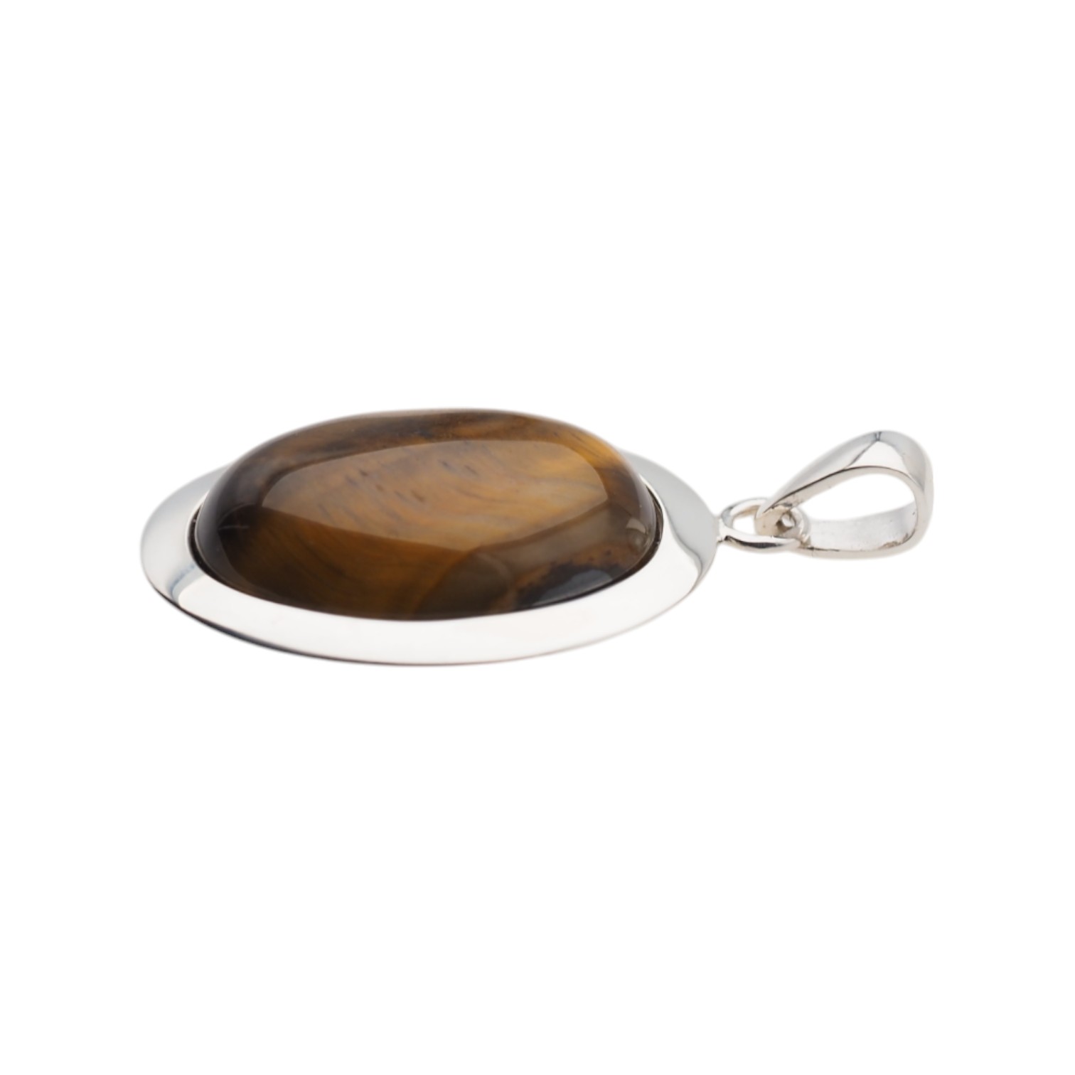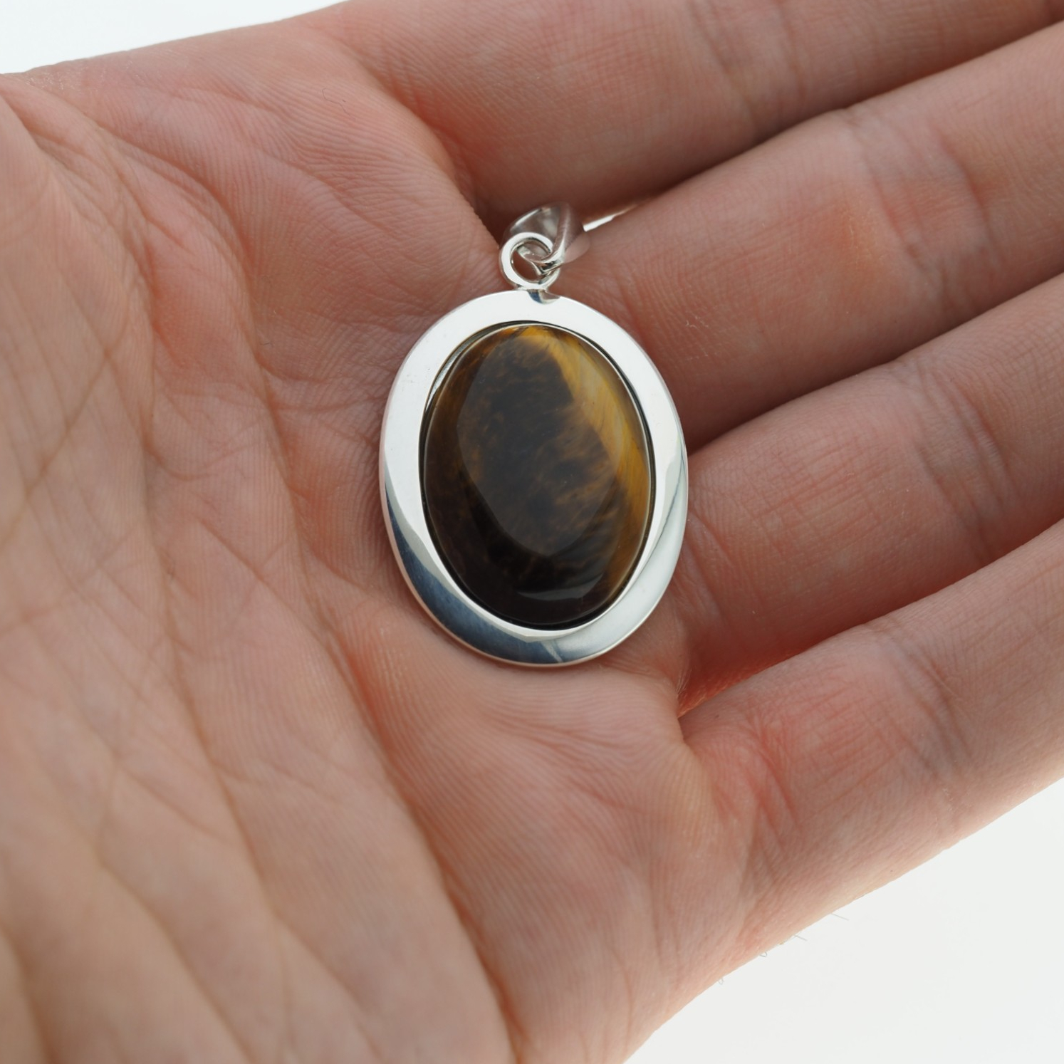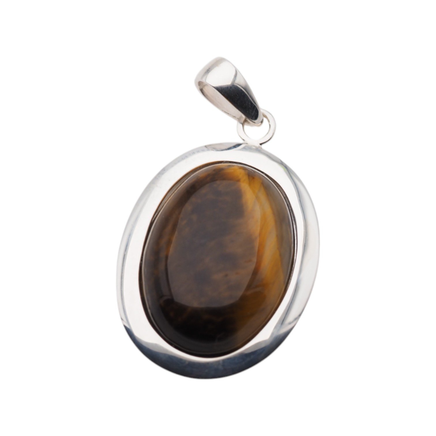Wisiorek z naturalnym Tygrysim Okiem w owalnym kształcie, oprawiony ręcznie w srebro. Kamień przyciąga wzrok charakterystycznym, złocisto-brązowym połyskiem i „kocim” refleksom, które zmieniają się wraz z kątem padania światła. Srebrna oprawa nadaje całości elegancki, jubilerski charakter.