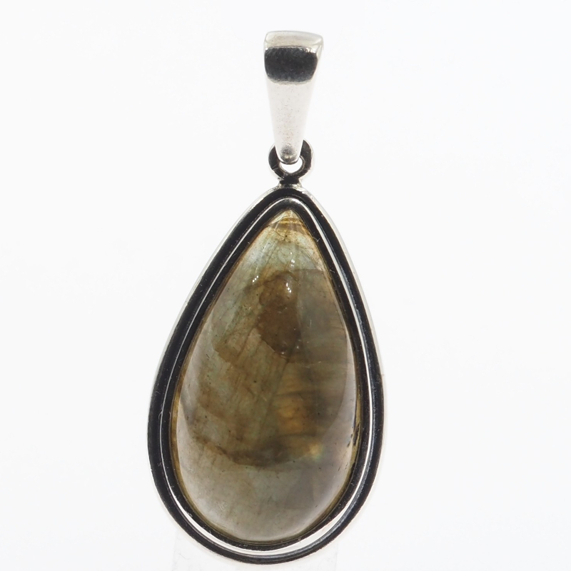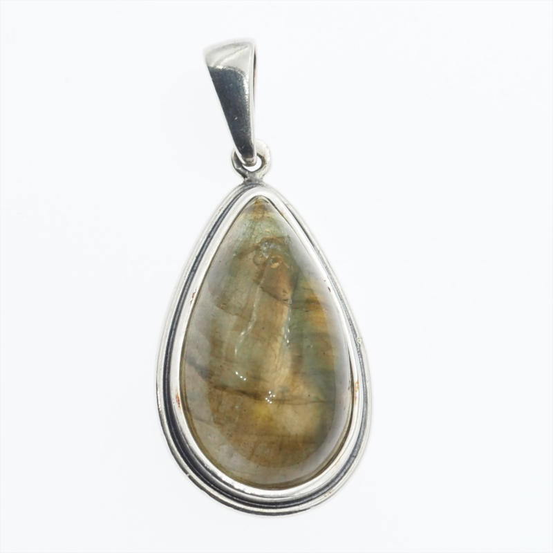 Zawieszka z naturalnym labradorytem w fasetowanym szlifie, oprawiona w srebro oksydowane próby 925. Kamień ma kształt łzy i wyróżnia się wyraźną grą światła – w tej sztuce połysk układa się głównie w pomarańczowych tonach, co nadaje biżuterii ciepły, elegancki charakter.
