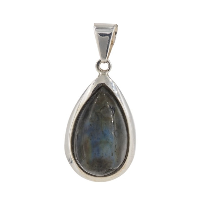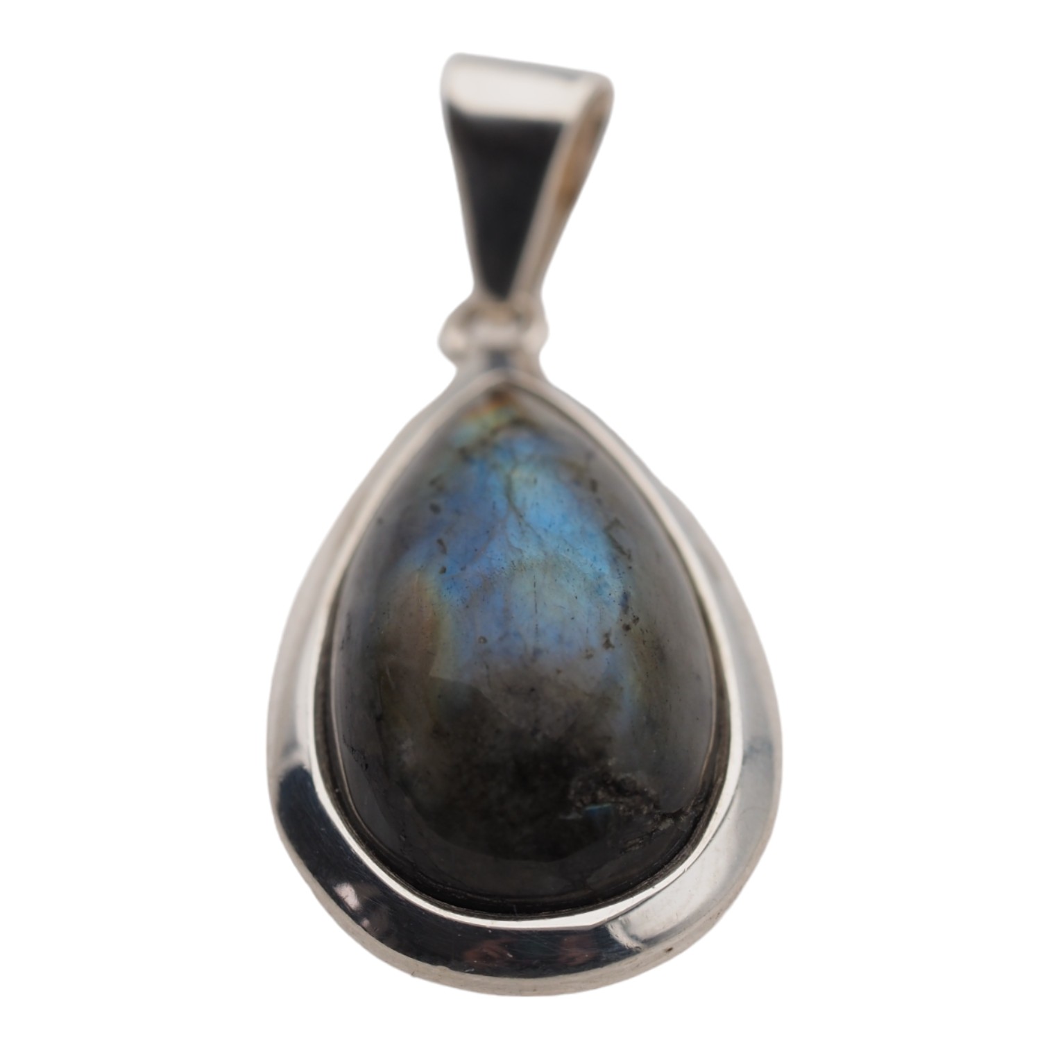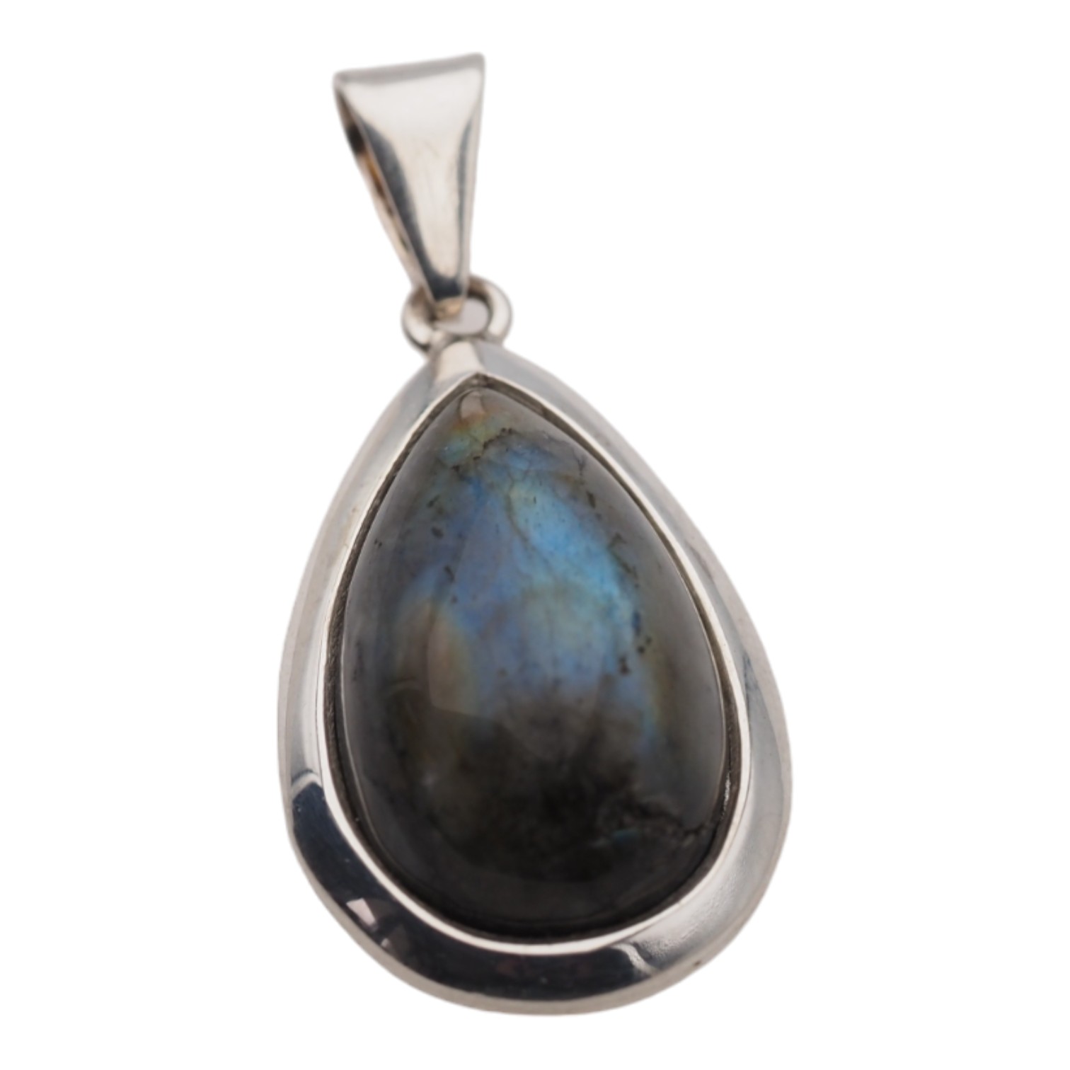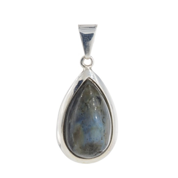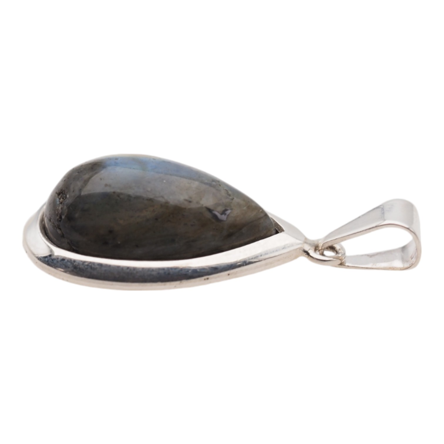 Zawieszka z naturalnym labradorytem w kształcie łzy, osadzonym w srebrnej oprawie. Kamień przyciąga uwagę charakterystycznym połyskiem, który mieni się na różne kolory, dzięki czemu biżuteria wygląda żywo i zmienia się w zależności od światła.