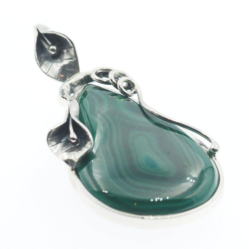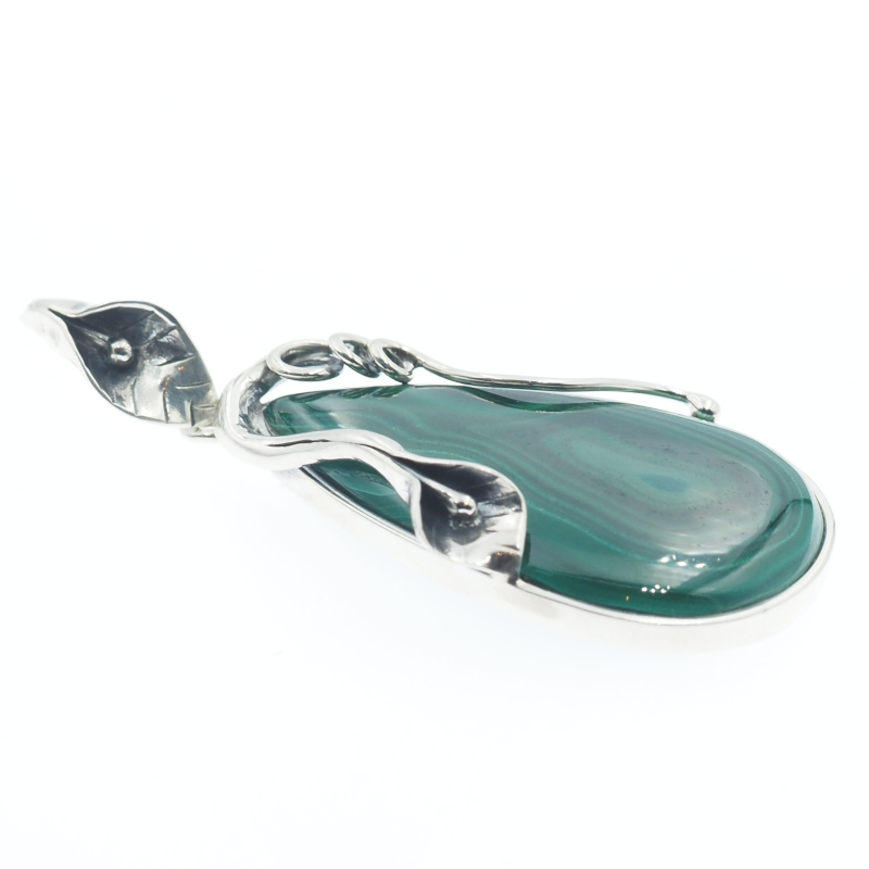 Zawieszka z naturalnym malachitem w kształcie łzy przyciąga wzrok głęboką, zieloną barwą i charakterystycznym, pasmowym rysunkiem kamienia. Całość osadzono w srebrnej oprawie z dekoracyjnym motywem liścia, co nadaje biżuterii wyrazisty, roślinny charakter. Zastosowano srebro oksydowane próby 925, które podkreśla detale i buduje elegancki kontrast.