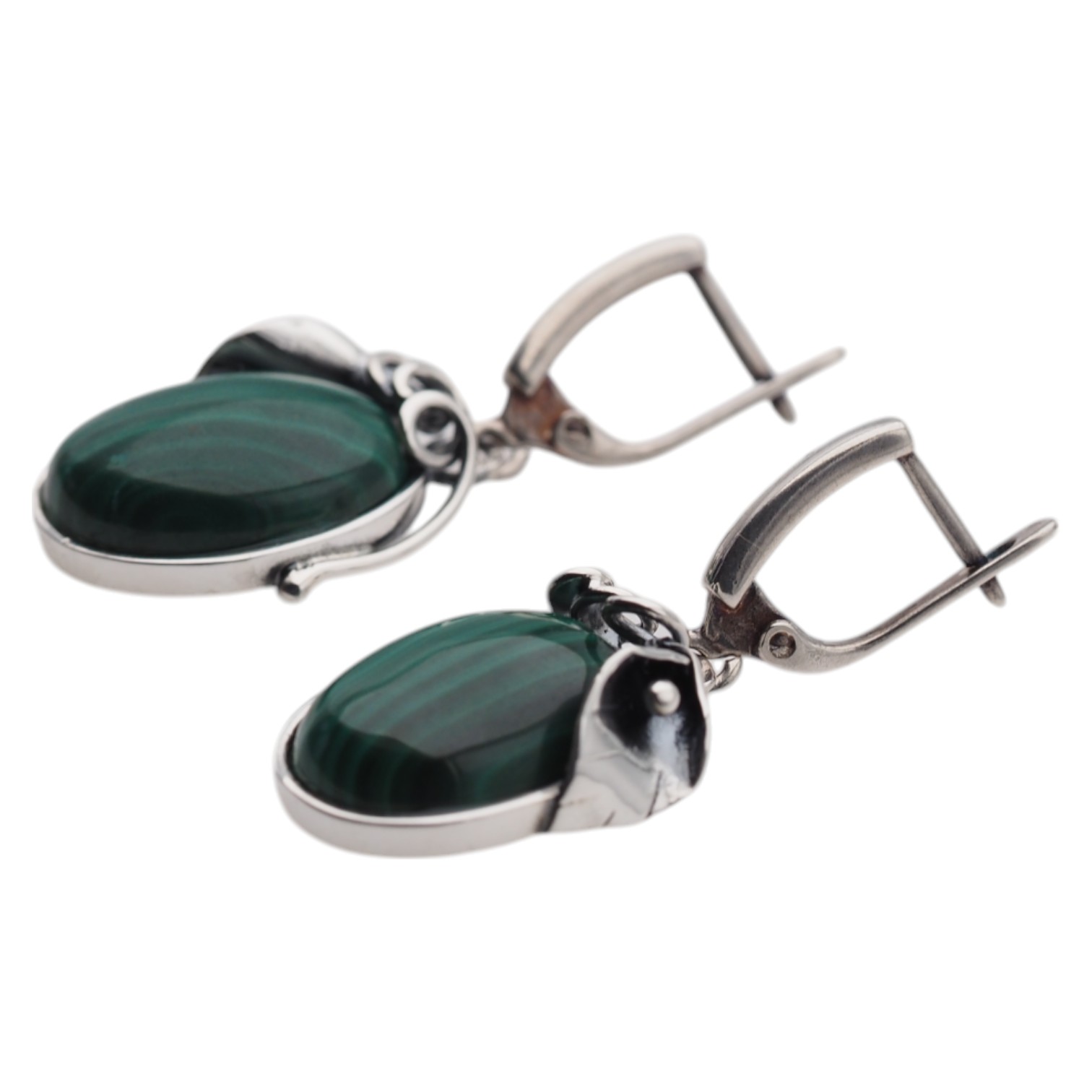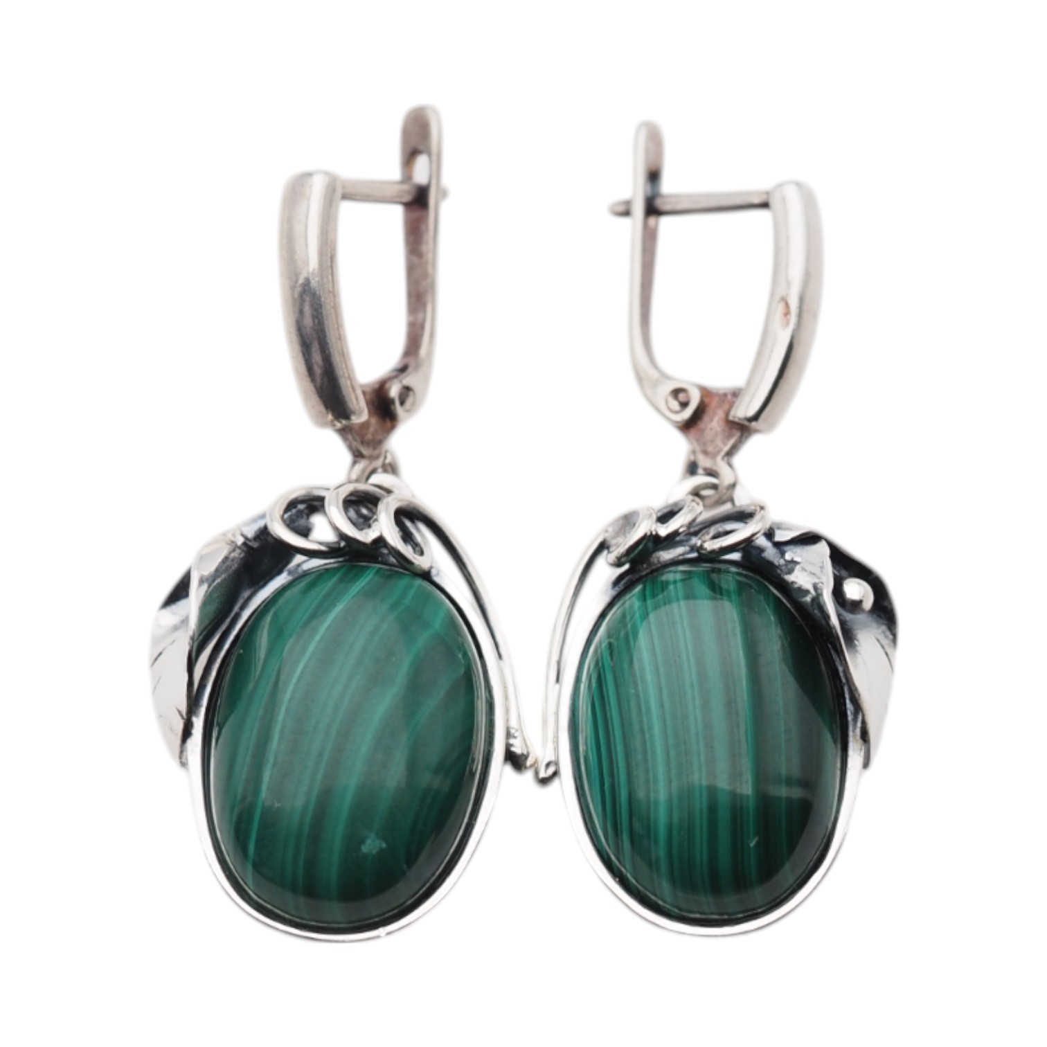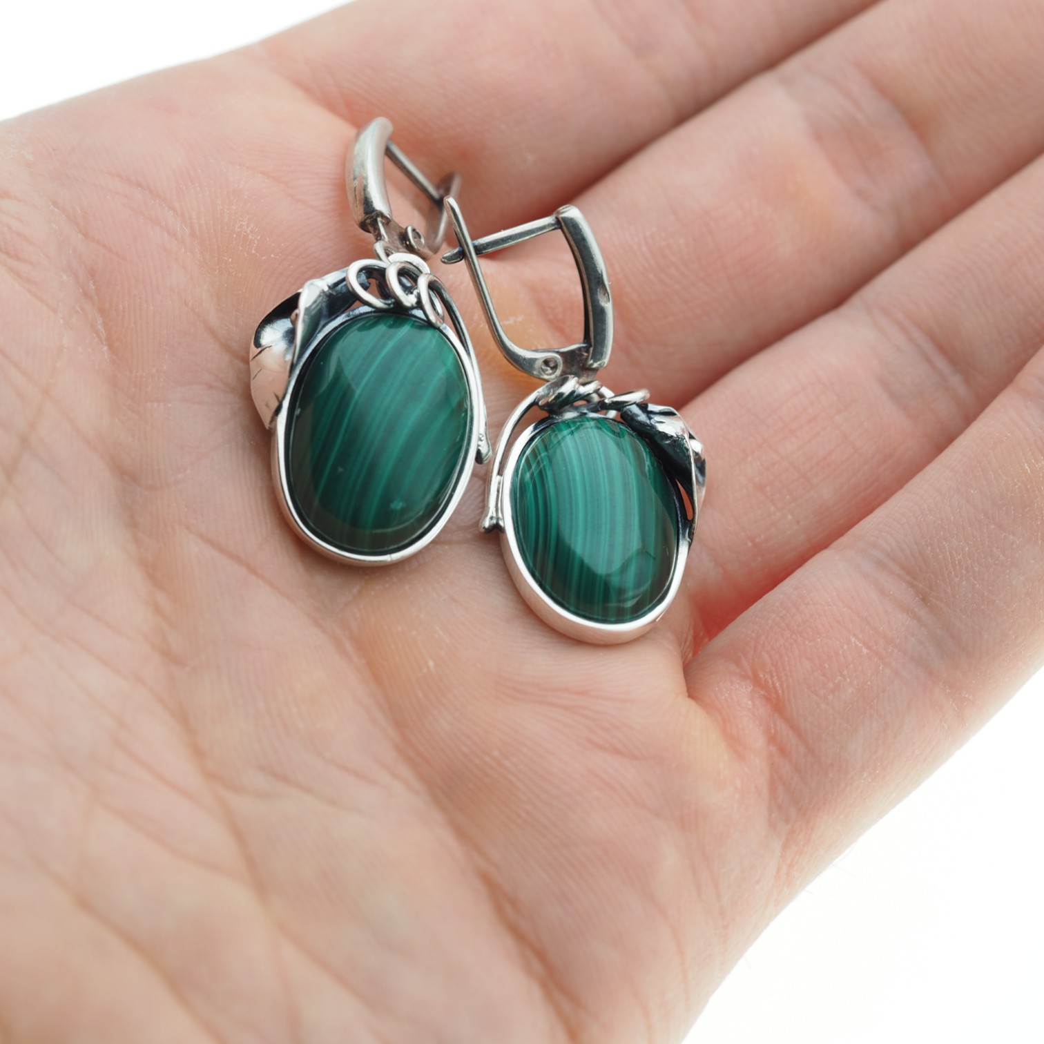 Kolczyki z naturalnym malachitem przyciągają wzrok głęboką zielenią i charakterystycznym, pasmowym rysunkiem kamienia. Owalne minerały zostały osadzone w srebrnej oprawie o dekoracyjnym motywie liści, a oksydowane srebro podkreśla detale i nadaje całości szlachetny, lekko vintage’owy charakter.