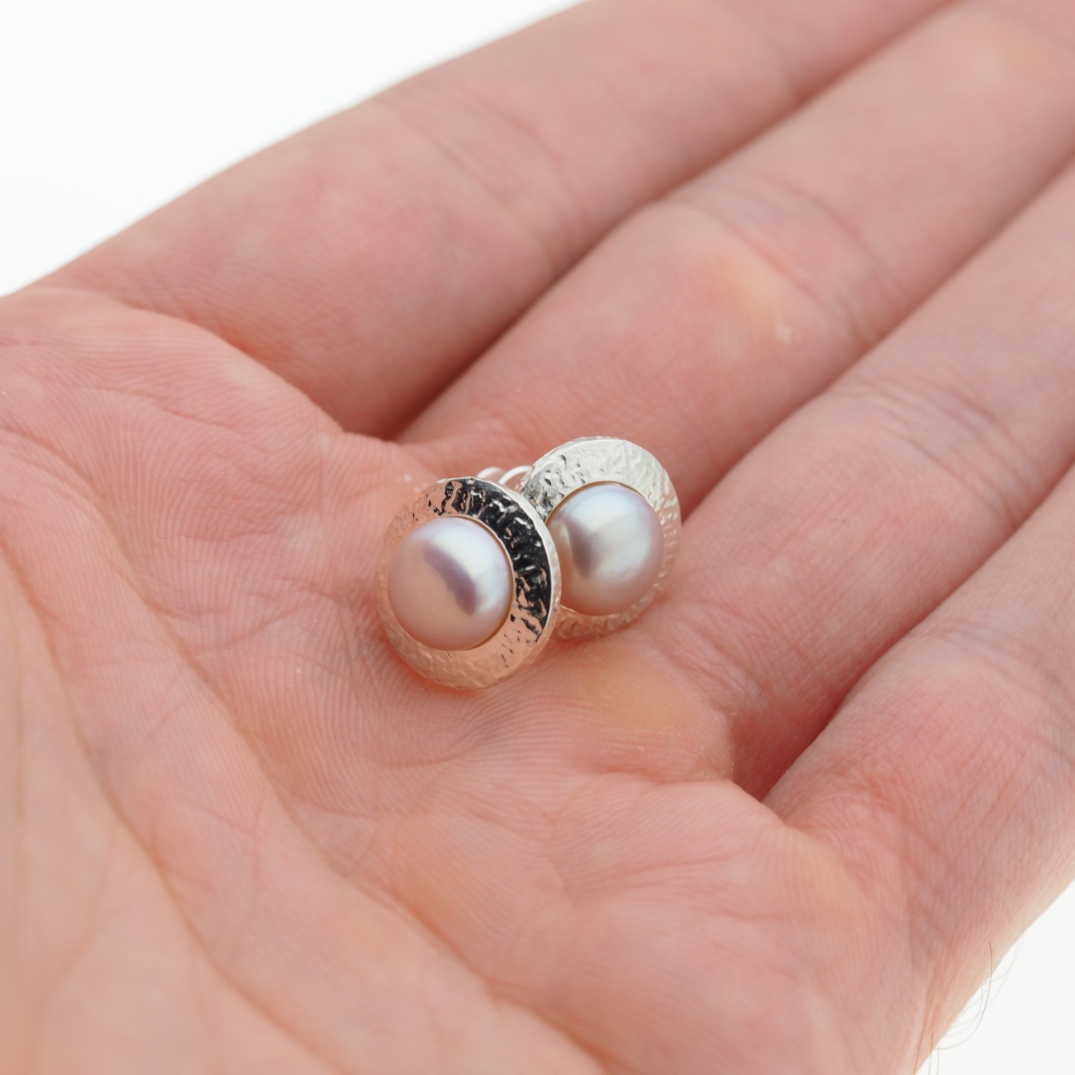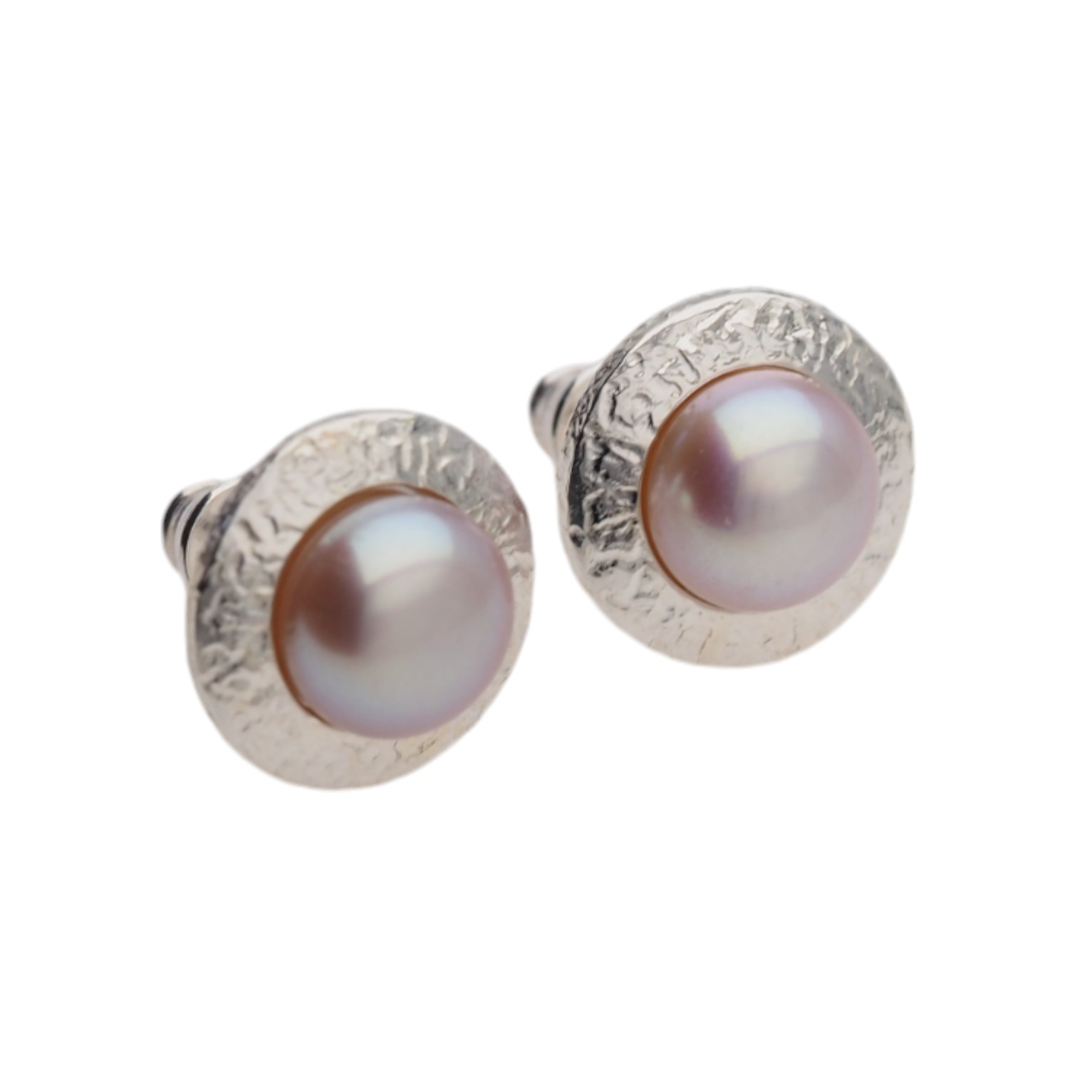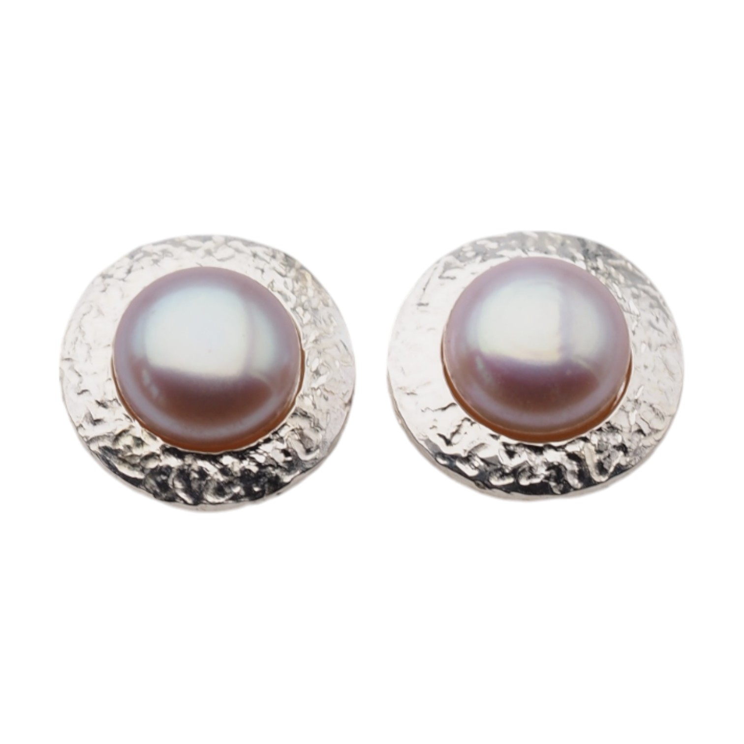 Delikatne kolczyki sztyfty z różową perłą o okrągłym kształcie to klasyka w subtelnym, kobiecym wydaniu. Naturalna perła słodkowodna hodowana ma miękki, pudrowy odcień, który pięknie współgra z jasnym blaskiem srebra. Oprawa ze srebra rodowanego o fakturze młotkowanej dodaje całości szlachetnego, lekko rzemieślniczego charakteru.