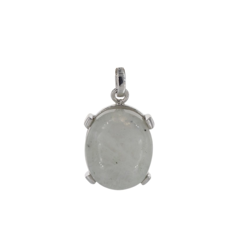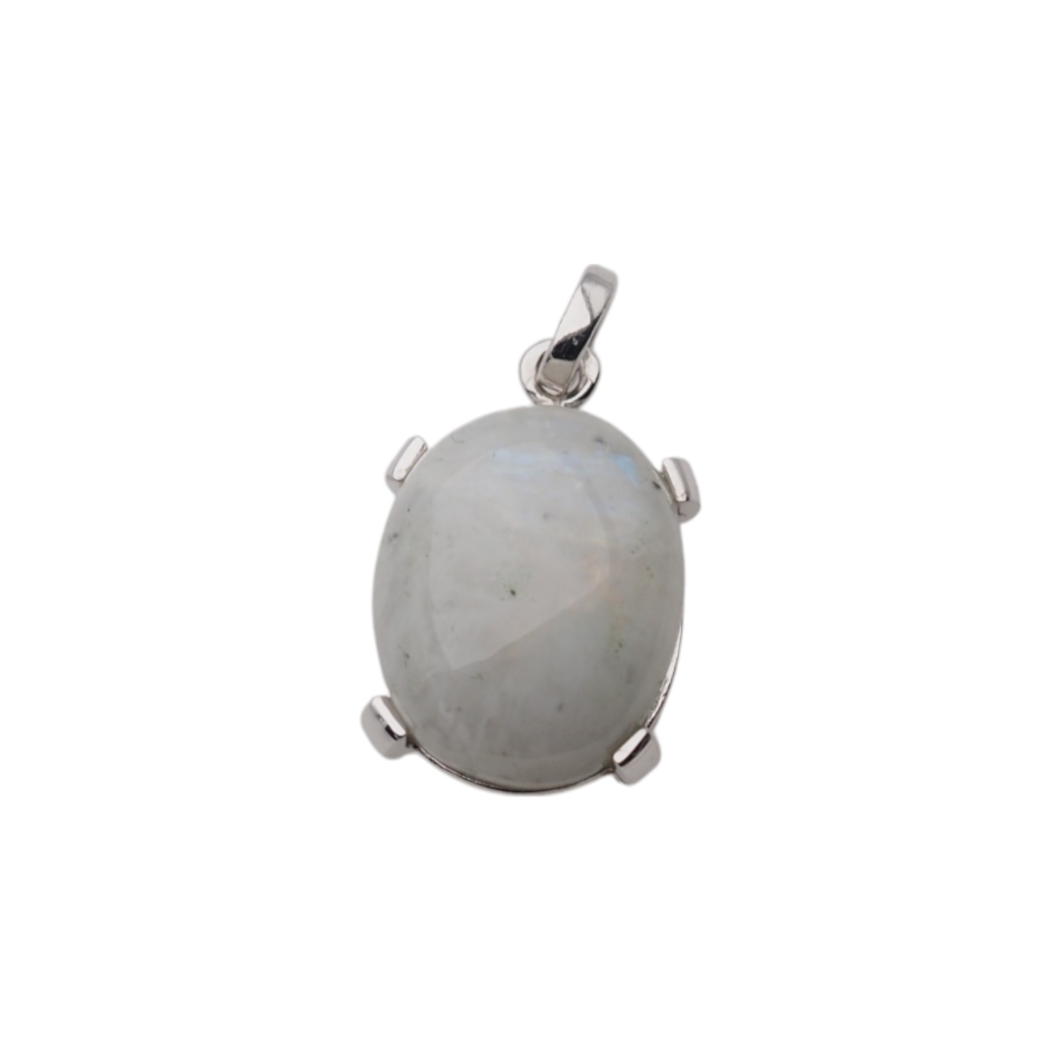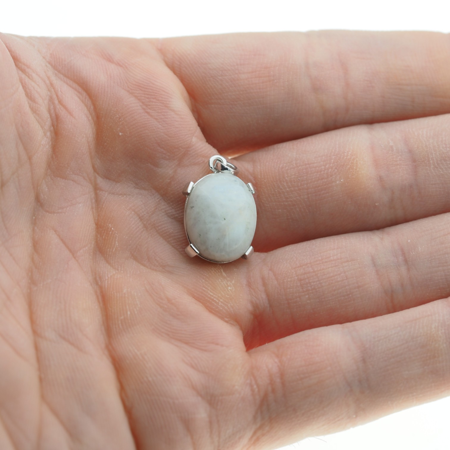 Ręcznie wykonany wisiorek z kamieniem księżycowym w owalnym kształcie przyciąga uwagę delikatnym połyskiem i charakterystyczną grą barw. Naturalny minerał osadzono w srebrnej, rodowanej oprawie, co nadaje całości elegancki i uporządkowany, jubilerski wygląd.