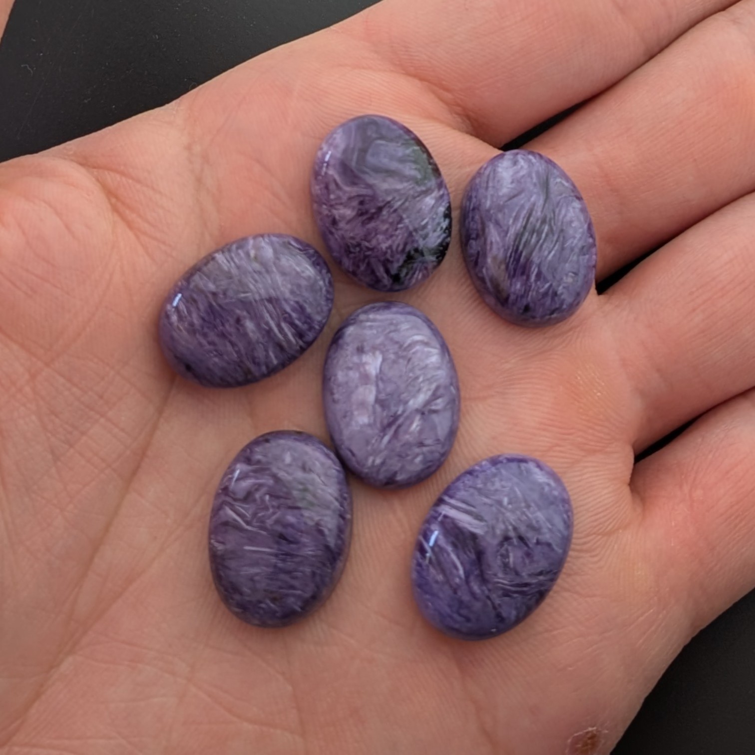 Naturalny czaroit w formie owalnego kaboszonu zachwyca głębokim, fioletowym kolorem i eleganckim, jubilerskim charakterem. To klasyczne „oczko do biżuterii”, które pięknie prezentuje się jako centralny punkt projektu.