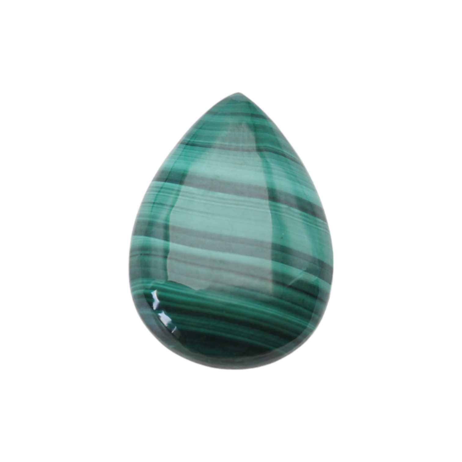 Naturalny malachit w kształcie łzy to kaboszon o intensywnie zielonej barwie, kojarzonej z charakterystycznym, dekoracyjnym rysunkiem kamienia. Wypolerowana powierzchnia podkreśla głębię koloru i nadaje elementowi elegancki, jubilerski wygląd.