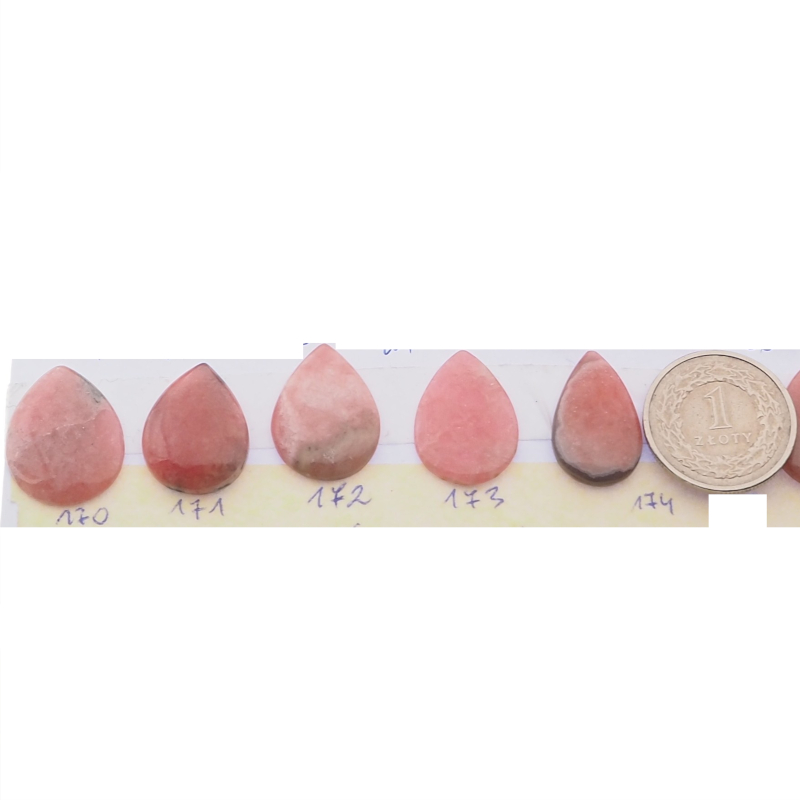 Kaboszon z naturalnego rodochrozytu w kształcie łzy to eleganckie „oczko” jubilerskie o wyraźnie różowej tonacji. Powierzchnia jest polerowana, a spód płaski, co ułatwia stabilne osadzenie i estetyczne wykończenie pracy.
