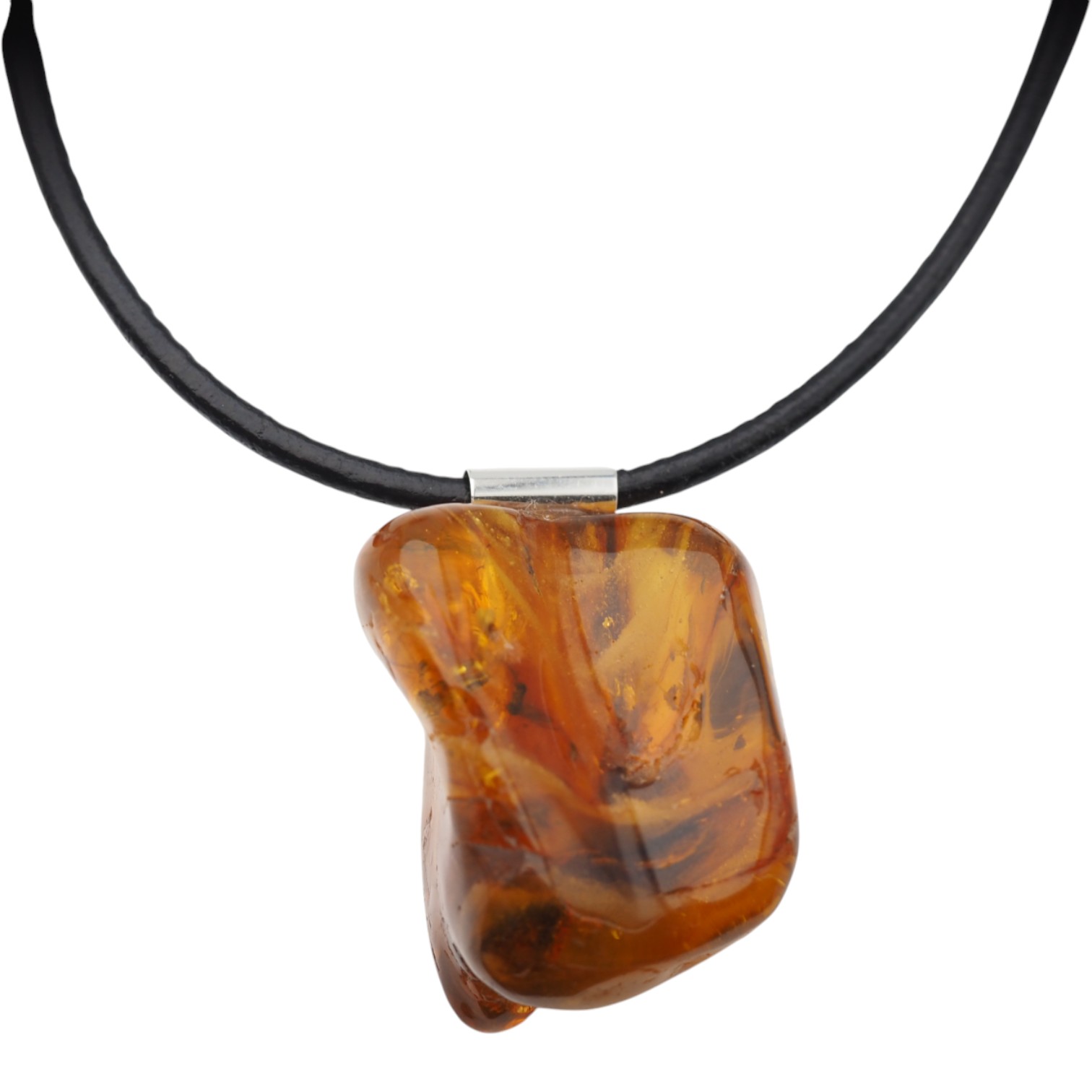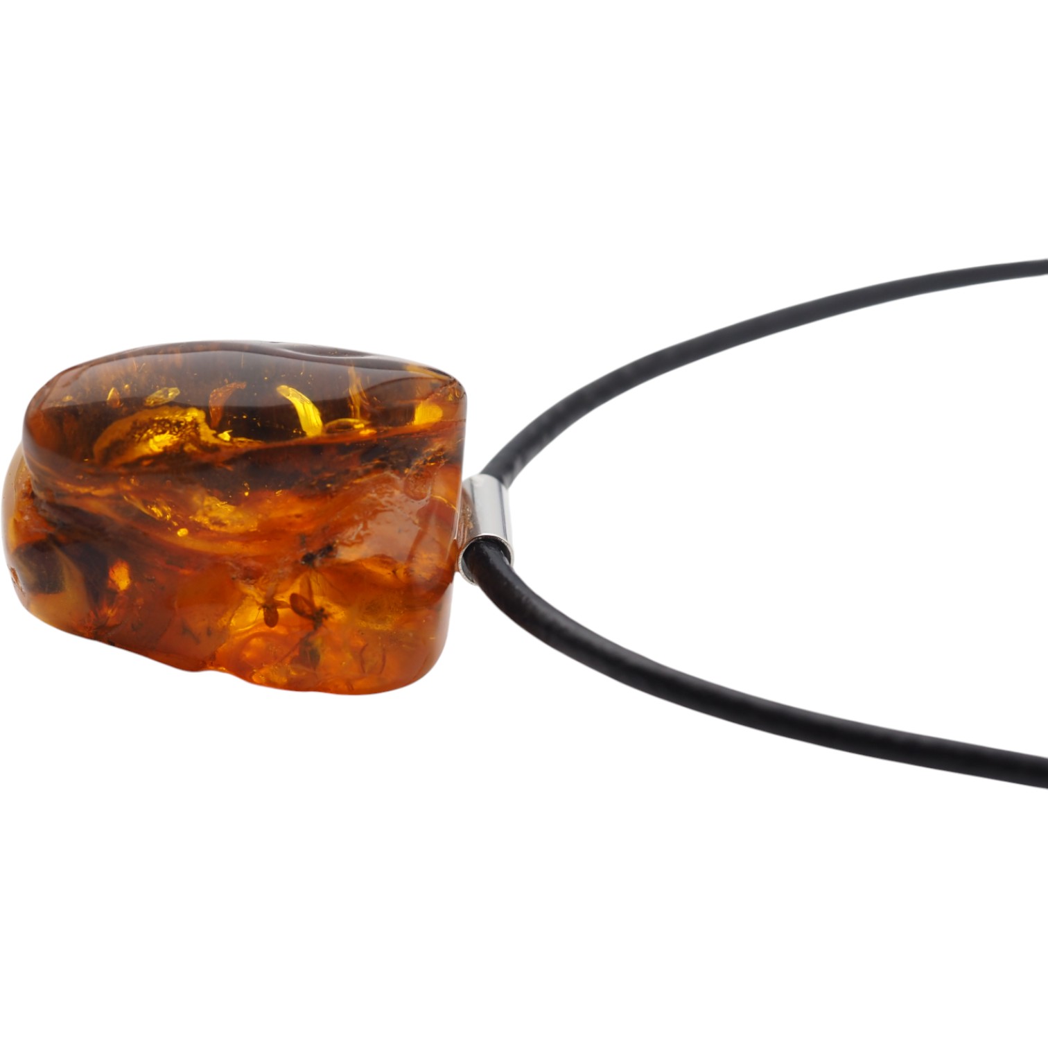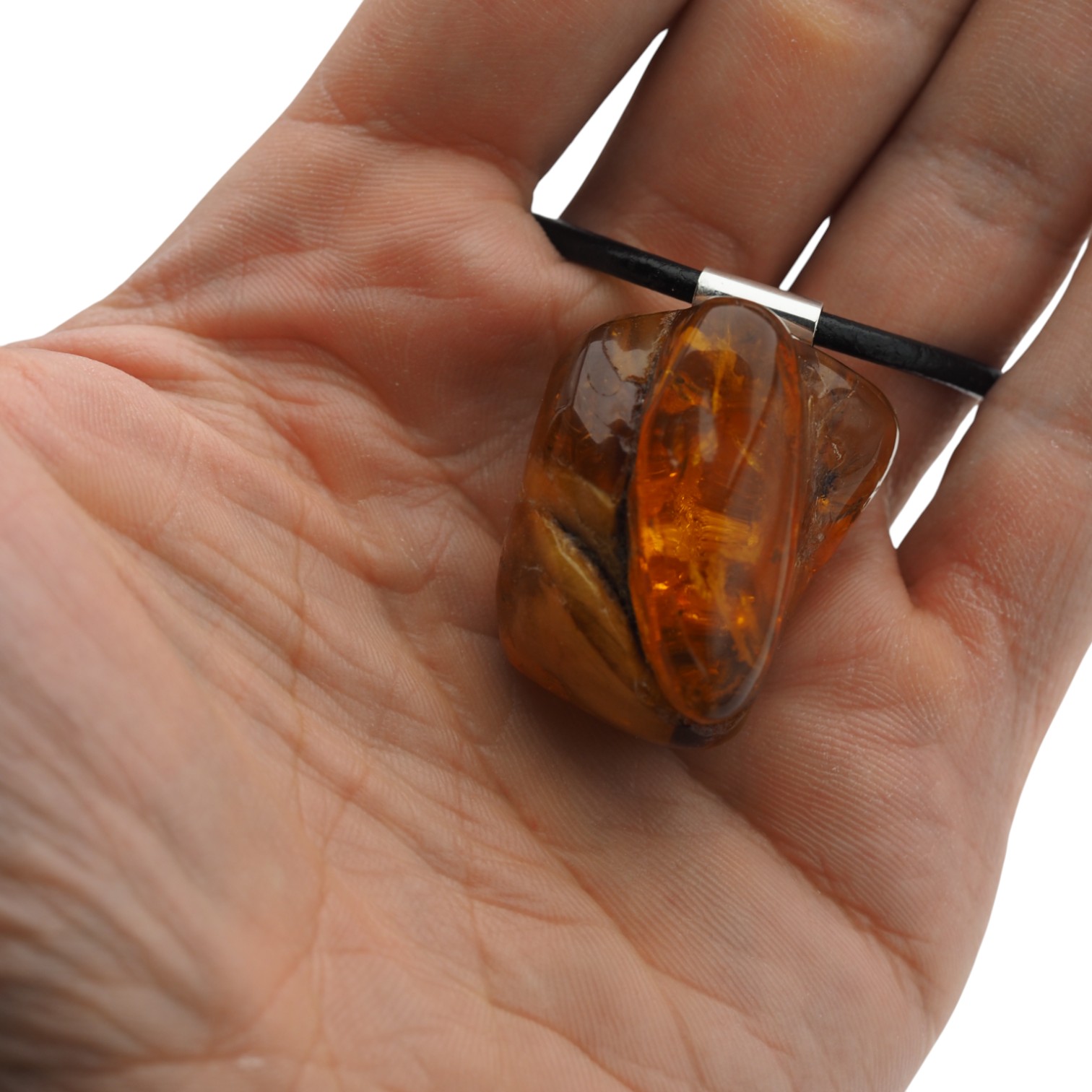 Ten naszyjnik z bursztynem przyciąga uwagę naturalnym, ciepłym odcieniem żywicy i wyjątkową inkluzją roślinną oraz trzema muszkami zatopionymi wewnątrz. Ręcznie wykonana zawieszka w srebrze próby 925 podkreśla kolekcjonerski charakter biżuterii i sprawia, że każdy egzemplarz wygląda jak mała, naturalna „pamiątka czasu”.