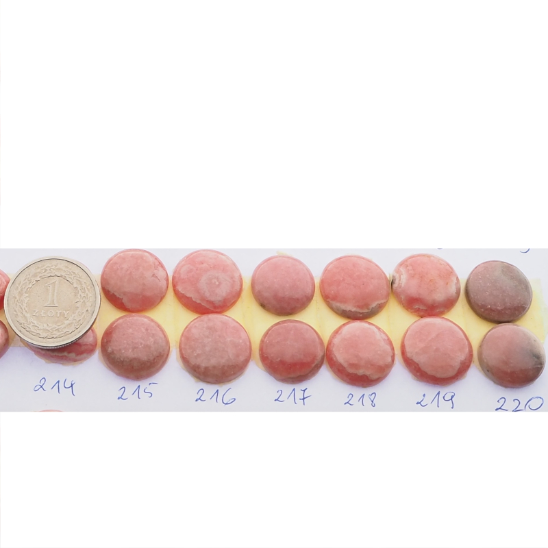Naturalny rodochrozyt w formie okrągłych kaboszonów zachwyca ciepłą, różową kolorystyką i charakterystycznym, kamiennym rysunkiem. Powierzchnia jest wypolerowana, a spód płaski, dzięki czemu kamień dobrze układa się w oprawie i wygodnie pracuje się z nim w projektach jubilerskich.