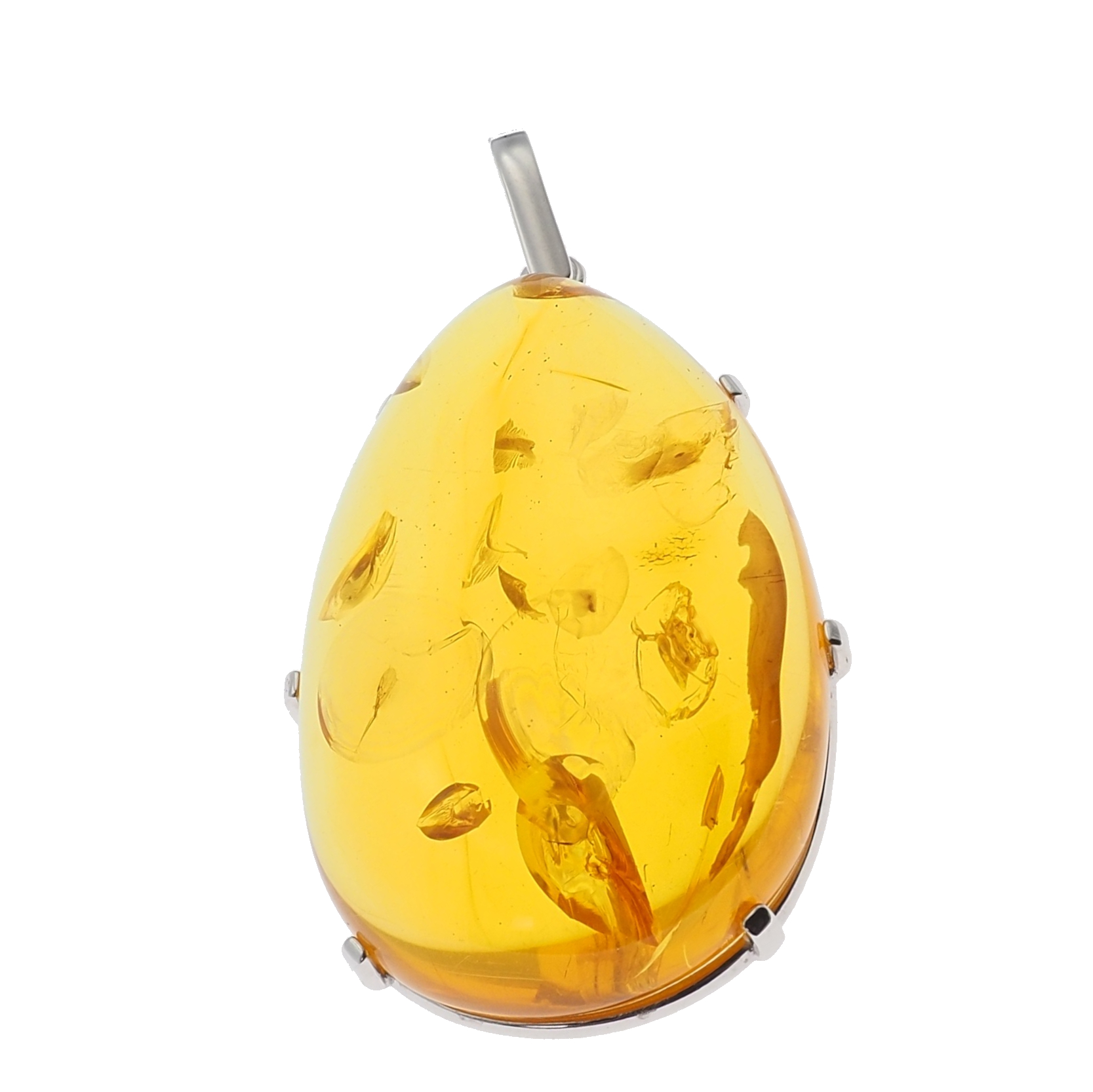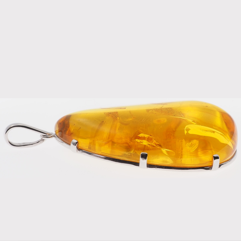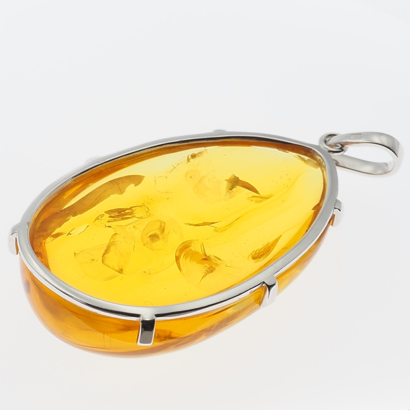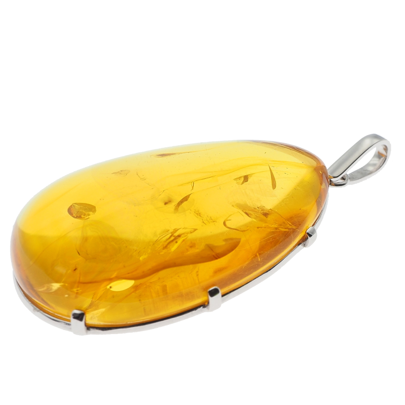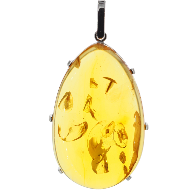 Zawieszka z naturalnym bursztynem przyciąga uwagę dużą, dekoracyjną bryłą i organicznym charakterem kamienia. W środku widoczne są szczątki roślinne, które nadają całości wyjątkowy, „zatopiony w czasie” efekt i sprawiają, że każda sztuka wygląda nieco inaczej. Oprawa wykonana jest ze srebra próby 925, co podkreśla szlachetny, jubilerski styl biżuterii.
