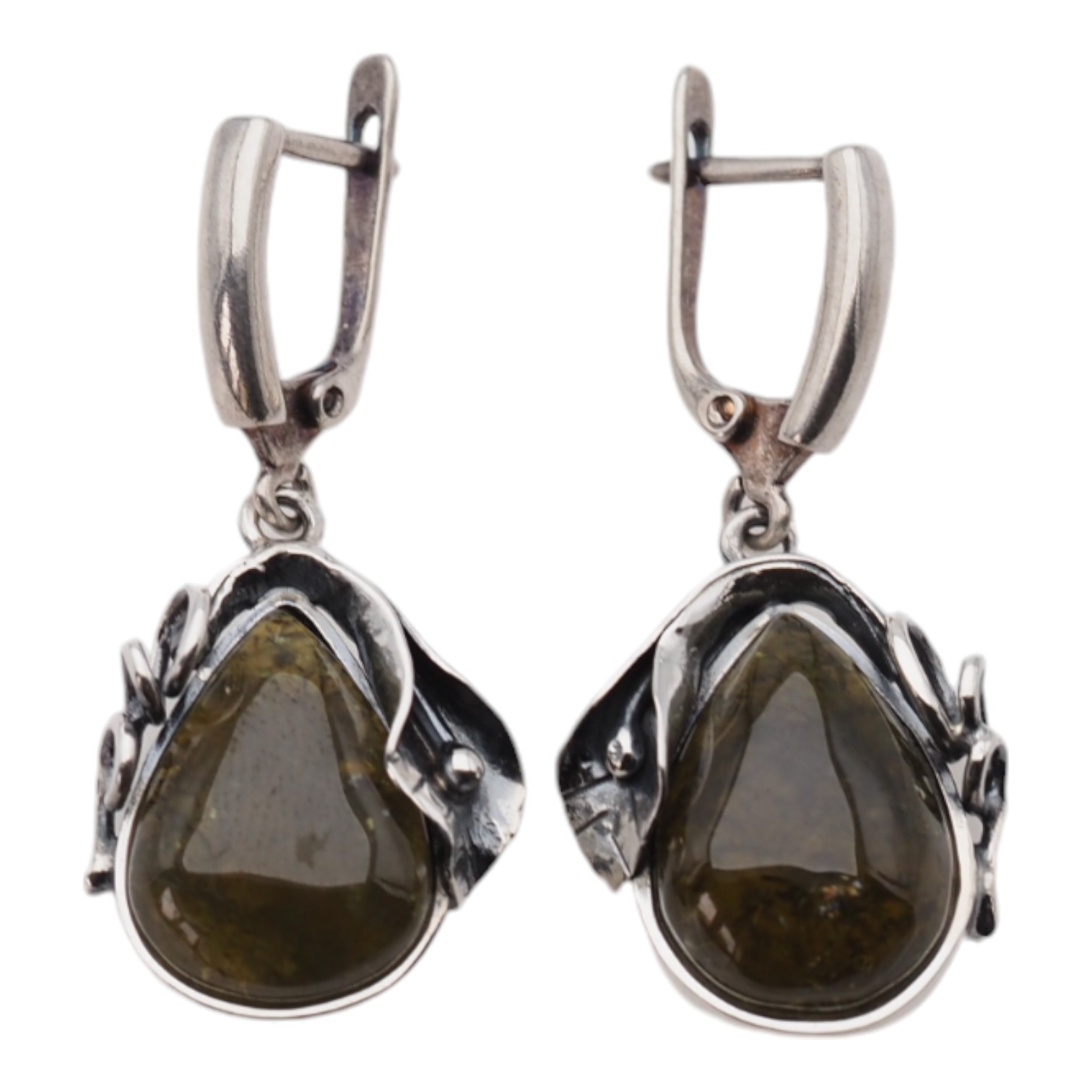 Kolczyki wiszące wykonane ręcznie z zielonym granatem w kształcie łzy przyciągają uwagę głęboką, leśną barwą i eleganckim połyskiem minerału. Kamień osadzono w srebrnej oprawie z dekoracyjnym motywem liścia, co nadaje całości naturalny, lekko botaniczny charakter.