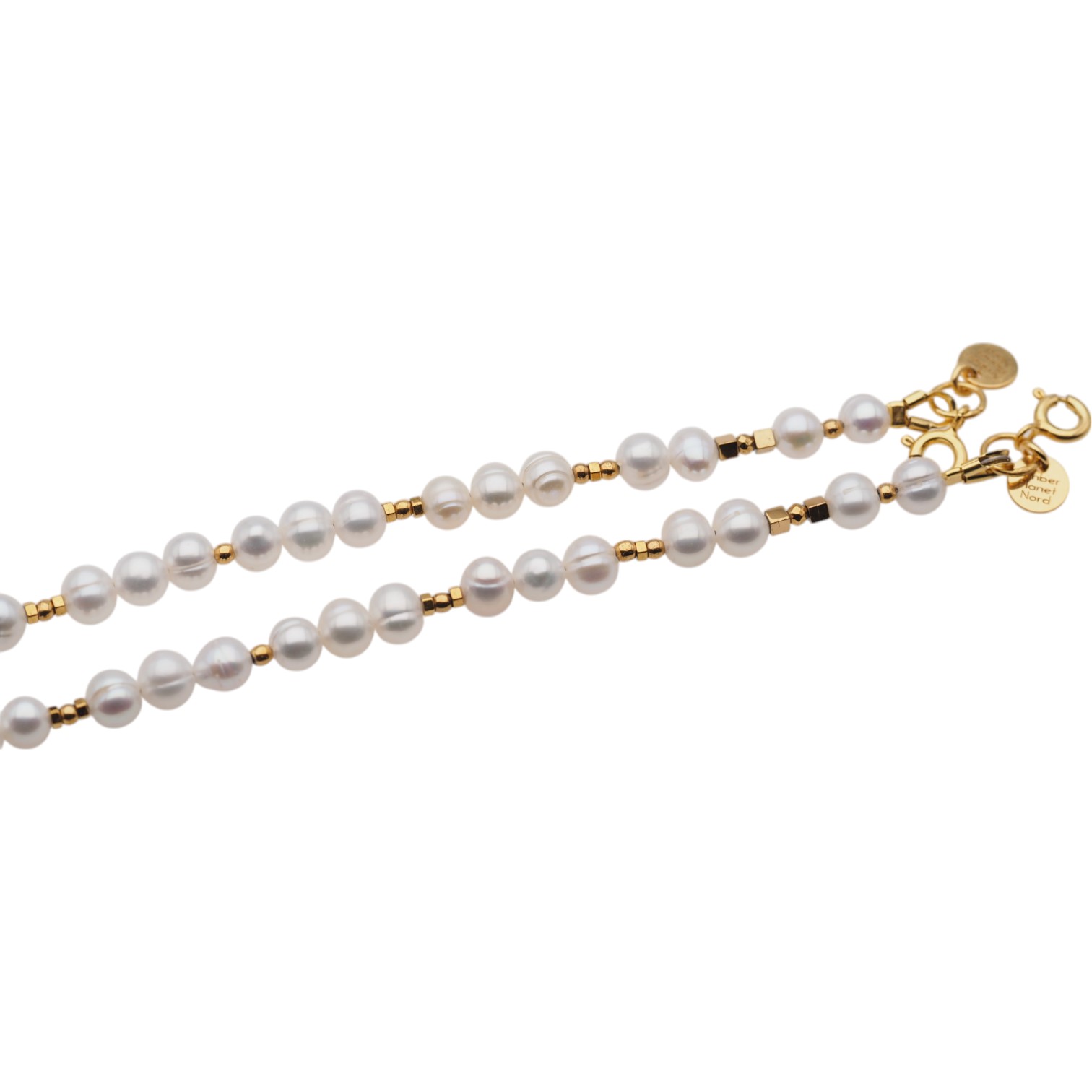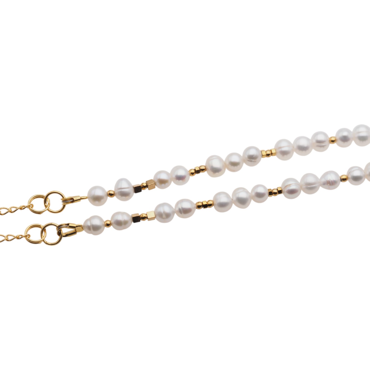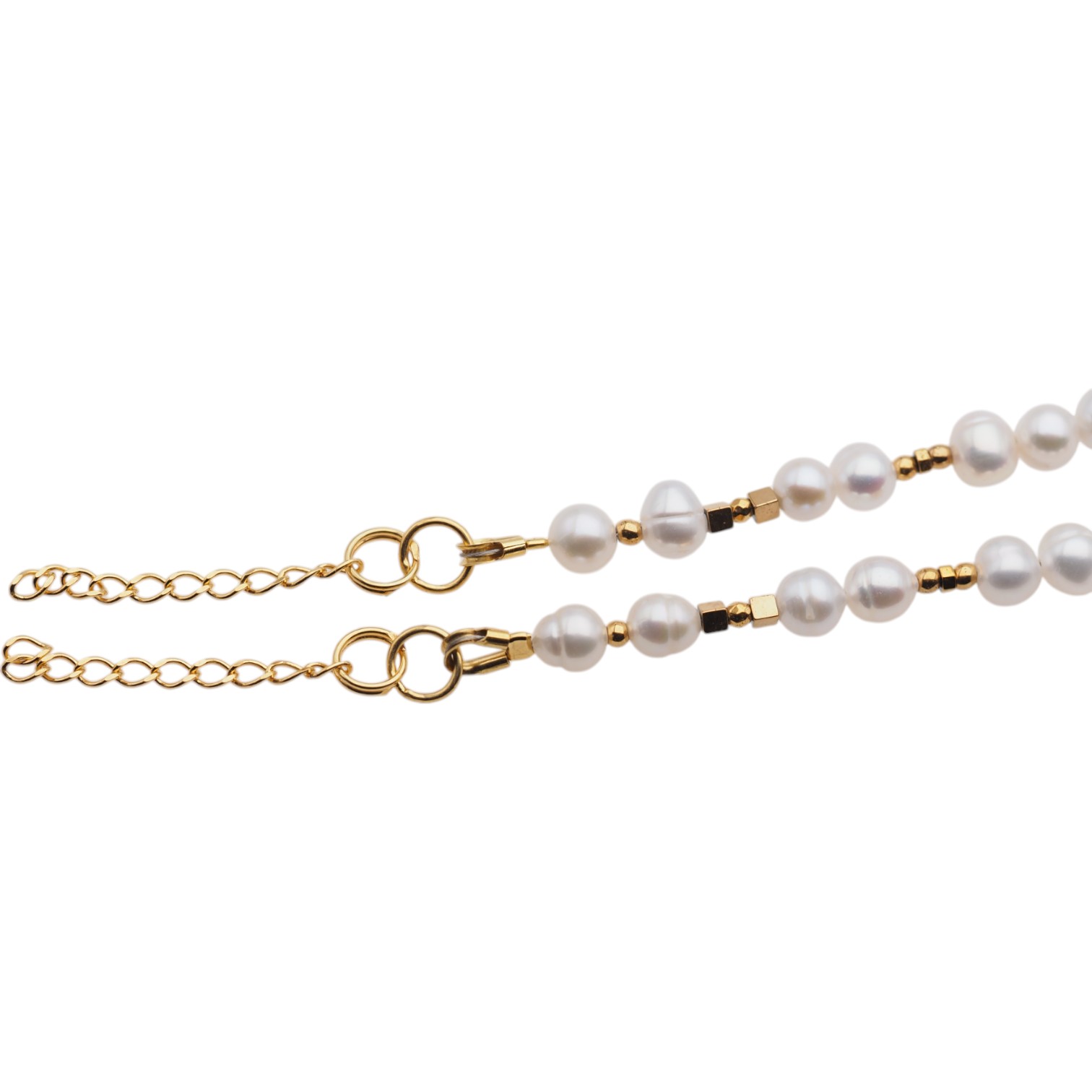 Delikatna bransoletka z białych, hodowanych pereł słodkowodnych uzupełnionych złotym hematytem tworzy elegancką, świetlistą kompozycję. Złocone srebro 925 dodaje całości ciepłego blasku, a stalowa linka podkreśla nowoczesny, uporządkowany charakter biżuterii.