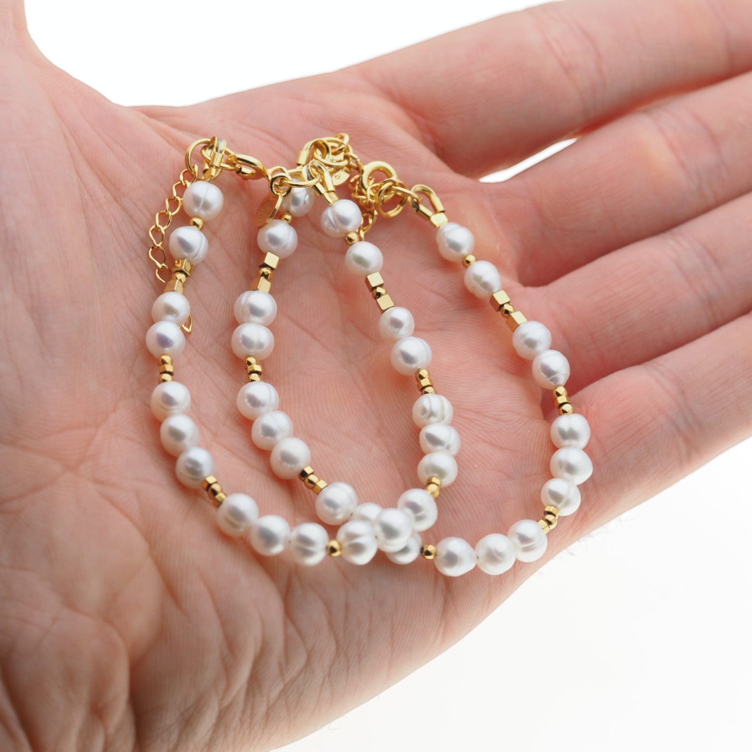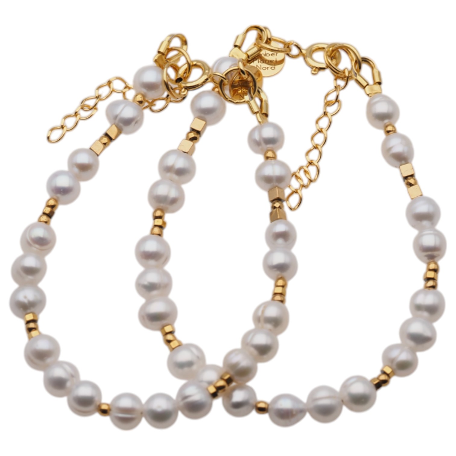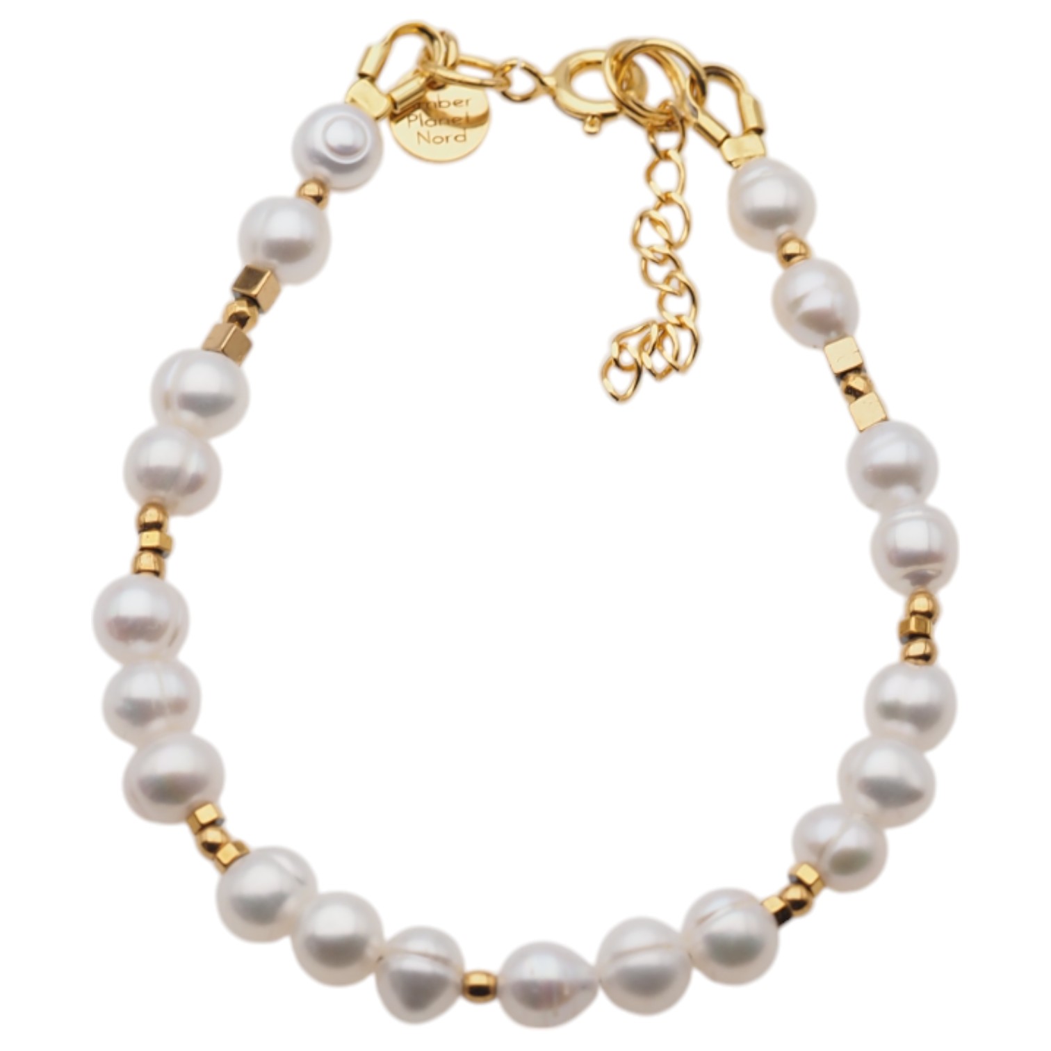 Delikatna bransoletka z białych, hodowanych pereł słodkowodnych uzupełnionych złotym hematytem tworzy elegancką, świetlistą kompozycję. Złocone srebro 925 dodaje całości ciepłego blasku, a stalowa linka podkreśla nowoczesny, uporządkowany charakter biżuterii.