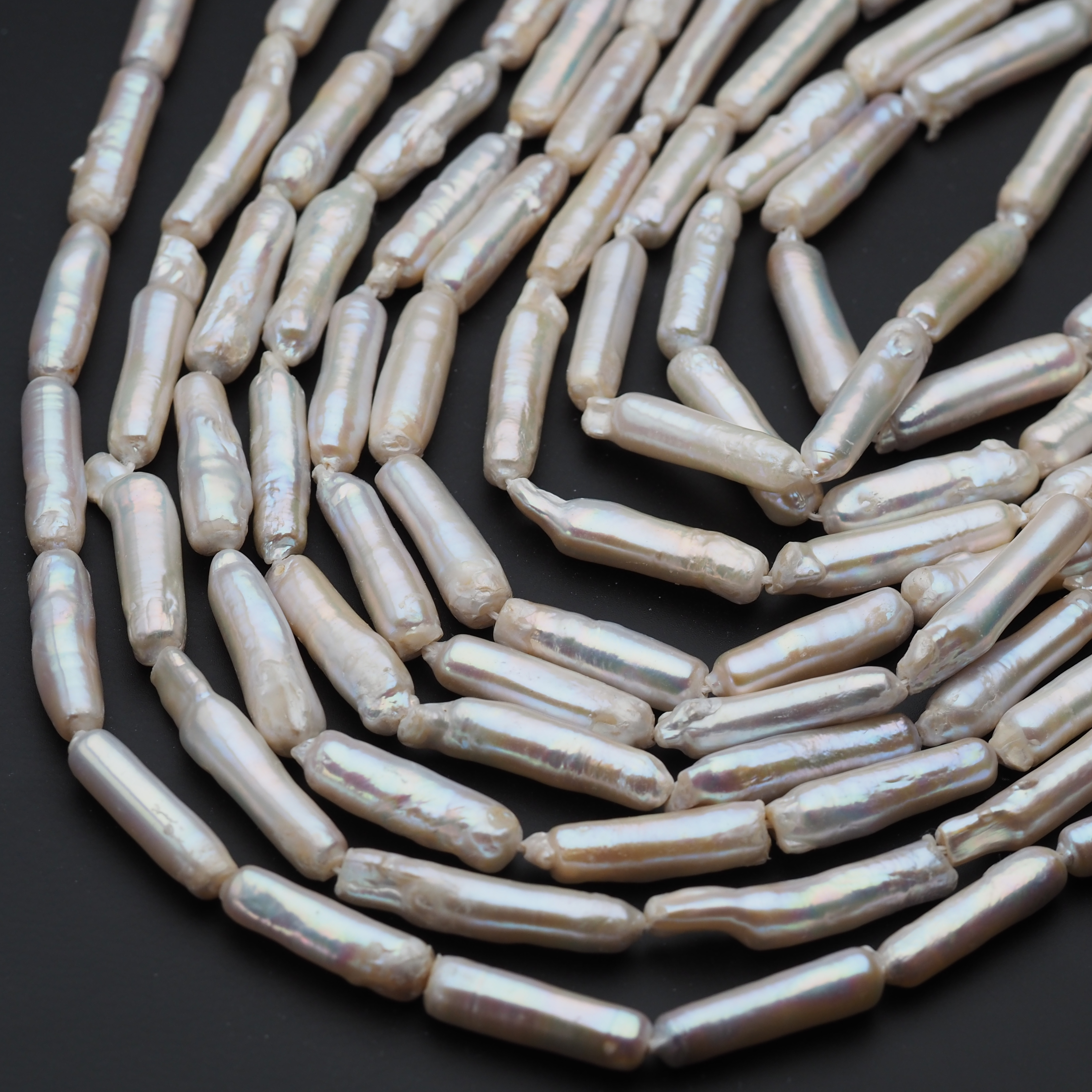 Naturalne Perły Hodowane (słodkowodne) białe w kształcie patyczków, wiercone wzdłuż.