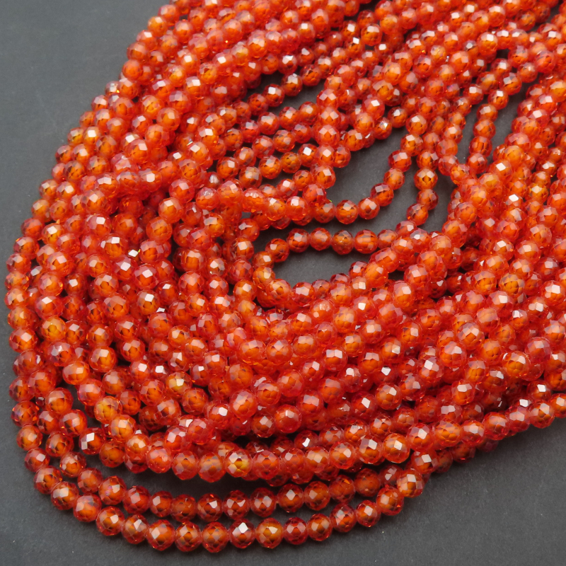 Cyrkon syntetyczny w formie fasetowanych kulek o średnicy 3 mm, nawleczony na sznur o długości około 38 cm. Kamienie mają intensywny, pomarańczowy kolor z subtelnym połyskiem i wyraźnym efektem rozszczepienia światła przypominającym diament. Dzięki perfekcyjnemu szlifowi fasetowemu wyróżniają się wysokim blaskiem i przejrzystością.