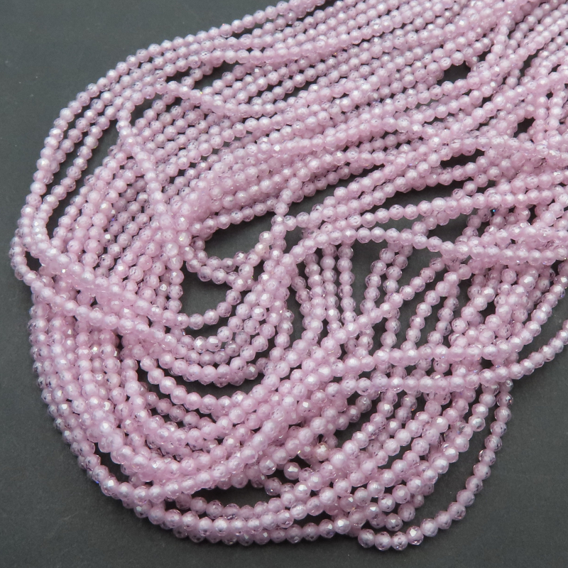 Cyrkon syntetyczny w formie fasetowanych kulek o średnicy 2 mm, nawleczony na sznur o długości około 38 cm. Kamienie mają delikatny różowy kolor o diamentowym połysku i wyjątkowej przejrzystości. Dzięki precyzyjnemu szlifowi fasetowemu pięknie odbijają światło, tworząc subtelny, luksusowy efekt blasku.