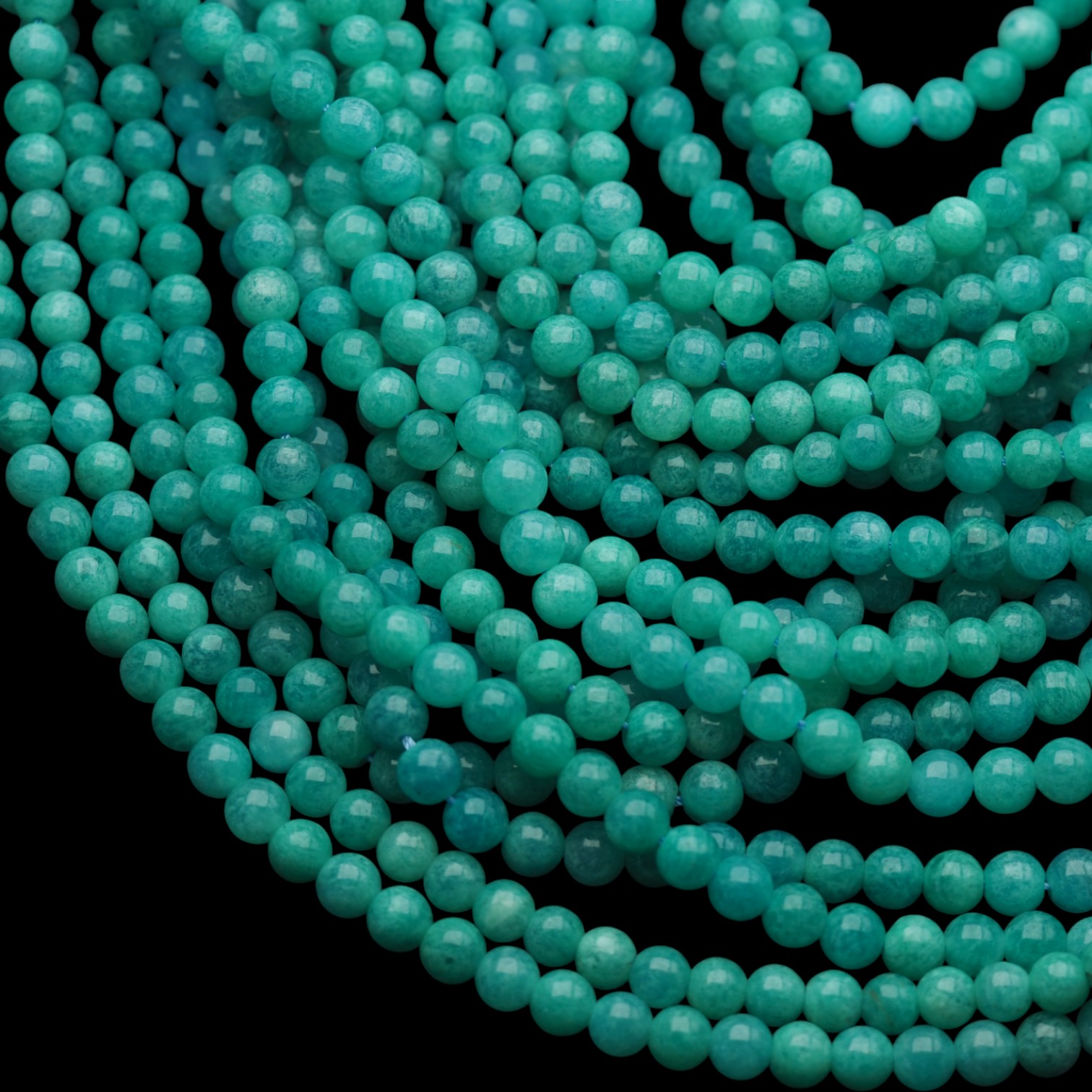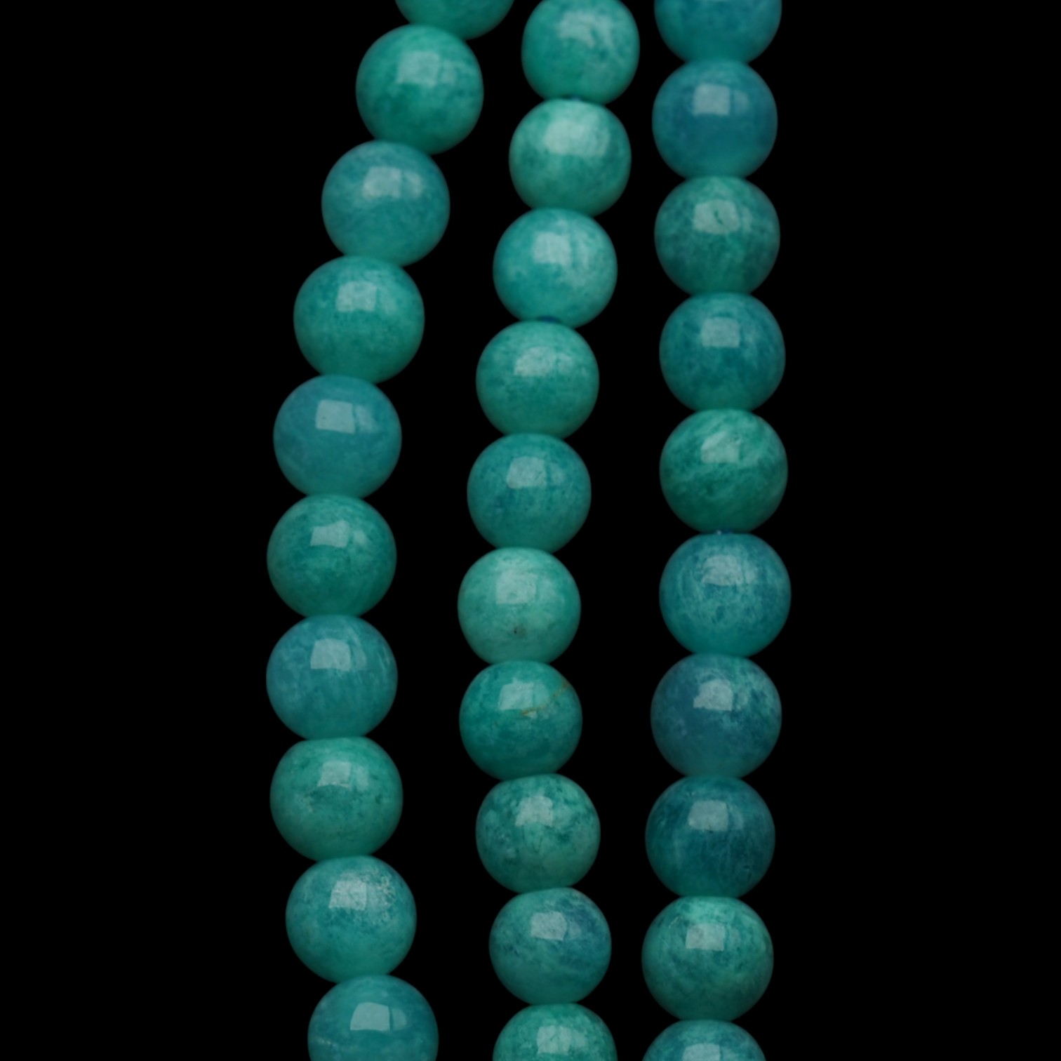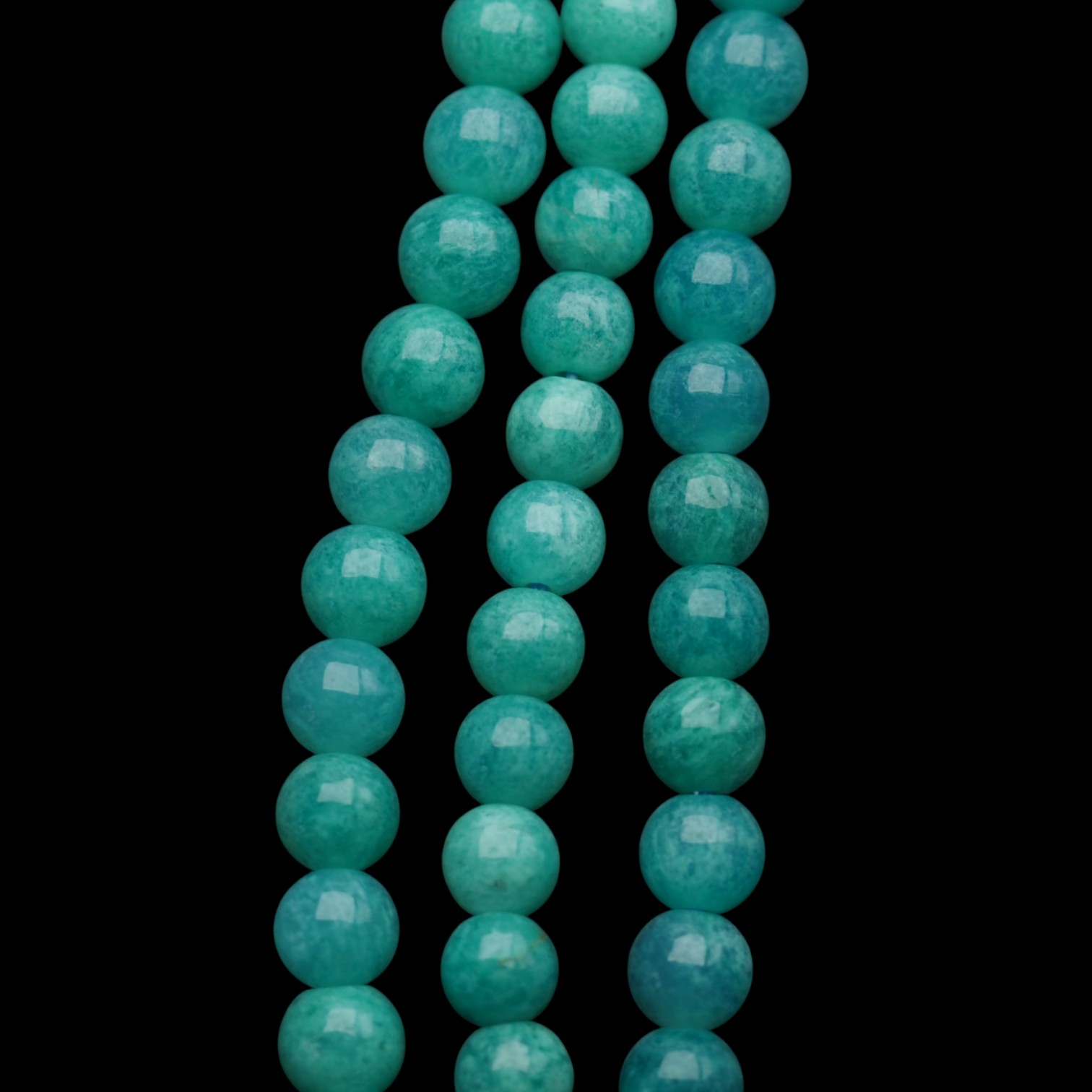 Naturalny amazonit w formie gładkich kulek o średnicy ok. 6 mm, nawleczony na sznur o długości około 38 cm. Kamienie mają piękny turkusowo-zielony kolor z subtelnymi, białymi przejściami, które nadają im naturalny i elegancki wygląd. Polerowana powierzchnia zapewnia delikatny połysk, podkreślając strukturę i barwę minerału.