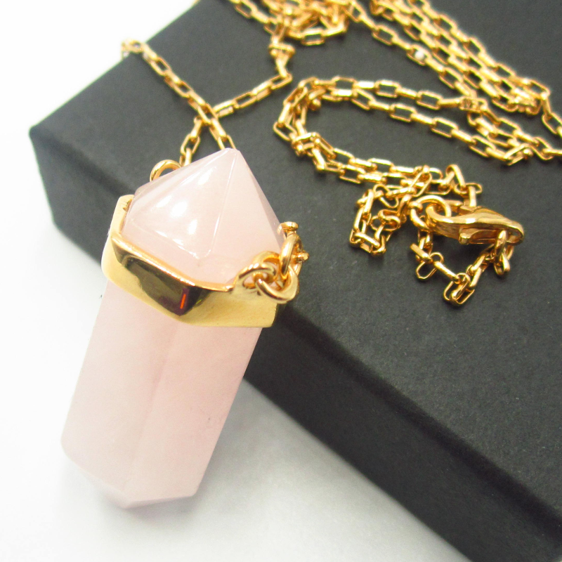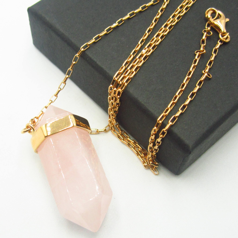 Naszyjnik - sopel Kwarc Różowy w okuciu na łańcuszku. Srebro złocone próba 925.