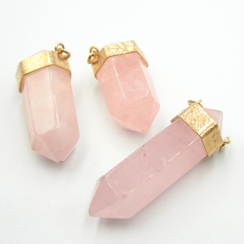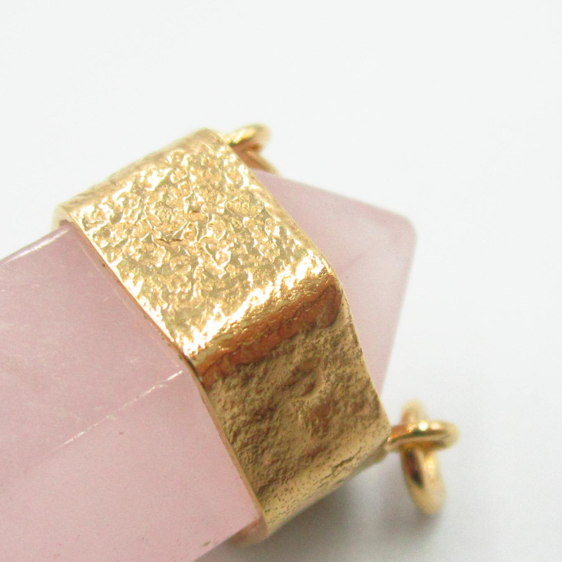 Zawieszka w formie smukłego sopla wykonana z naturalnego kwarcu różowego przyciąga delikatnym, mleczno-różowym odcieniem i subtelnymi, naturalnymi niuansami kamienia. Całość uzupełnia młotkowane srebro złocone 24K (próba 925), które dodaje biżuterii ciepłego blasku i eleganckiego wykończenia.