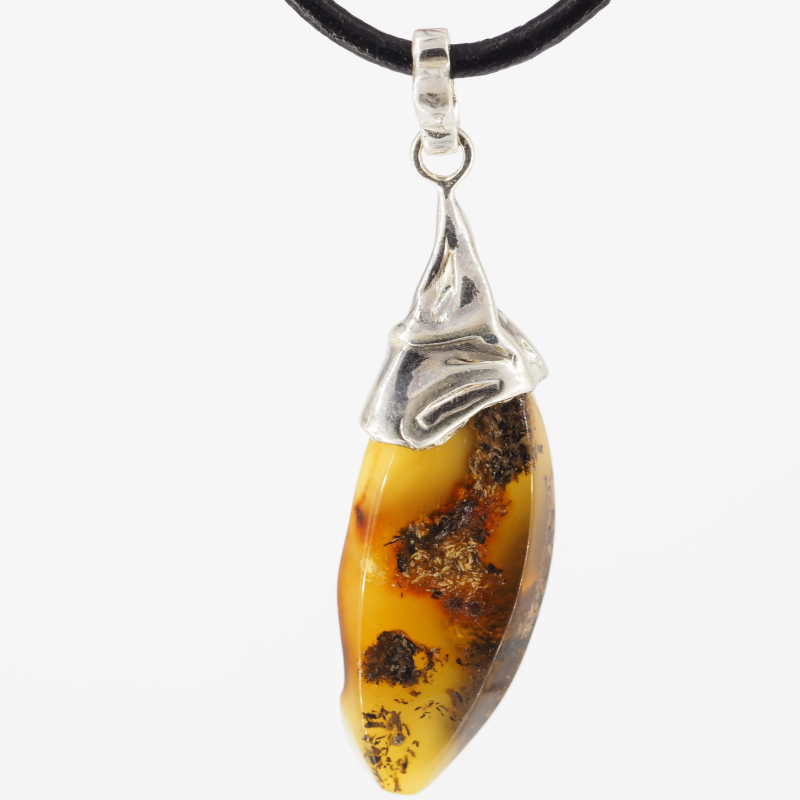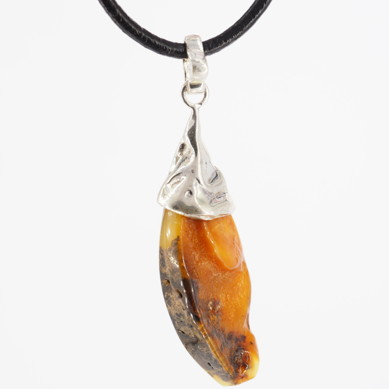 Naturalny Bursztyn bałtycki i srebro oksydowane - naszyjnik na rzemieniu