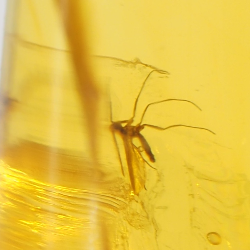 W środku zatopiony przed milionami lat mały komar i pęcherzyki powietrza.