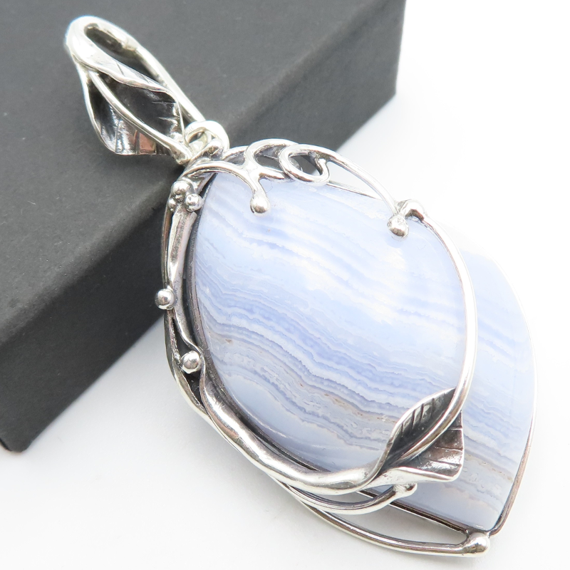 Półszlachetny kamień naturalny w srebrnej oprawie z motywem listka.