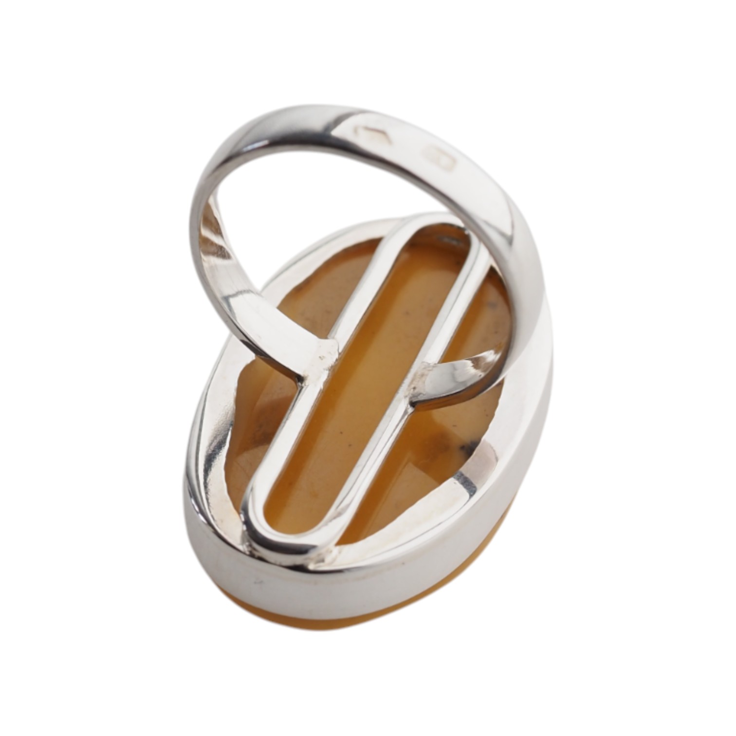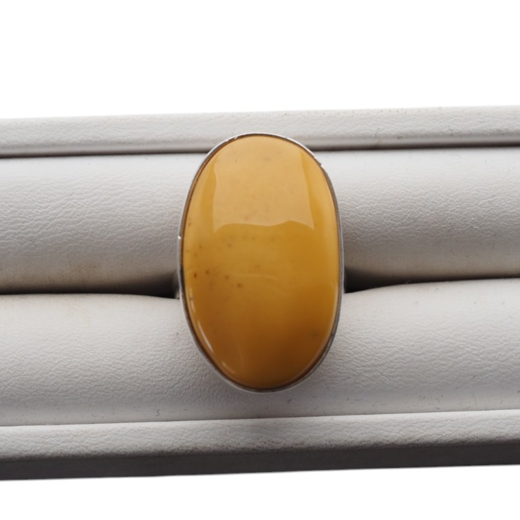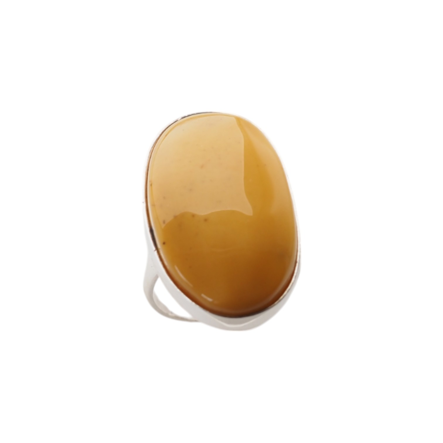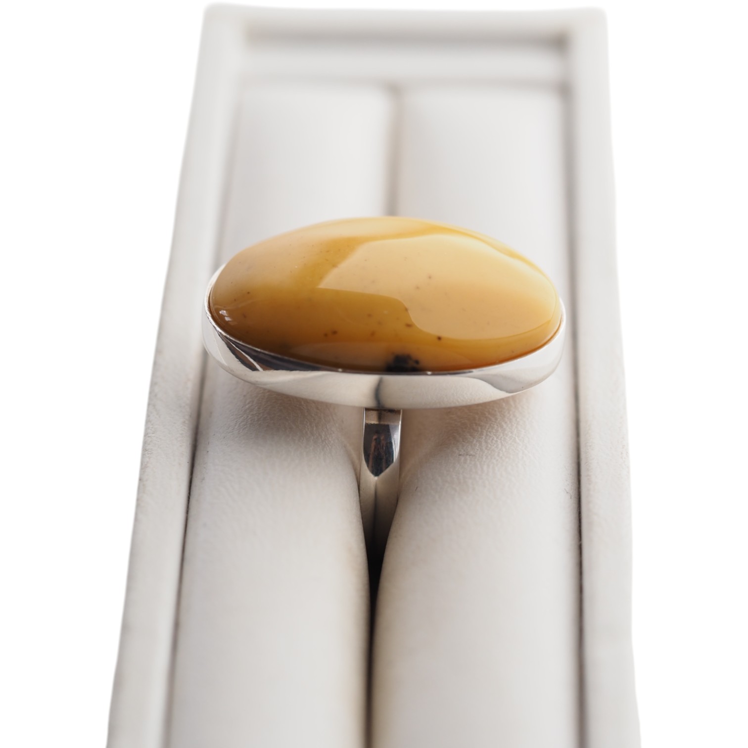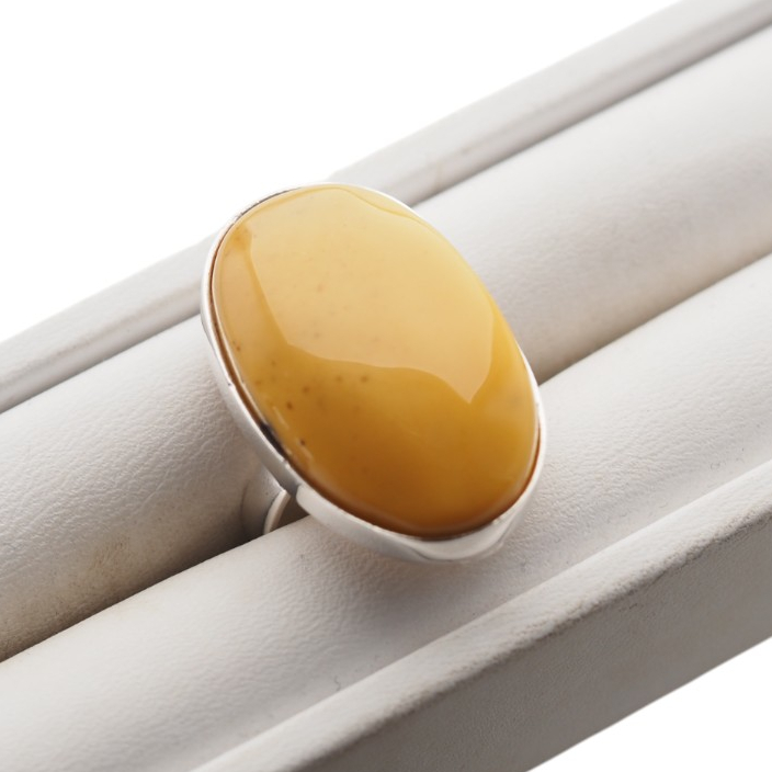 Ręcznie wykonany pierścionek z naturalnym bursztynem mlecznym w owalnym kształcie, osadzony w srebrze próby 925.
