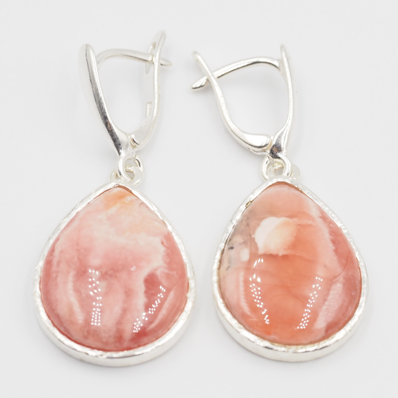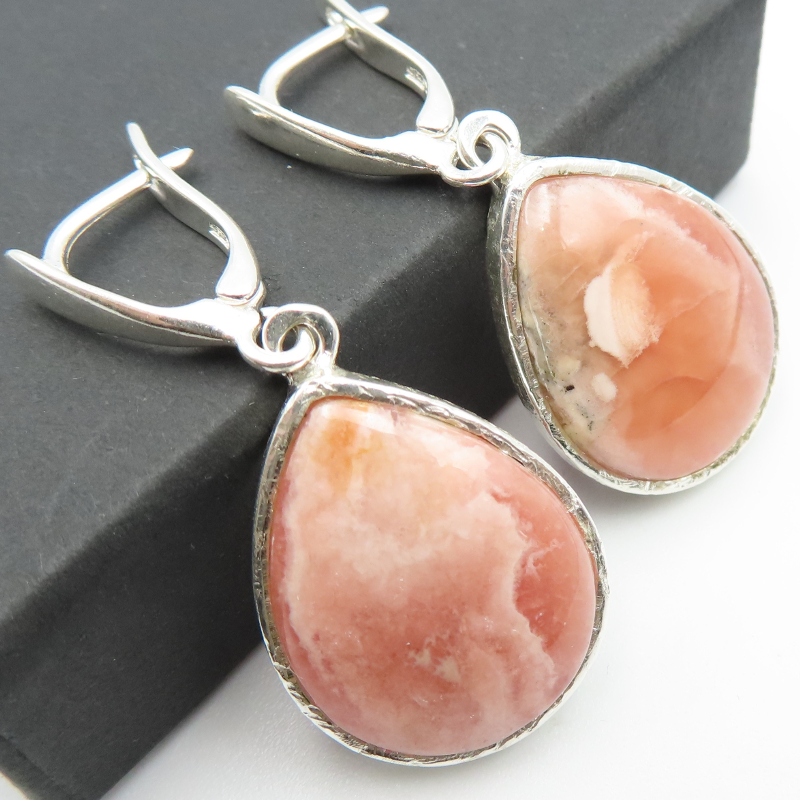 Kolczyki z naturalnym rodochrozytem przyciągają wzrok odcieniami różu i charakterystycznym, niepowtarzalnym rysunkiem kamienia. Kamienie mają kształt łzy i są osadzone w srebrnej oprawie, której młotkowane wykończenie dodaje całości szlachetnej, rzemieślniczej faktury.