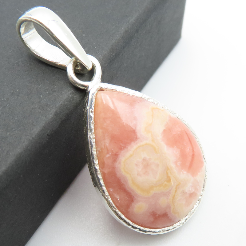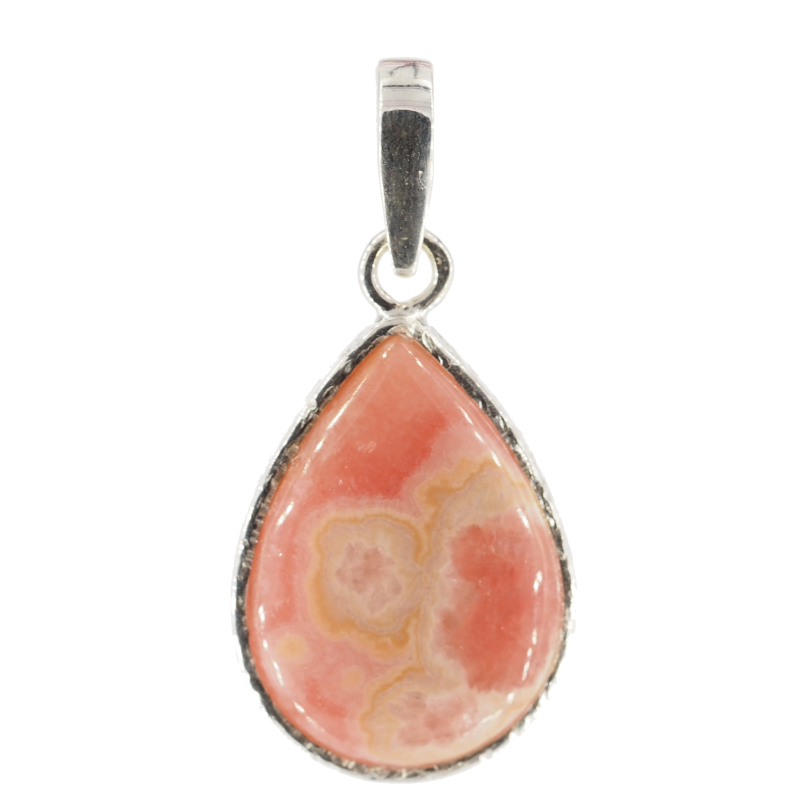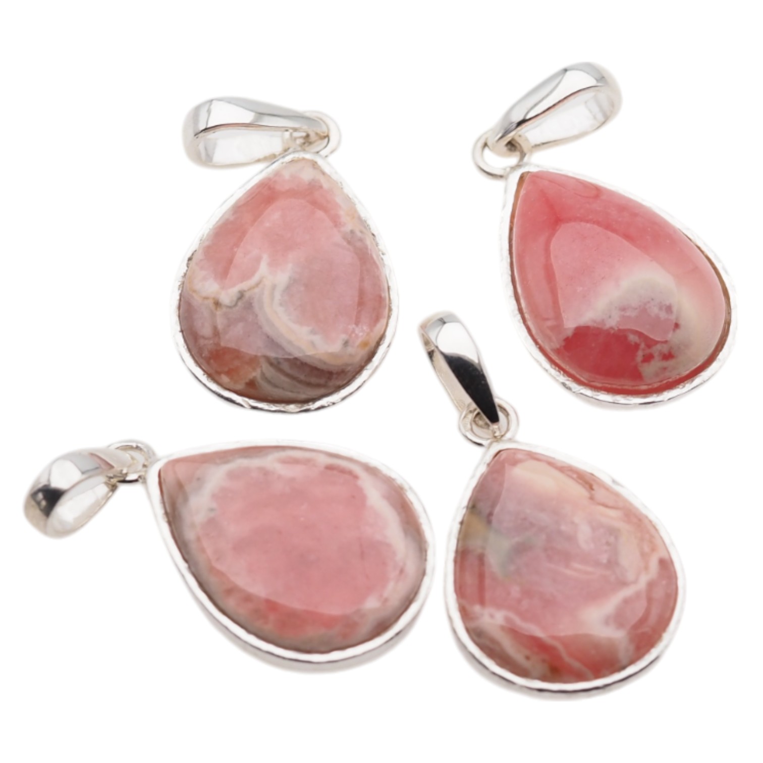 Ręcznie wykonana zawieszka z naturalnym rodochrozytem w kształcie łzy zachwyca ciepłą, różowo-malinową tonacją i miękkim, organicznym rysunkiem kamienia. Każdy egzemplarz różni się odcieniem i użyleniem, co podkreśla unikalny charakter biżuterii. Całość osadzono w srebrnej, młotkowanej oprawie, która dodaje jej szlachetnej faktury i lekko artystycznego wyrazu.