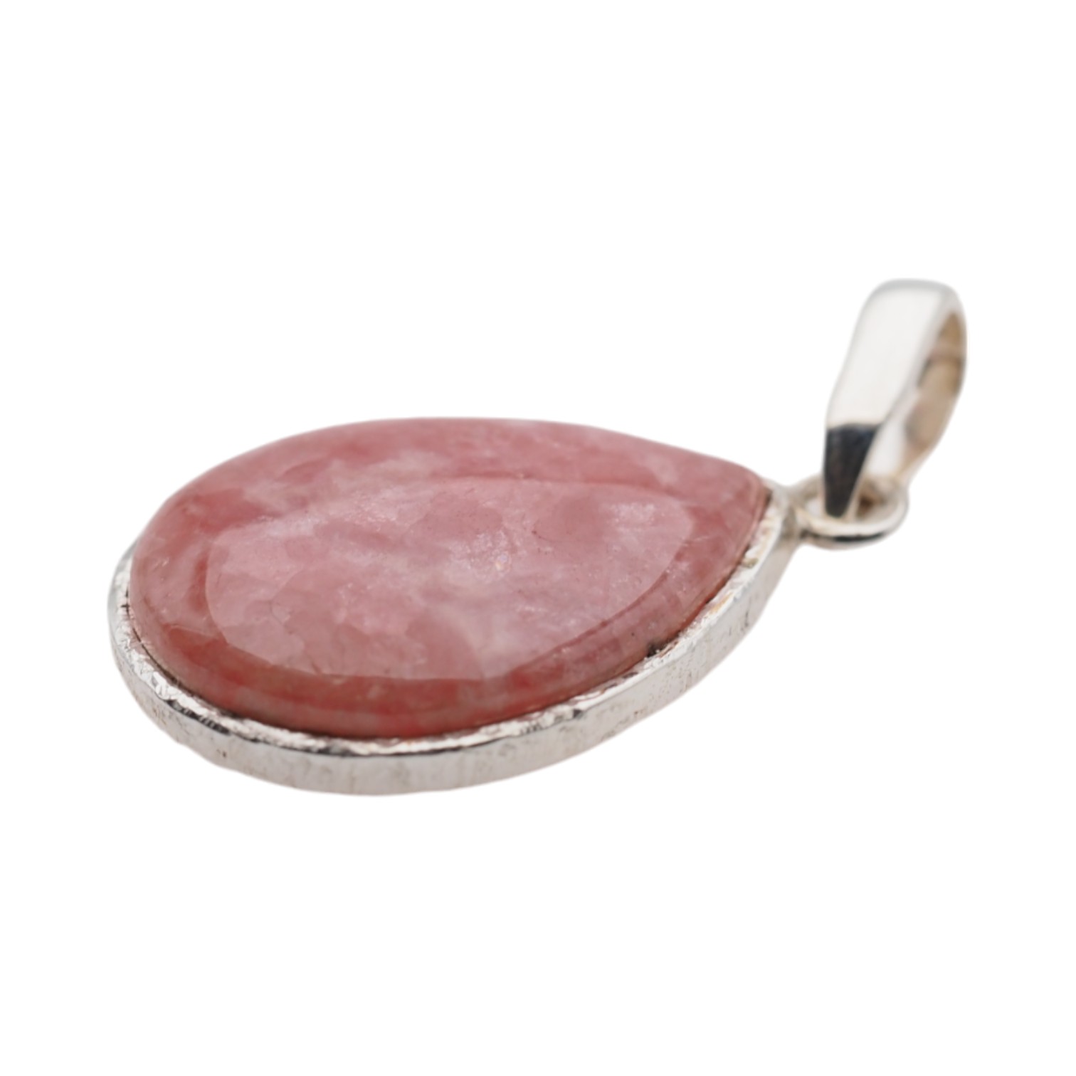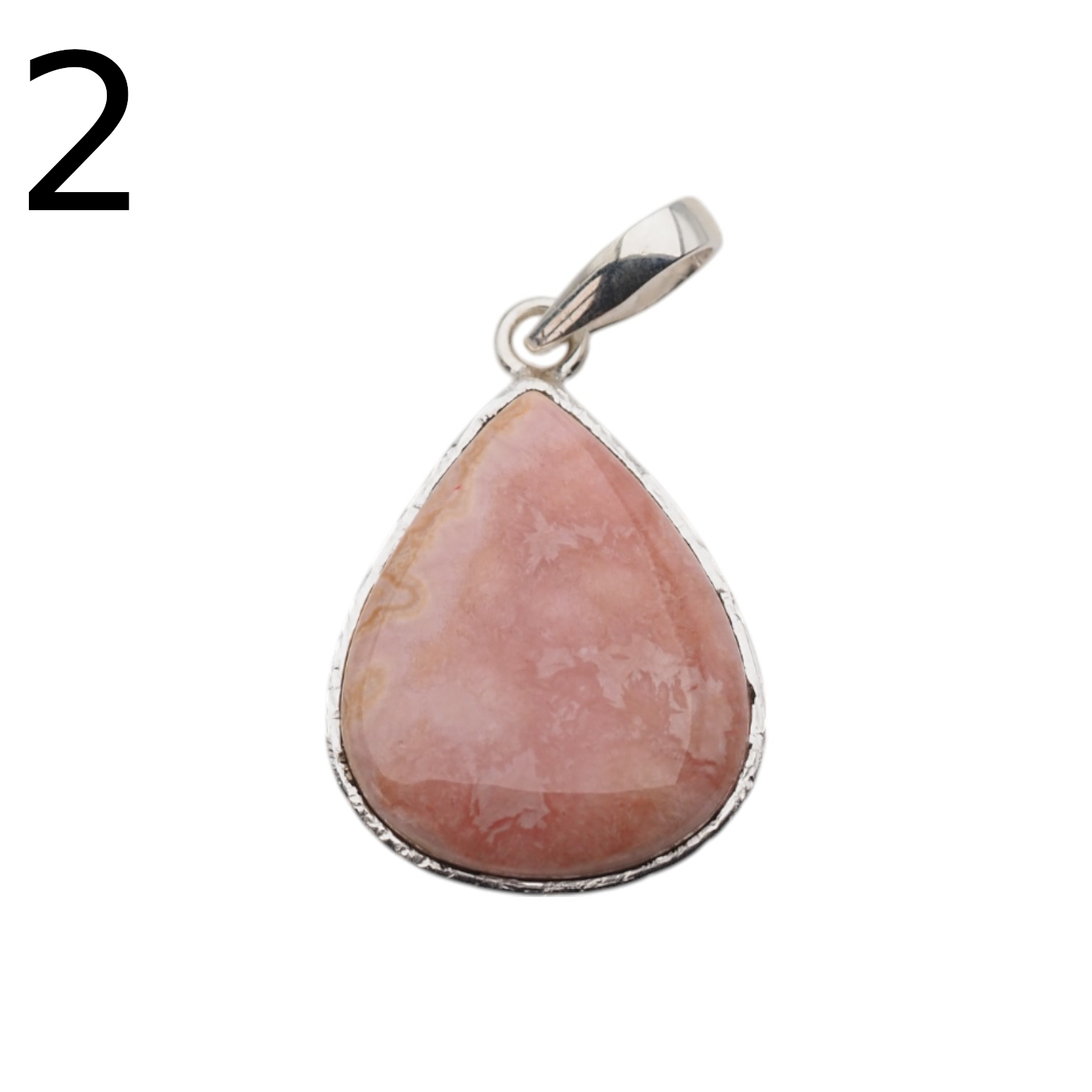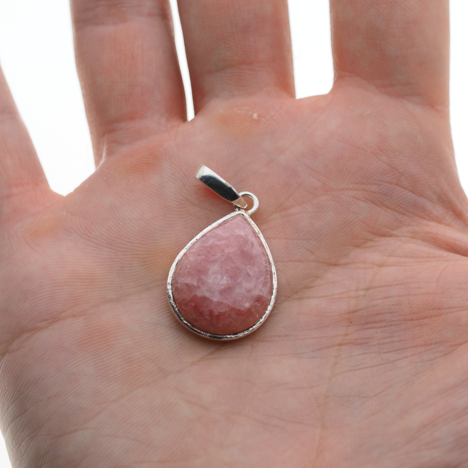Ręcznie wykonana zawieszka z rodochrozytem w kształcie łzy przyciąga uwagę ciepłą, różowo-malinową kolorystyką kamienia. Całość osadzono w srebrnej oprawie o młotkowanym wykończeniu, które dodaje biżuterii subtelnej faktury i rzemieślniczego charakteru.