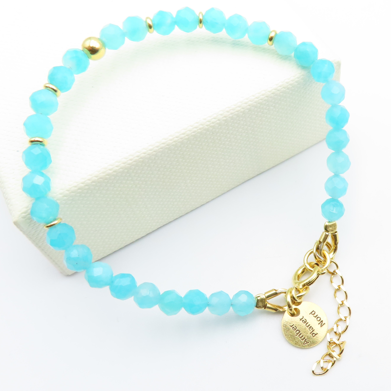 Bransoleta z amazonitem fasetowanym to delikatna, świetlista forma biżuterii, w której naturalne kamienie w kształcie drobnych kulek subtelnie odbijają światło. Całość dopełniają elementy ze srebra złoconego próby 925, nadające kompozycji ciepły, elegancki akcent.