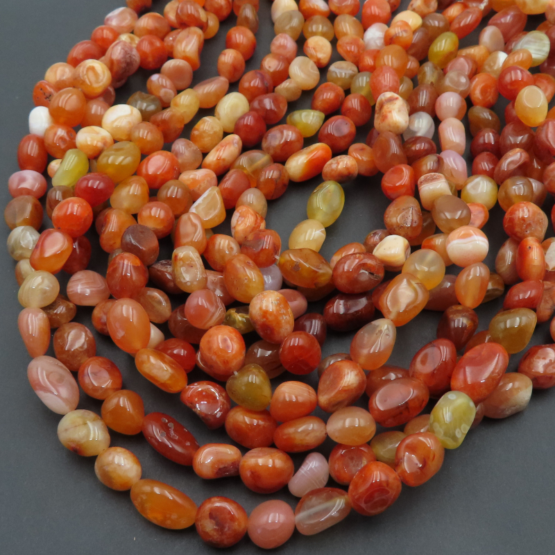 Agat czerwony w formie nieregularnych pastylek to kamień o intensywnej, ognistej barwie, która przyciąga wzrok i nadaje biżuterii charakteru. Każdy element ma unikalne przejścia kolorów – od głębokiej czerwieni po ciepłe odcienie brązu i pomarańczu. Kamienie są polerowane, co podkreśla ich naturalny połysk oraz zróżnicowaną strukturę. Sznur o długości ok. 38 cm stanowi doskonały materiał do tworzenia biżuterii o mocnym, eleganckim akcencie.