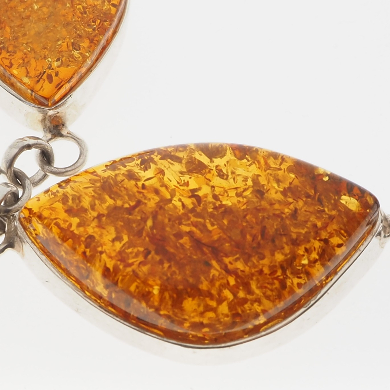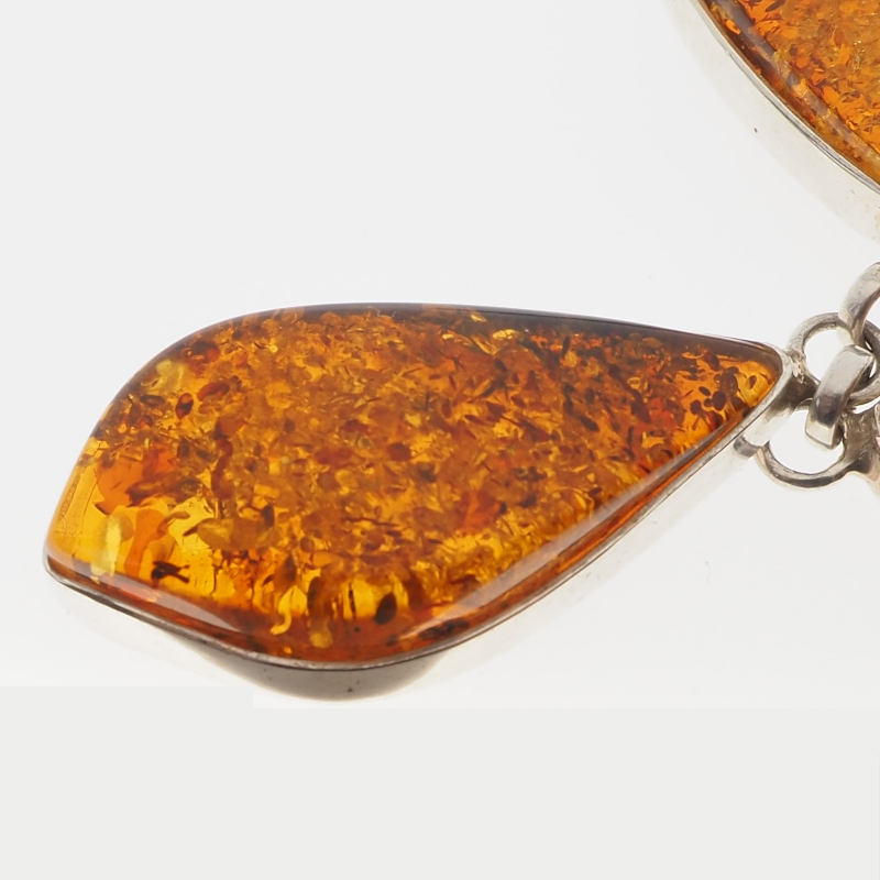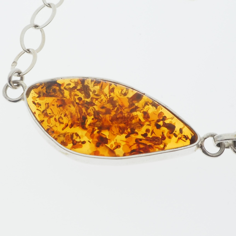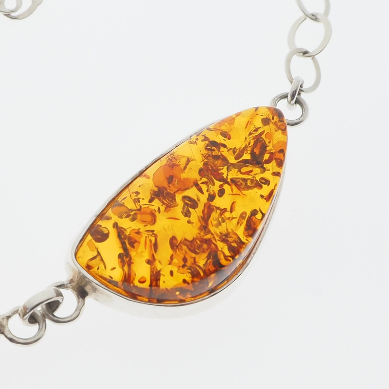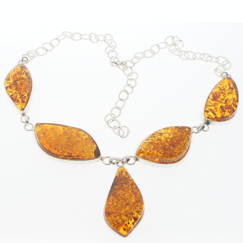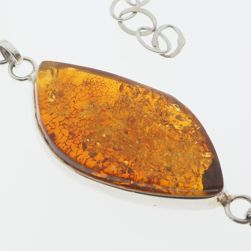 Naszyjnik srebrny z bursztynem koniakowym przyciąga wzrok ciepłym, miodowo-brązowym kolorem i dekoracyjnym rysunkiem wewnątrz kamienia, określanym jako „łuski”. Bursztyn został osadzony w srebrnej oprawie, co podkreśla jego naturalny charakter i nadaje całości eleganckie, jubilerskie wykończenie.